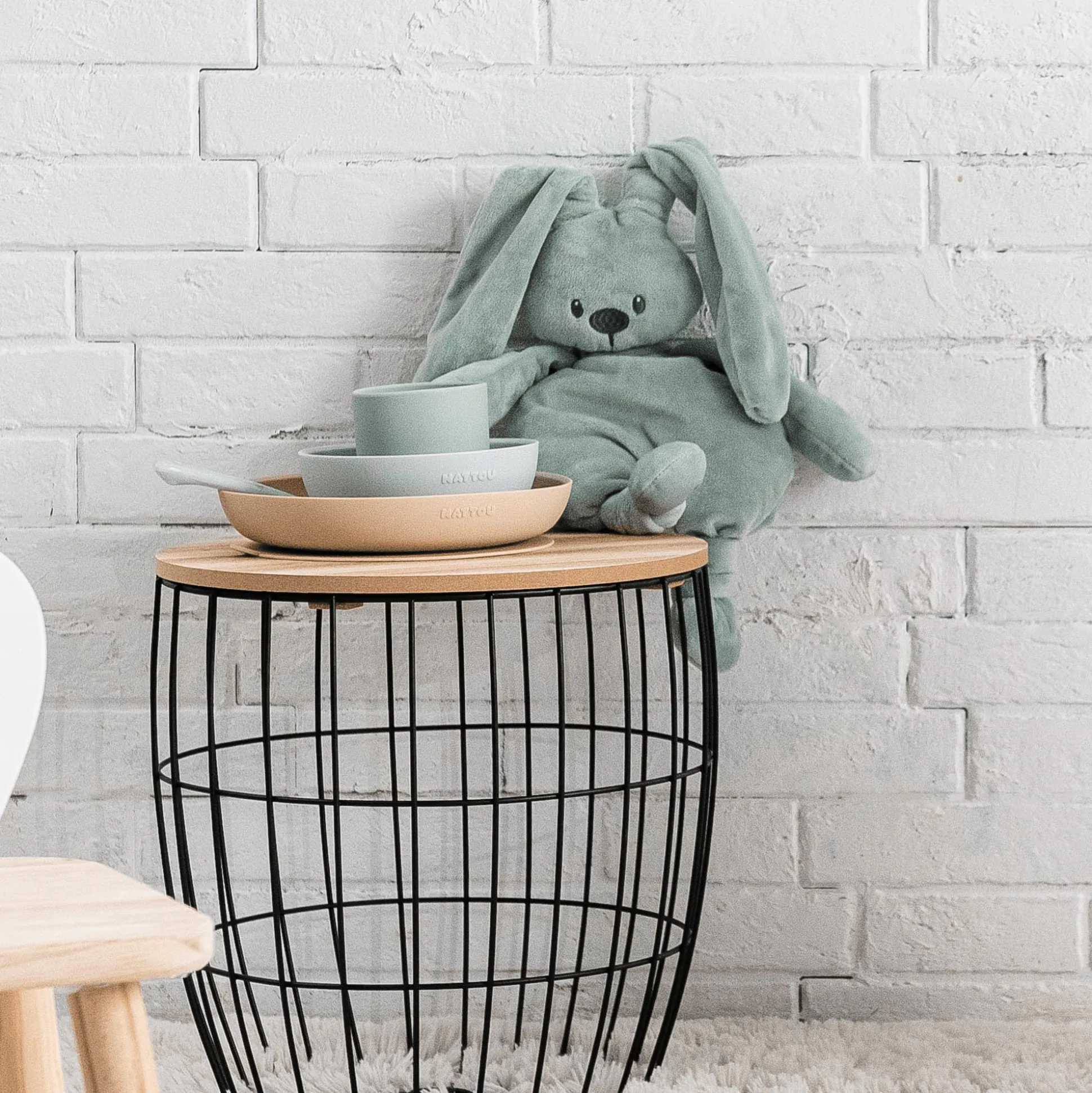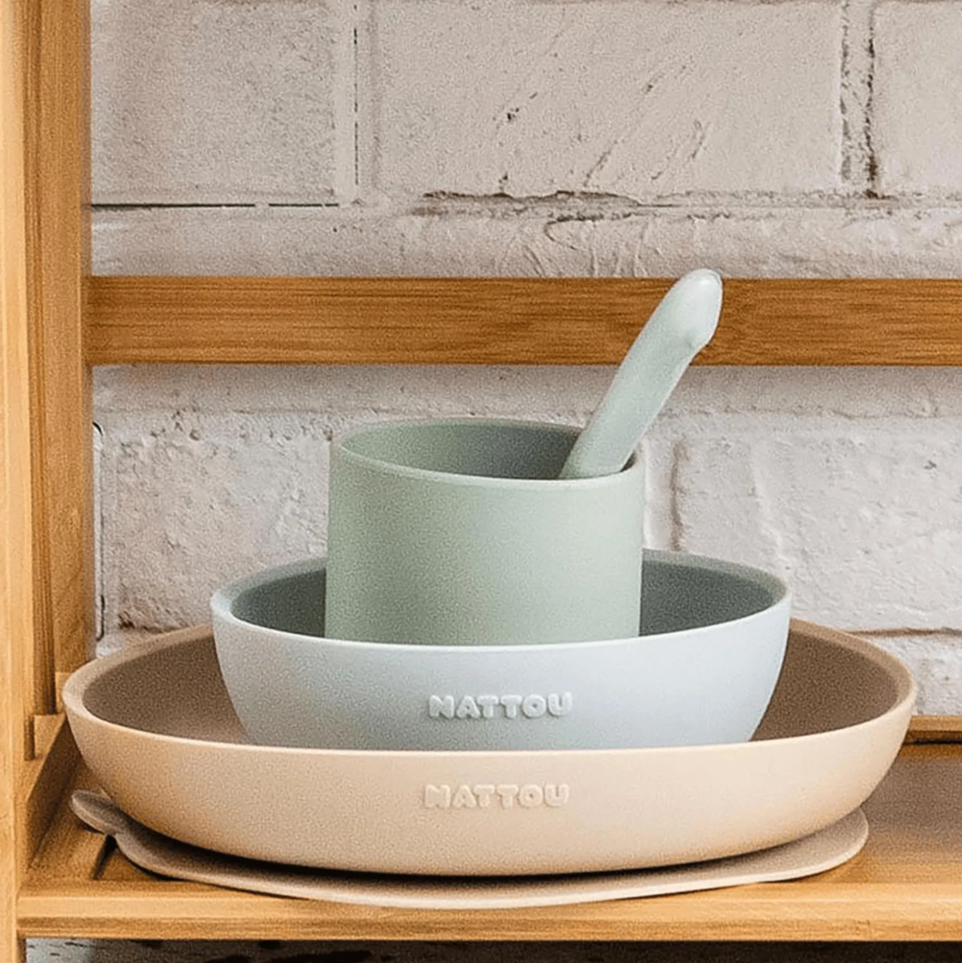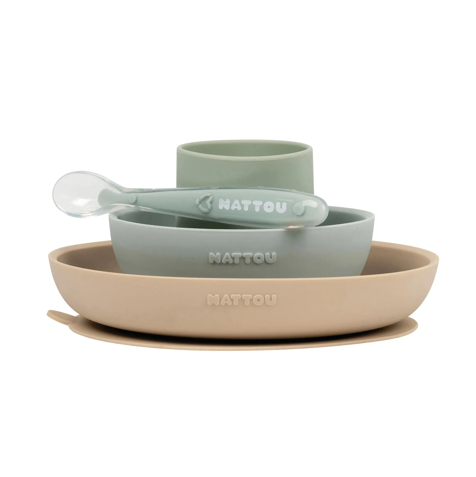 Mit dem eleganten Nattou Silikongeschirr-Set kannst Du mit deinem Kind unbesorgt gemeinsam essen und genießen. Der erhöhte Rand und ein Saugnapfboden verhindern, dass das Essen auf den Boden fällt.