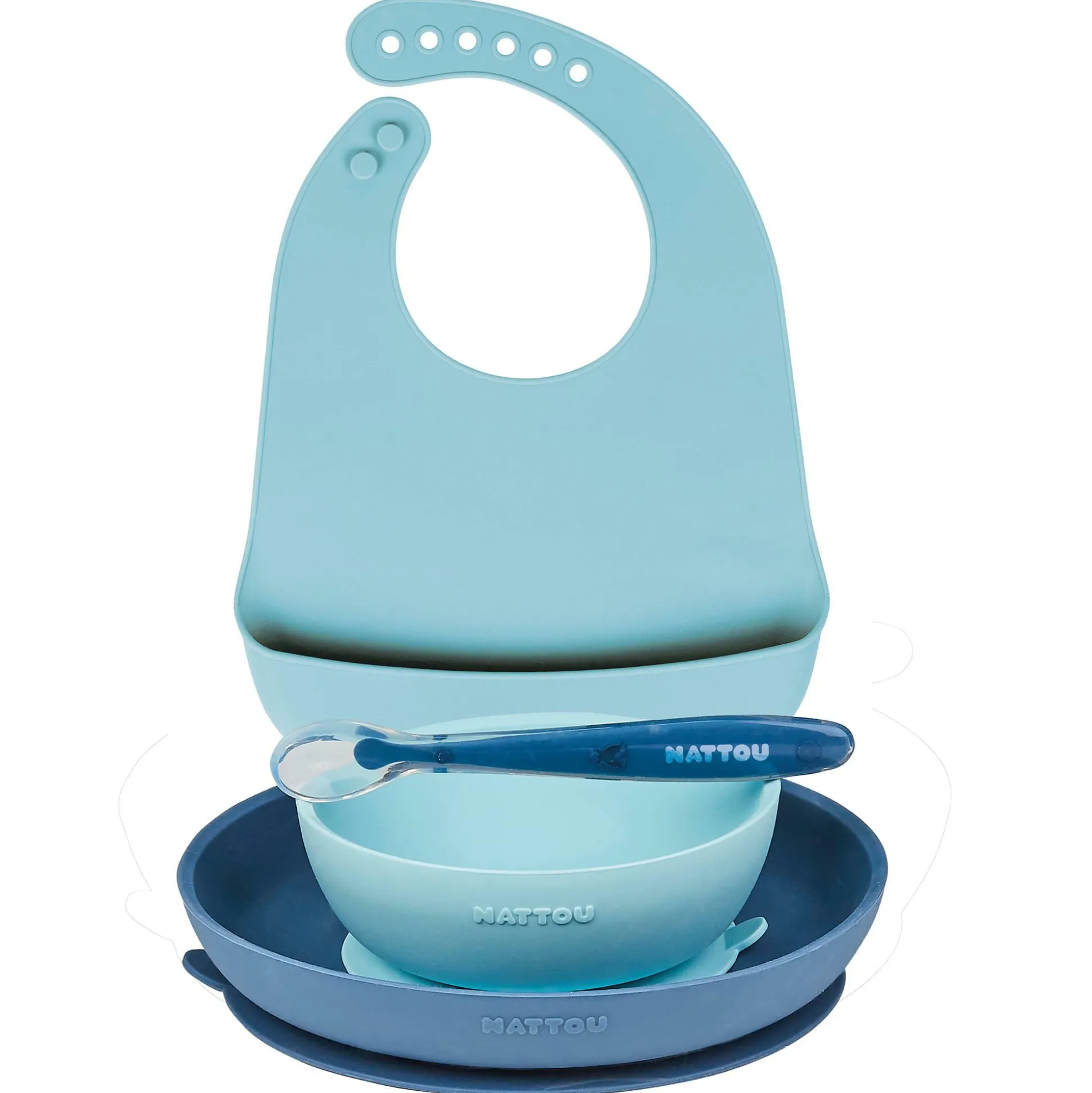 Ganz gleich, ob du dein Baby noch fütterst oder ob dein kleiner Schatz bereits die ersten Versuche zum Alleinessen macht: Das Esslern-Set von Nattou empfiehlt sich für alle Familien mit Baby oder Kleinkind, die in entspannter Atmosphäre die gemeinsamen Mahlzeiten genießen wollen.Erstens, weil das BPA-freie Kindergeschirr, -besteck und Lätzchen aus wunderbar weichem Silikon gefertigt ist und eine entsprechend samtene Haptik bietet. Zweitens, weil das Geschirr nicht nur unzerbrechlich, sondern auch rutschfest ist, da sowohl Teller als auch Schüssel über einen speziellen Saugnapfboden verfügen. Drittens, weil sich das Geschirr sogar zum Erwärmen der Speisen in der Mikrowelle eignet, ohne selbst heiß dabei zu werden. Viertens, weil der Kinderlöffel ideal für den kleinen Kindermund ist – und der Griff perfekt geformt für kleine Kinderhände. Fünftens, weil das Lätzchen in sechs verschiedene Größen verstellbar ist und dadurch mit deinem Kind mitwächst. Sechstens, weil sämtliche Teile nach Gebrauch einfach in der Spülmaschine gereinigt werden können. Siebtens, weil das stapelbare Geschirr bei Nichtnutzung einfach ineinandergestellt und platzsparend verstaut werden kann – so dass es sich auch zum Reisen empfiehlt. Und achtens, weil das ästhetische Design in fröhlicher Farbgebung selbst optisch für gute Laune sorgt.
