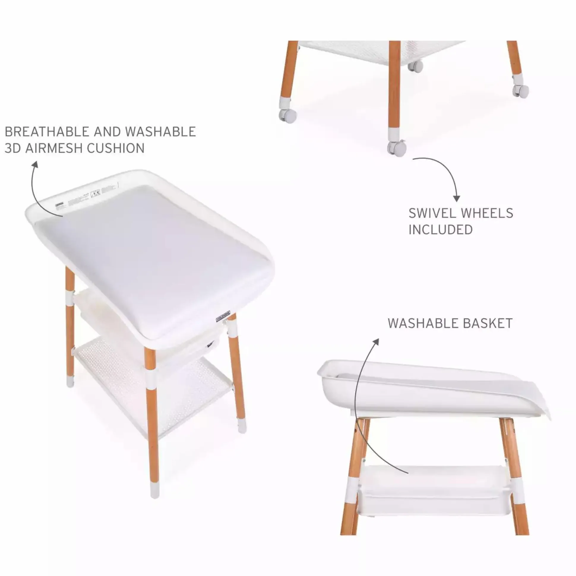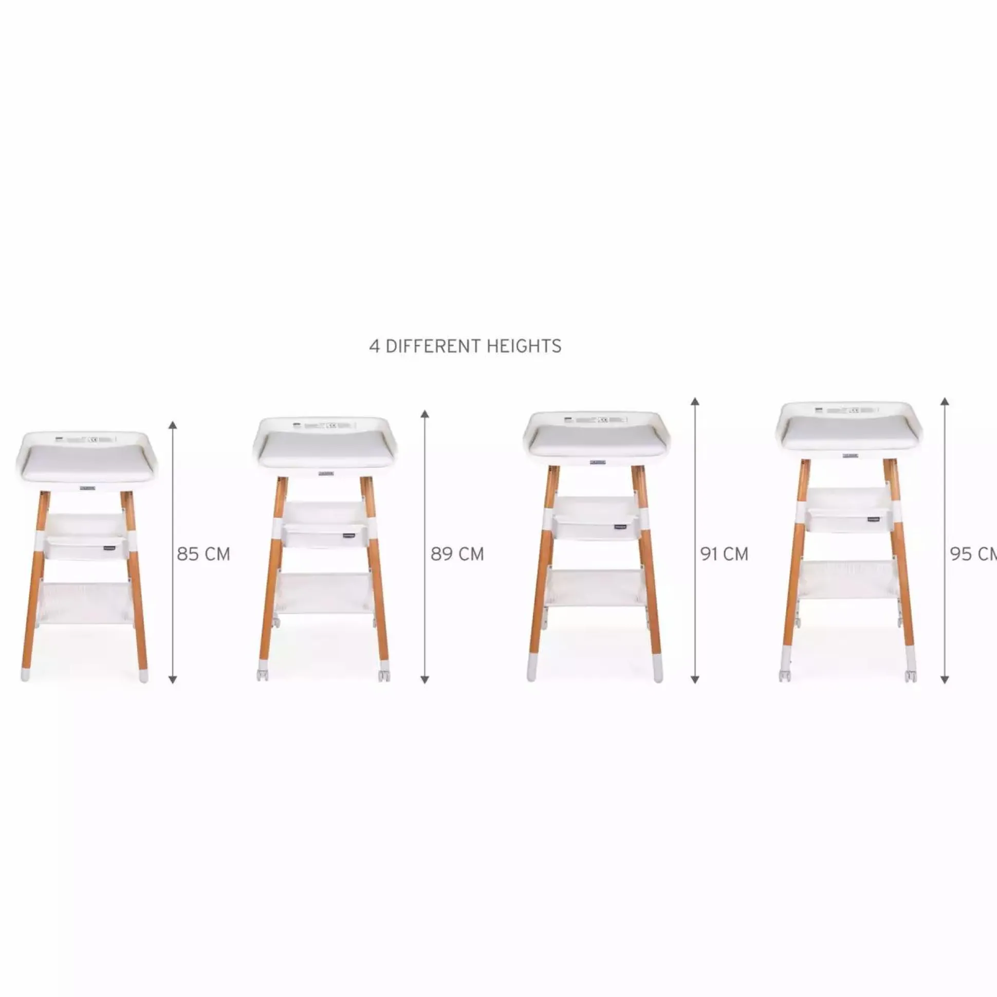 Du kannst den Evolux in vier verschiedene Höhen einstellen. Außerdem kann der Wickeltisch dank der Rollen mit Bremssystem einfach von Raum zu Raum geschoben werden. Der große Ablagekorb bietet dir dabei genug Stauraum für alle Utensilien die du zum Wickeln benötigst.