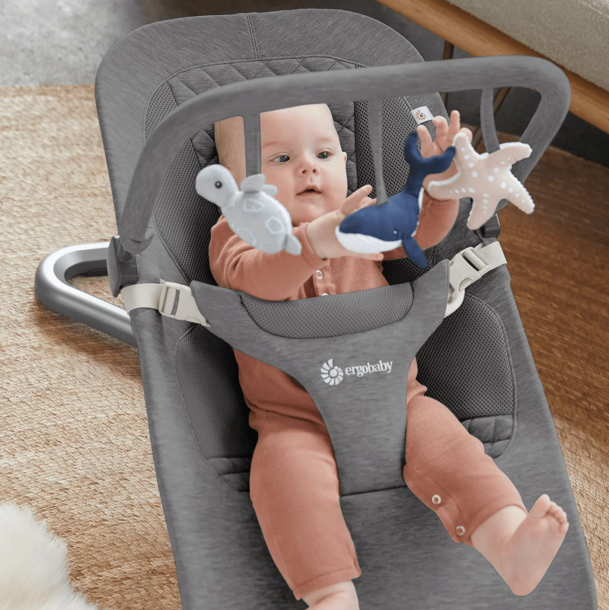 „Unter dem Meer“ mit dem Evolve Bouncer Spielbogen Wunder der Ozeane von ERGObaby – der perfekte Begleiter für deinen kleinen Entdecker. Die niedlichen, plüsch-weichen Meeresbewohner, Blauwal, Seestern und Schildkröte, helfen deinem Baby, die Umgebung mit allen Sinnen zu erkunden. Sie laden zum Greifen ein, wobei sie bei Berührung knistern oder rasseln. So werden die motorischen Fähigkeiten sowie die auditive Wahrnehmung gefördert.