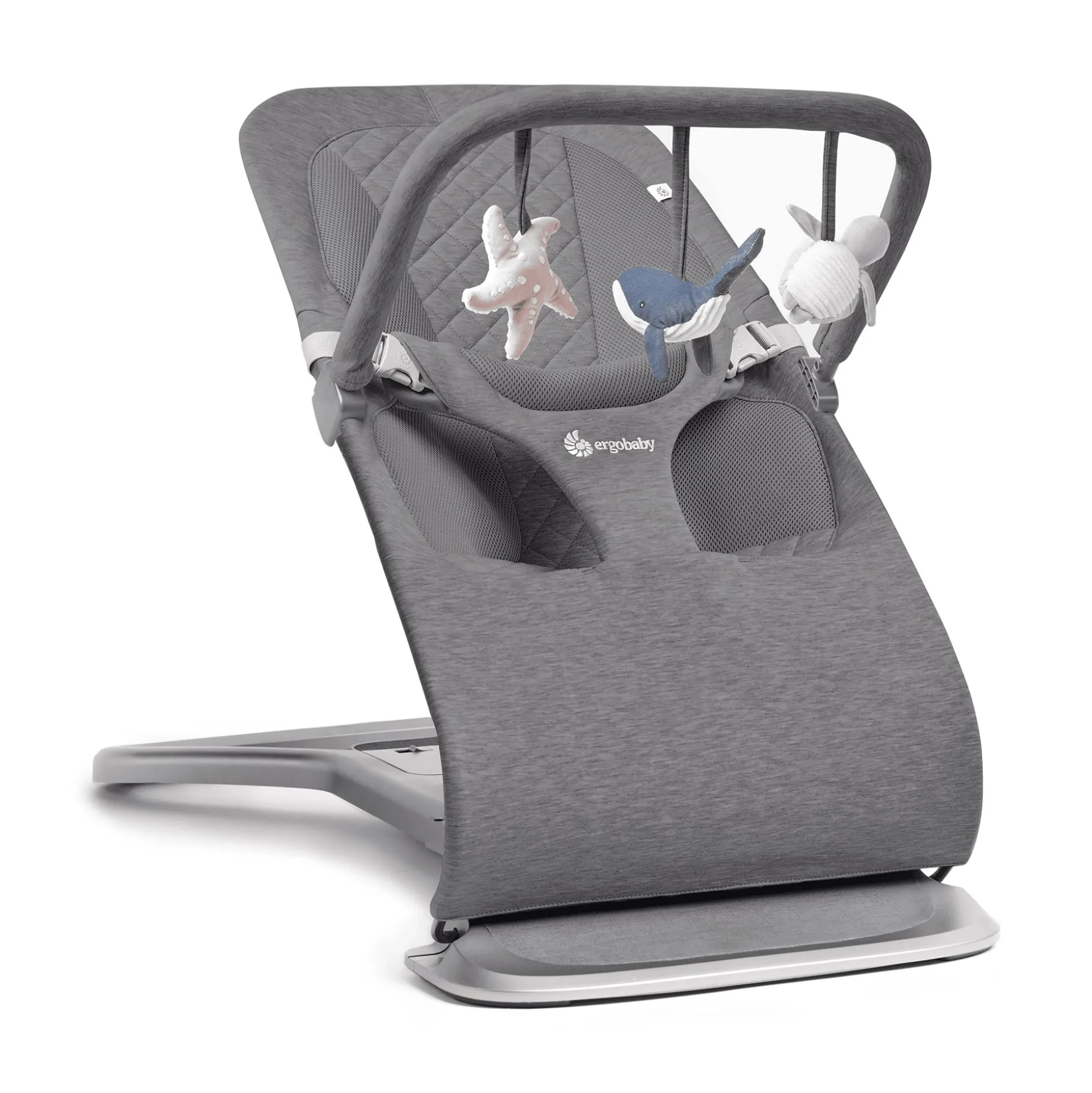 Doch damit sich dein Liebling an den kleinen Unterwasserfreunden erfreuen kann, benötigt der Spielbogen ein passendes ‚Schiff‘. Hier nimmt ERGObaby den Evolve 3-in-1 Bouncer ins Visier. Der Bogen lässt sich kinderleicht an der Wippe anbringen. Damit die Wippe an dem Spielbogen nicht hochgehoben werden kann, löst sie sich auch ganz einfach wieder von dem Bouncer.