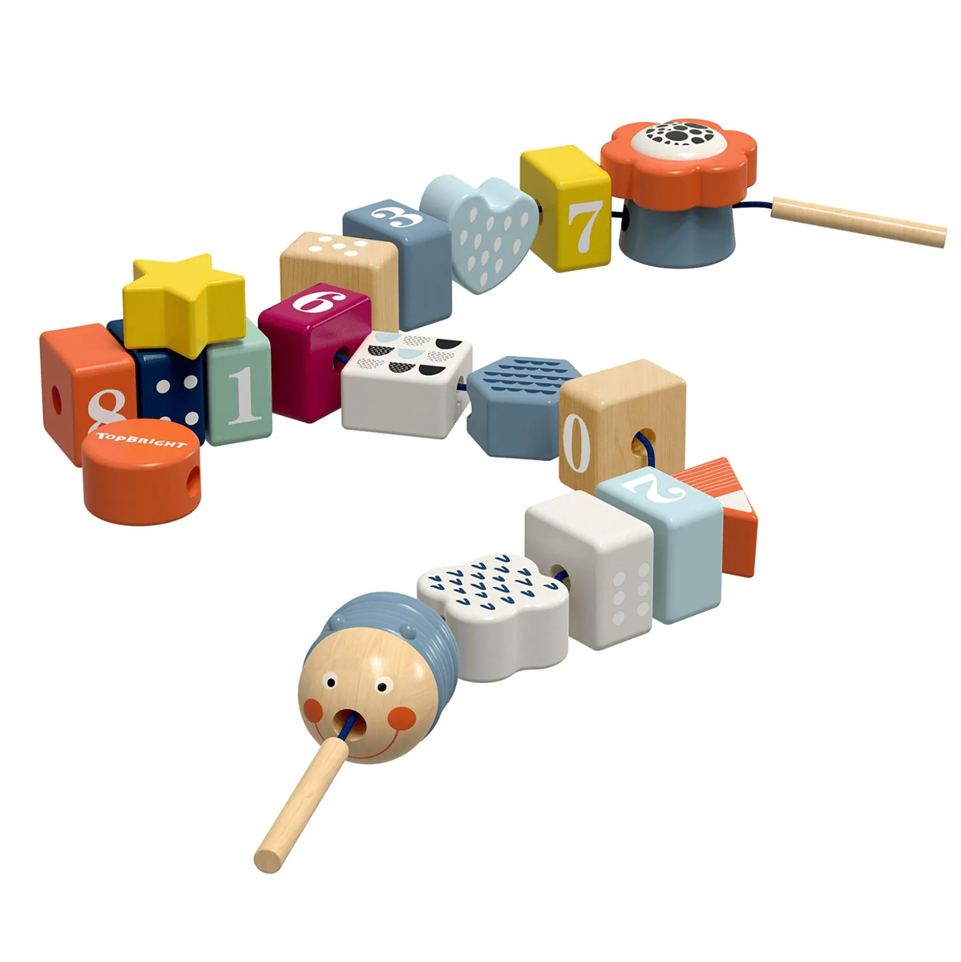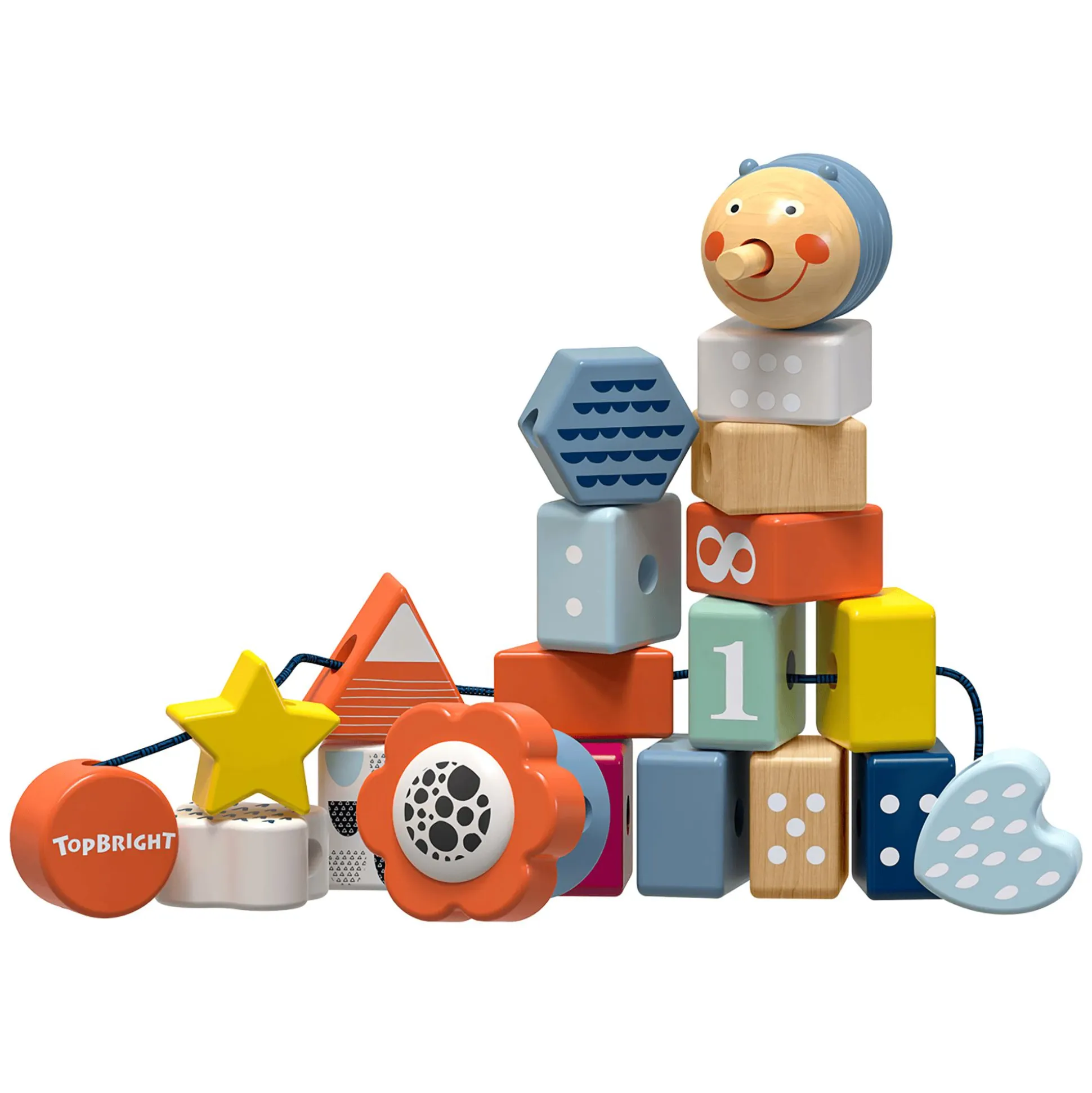 Das Fädelspiel Raupe von TOPBRIGHT ist tierisch lustig: Kleine Fädelmeister:innen ab ca. 18 Monaten ziehen nach und nach Bausteine aus Holz in verschiedenen Farben und Formen auf eine Schnur auf und sehen zu, wie dabei eine bunte Raupe wächst und immer größer wird. Beim Fädeln schulen sie ganz nebenbei ihre Fingerfertigkeit und ihre Feinmotorik.Ob Stern, Herz, Dreieck oder Kreis – Kleinkinder entdecken beim Spielen die unterschiedlichsten Formen und Farben und lernen ganz nebenbei neue Wörter. Auch zum Zahlen üben eignet sich das Spiel ideal: Auf den Bausteinen ist auf der Vorderseite jeweils eine Zahl zu sehen, auf der Rückseite befindet sich die entsprechende Anzahl an Punkten. So können große und kleine Fädelmeister:innen spielerisch das Zählen lernen und üben. Die Bausteine in trendigen Unisex-Farben regen Kleinkinder zum Spielen und Bauen an.Die Bausteine sind auch optimal zum freien Spielen geeignet: Kleine Architekt:innen erschaffen nach Lust und Laune aus den farbenfrohen Holzbausteinen Türme, Häuser oder Blumen – der Fantasie sind dabei keine Grenzen gesetzt.