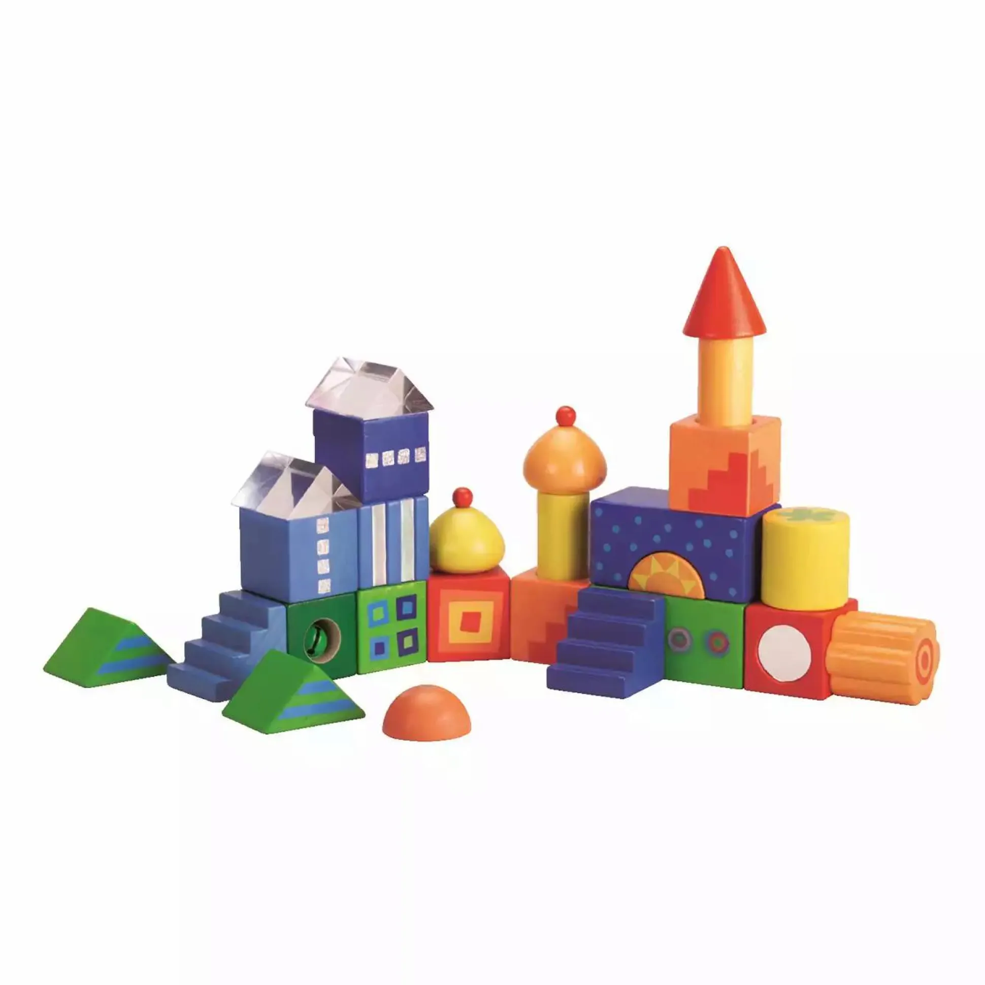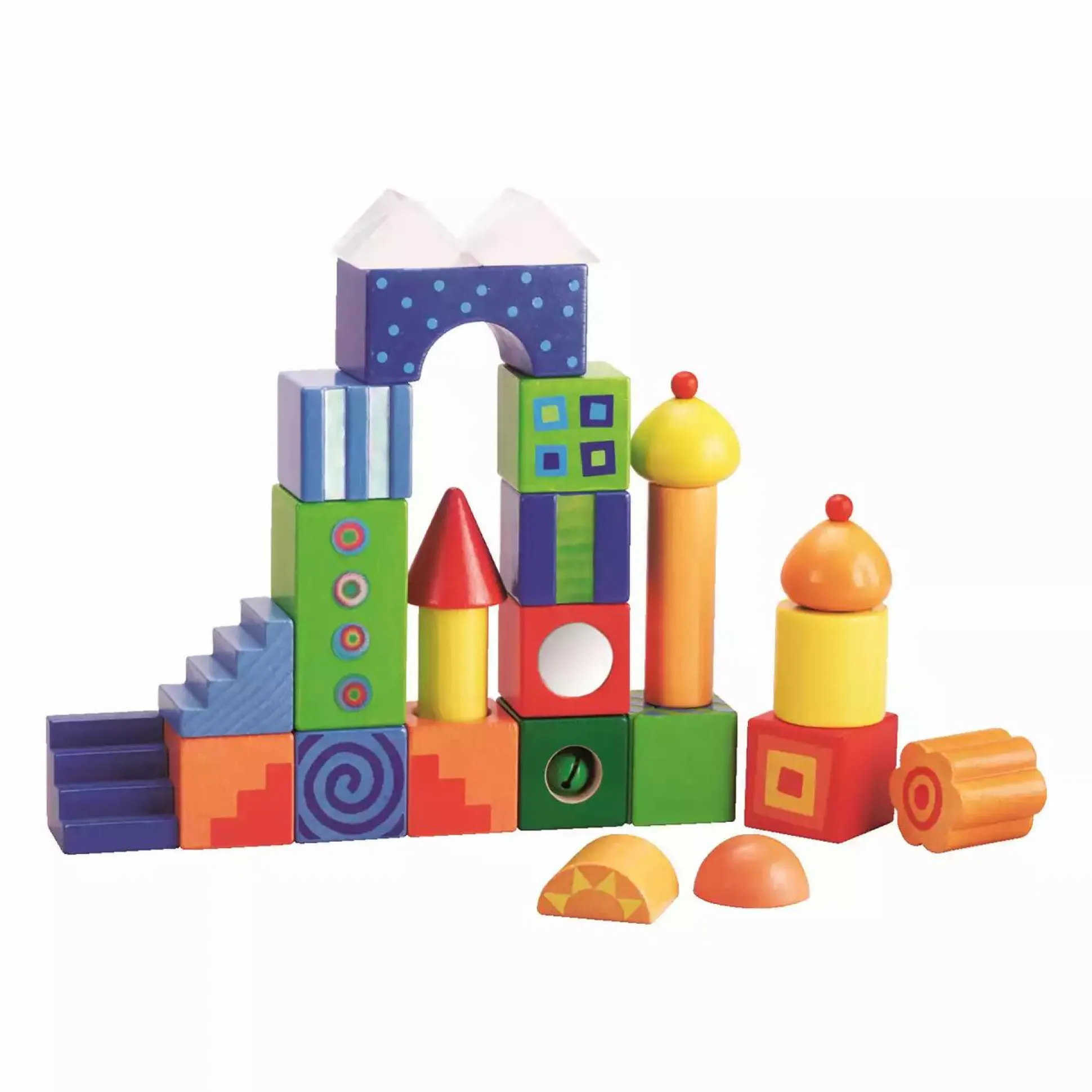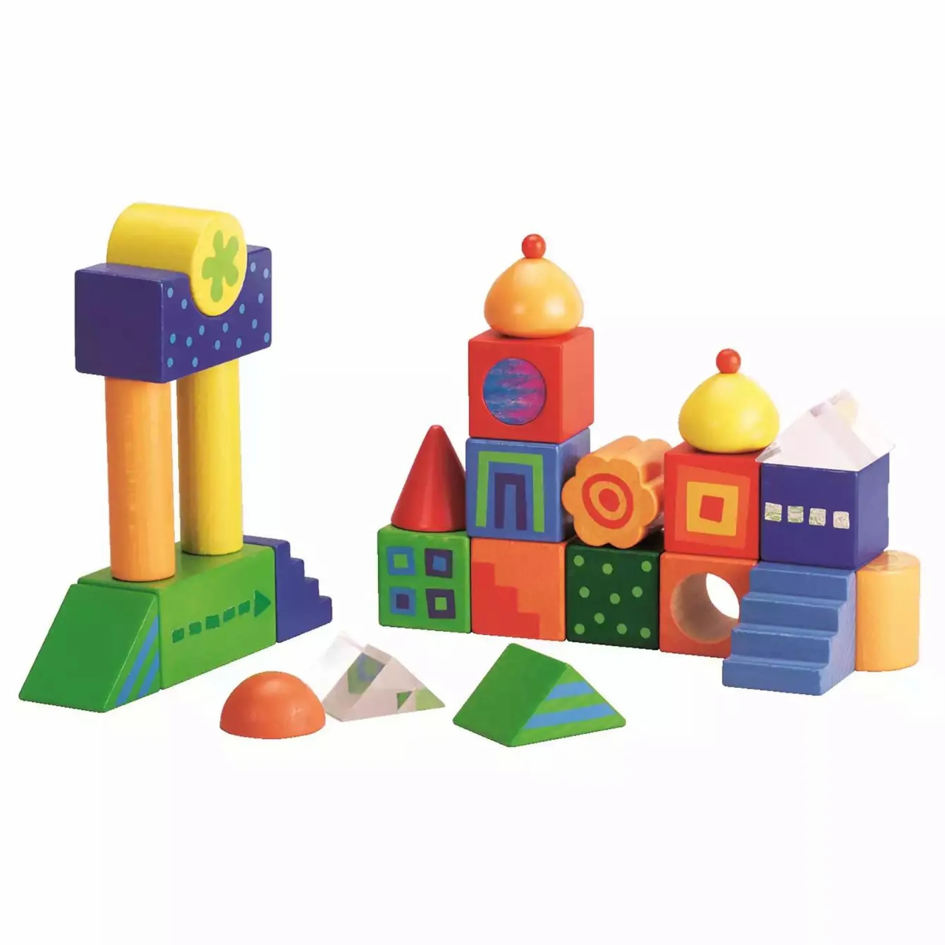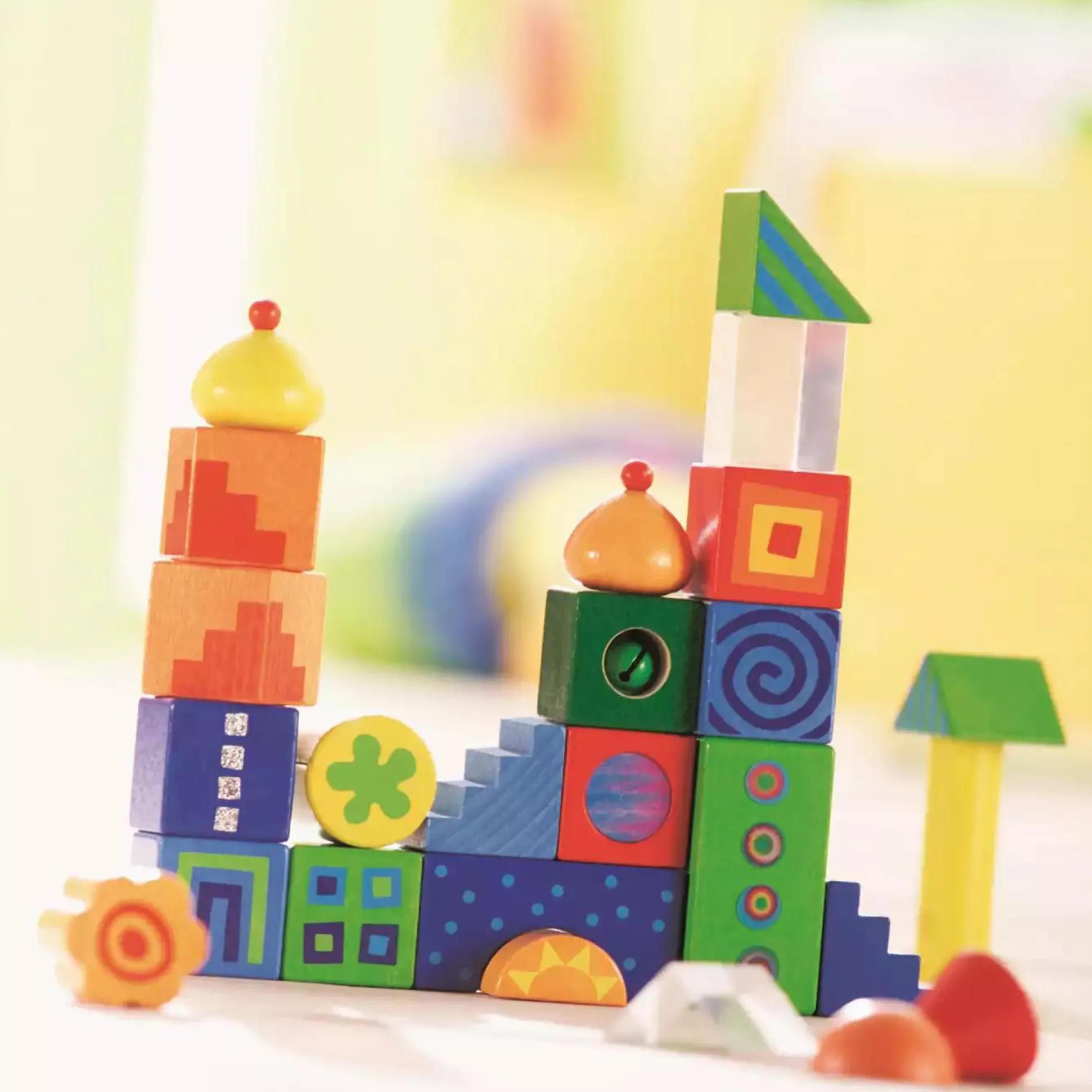 Die HABA-Fantasiesteine werden dein Kind mit ihren optischen, akustischen und haptischen Effekten faszinieren. Ob Spiegel- oder Glitzereffekt, Glöckchen oder spannende Formen – hier sind alle Sinne gefragt! Als Bausteine verwandeln sie mit ihren leuchtenden Farben und Mustern erste Bauwerke in kleine Kunstwerke. Ein kunterbuntes Hochhaus, eine kleine Stadt aus farbigen Häusern oder ein großes Schloss mit vielen Türmen – mit diesen Steinen sind der Fantasie und Kreativität von kleinen Baumeistern ab ca. 1,5 Jahren keine Grenzen gesetzt. Beim Bauen werden das genaue Schauen, die Auge-Hand-Koordination und die Feinmotorik spielerisch trainiert. In Kombination mit anderen HABA-Bausteinen können ganze Spiel-Welten mit diesen 26 bunten Fantasiesteinen entstehen.