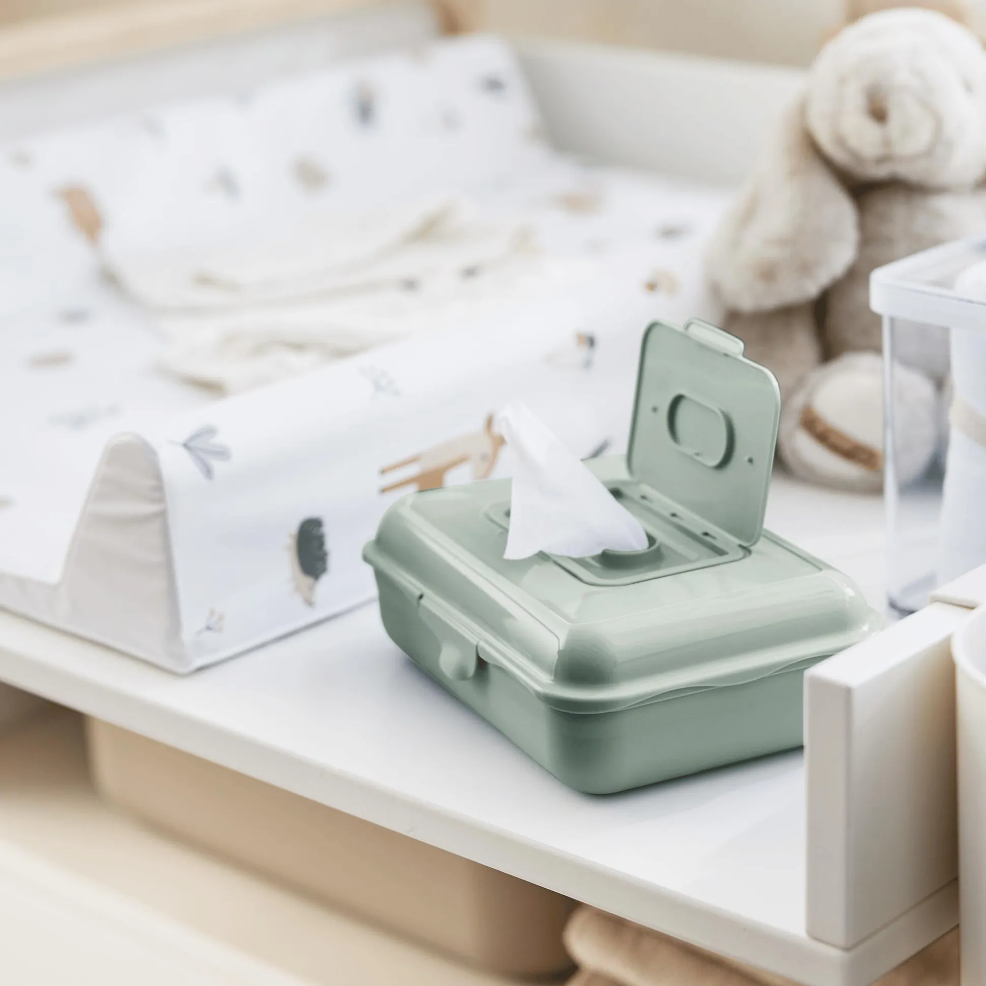 Das praktische Design ermöglicht ein bequemes und schnelles Entnehmen der Tücher mit nur einer Hand – ideal, wenn du dein Baby im Arm hältst. Kompakt und leicht passt die Box perfekt in Wickeltaschen oder auf den Wickeltisch und sorgt so immer für Ordnung und Komfort.