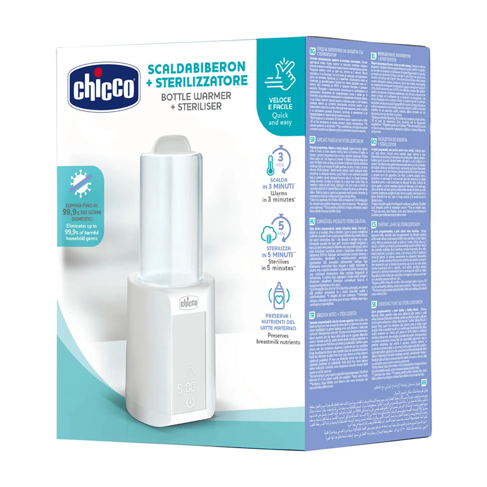 Mit dem Flaschenwärmer mit Sterilisiergerät von Chicco hast du alles, was du für eine einfache und sichere Zubereitung von Mahlzeiten für dein Kind brauchst – in einem praktischen Gerät vereint.