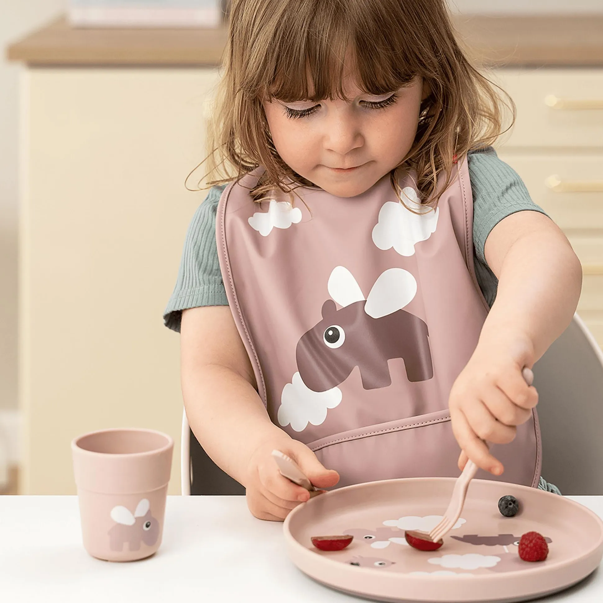 Der Happy Clouds Teller ist mit einem verspielten Happy-Wolken-Motiv bedruckt. Croco, Ozzo und Birdee erkunden die Welt zwischen den Wolken und laden dein Kind ein, neue Geschmacksrichtungen und Konsistenzen zu erleben.