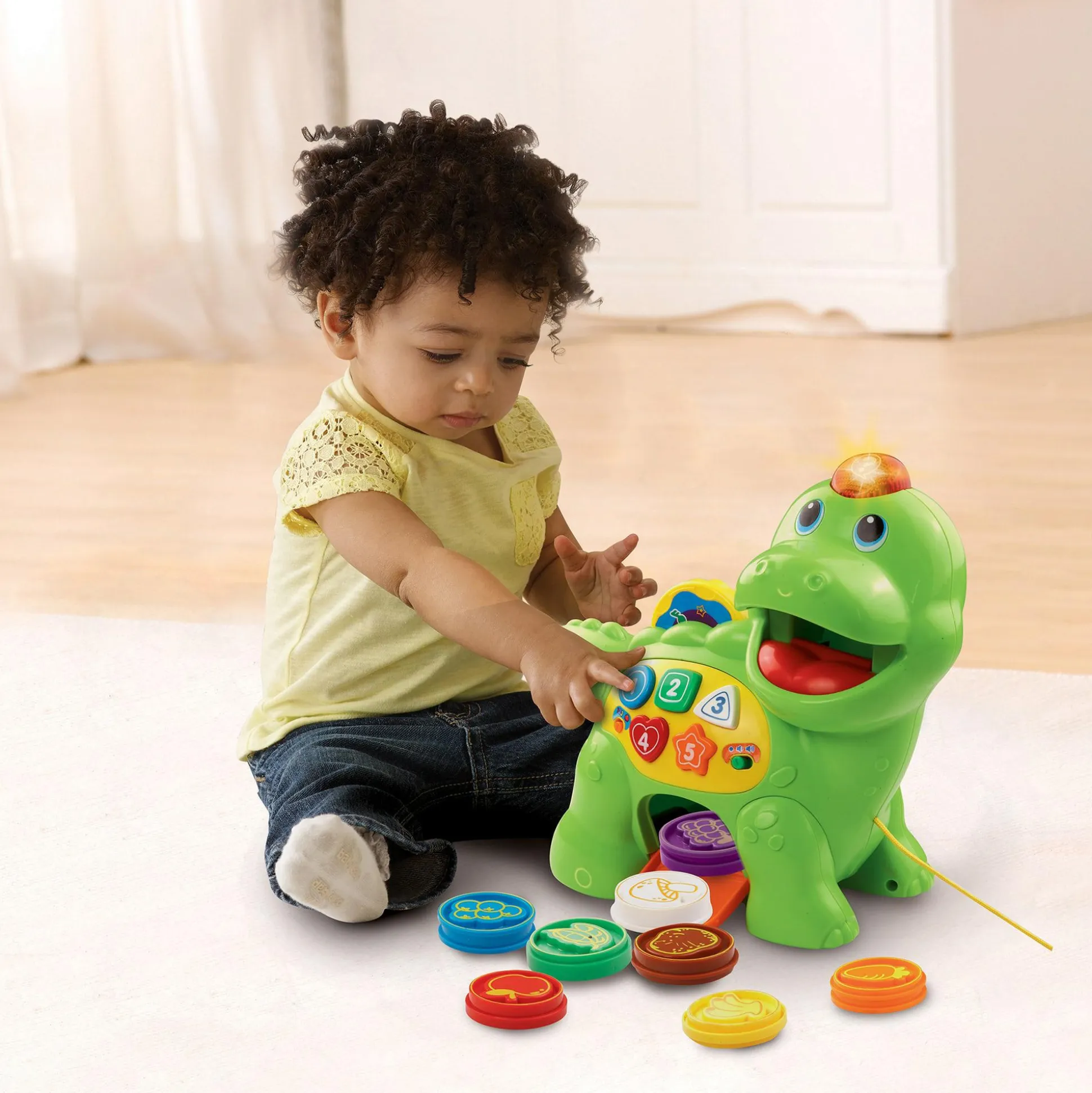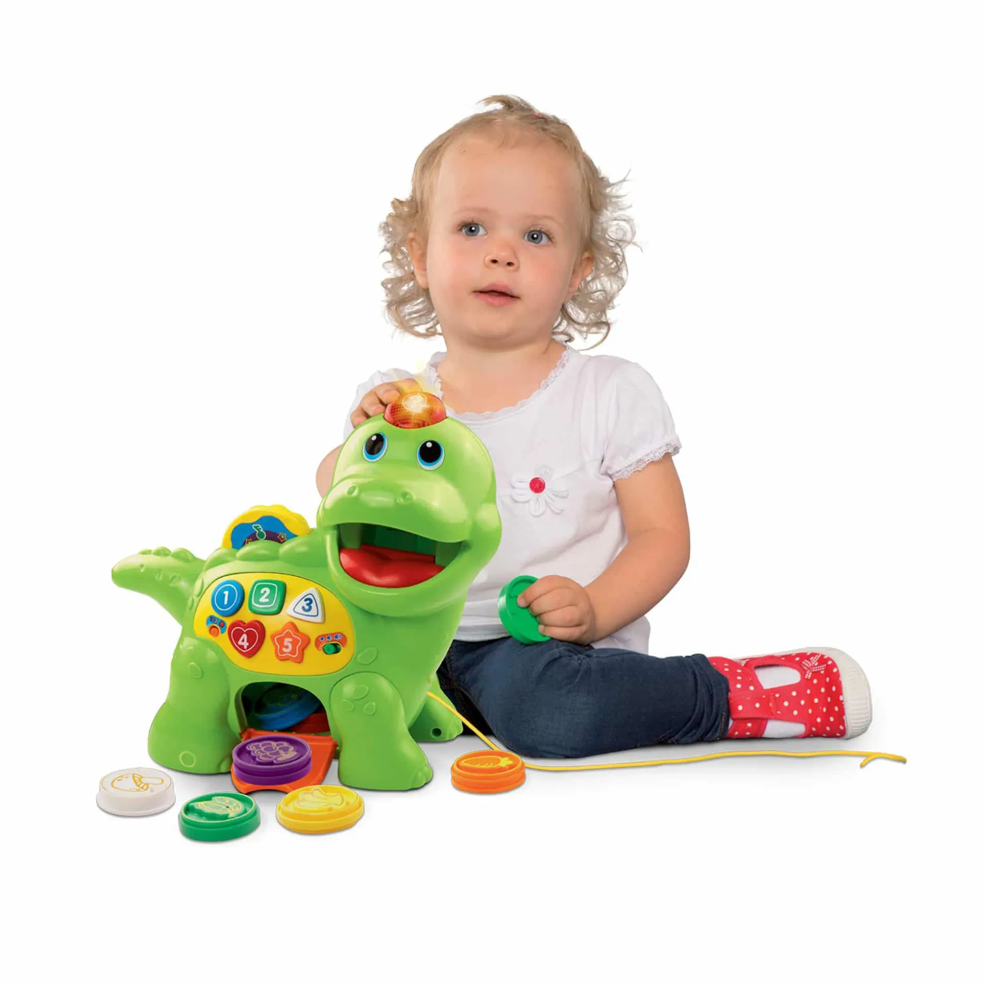 Der Fütter mich Dino von vtech ist ein fröhlicher Lernfreund für kleine Entdecker ab etwa einem Jahr. Mit seinen bunten Formen- und Zahlentasten, acht farbigen Futterchips sowie zwei spannenden Spielmodi – Zahlen und Nahrungsmittel – fördert er spielerisch das Verständnis für Farben, Formen, Zahlen sowie Obst und Gemüse. Der Dino erkennt und benennt die eingegebenen Chips, während eine leuchtende Taste auf seinem Kopf und bewegliche Räder mit Bewegungssensor für zusätzlichen Spielspaß sorgen.