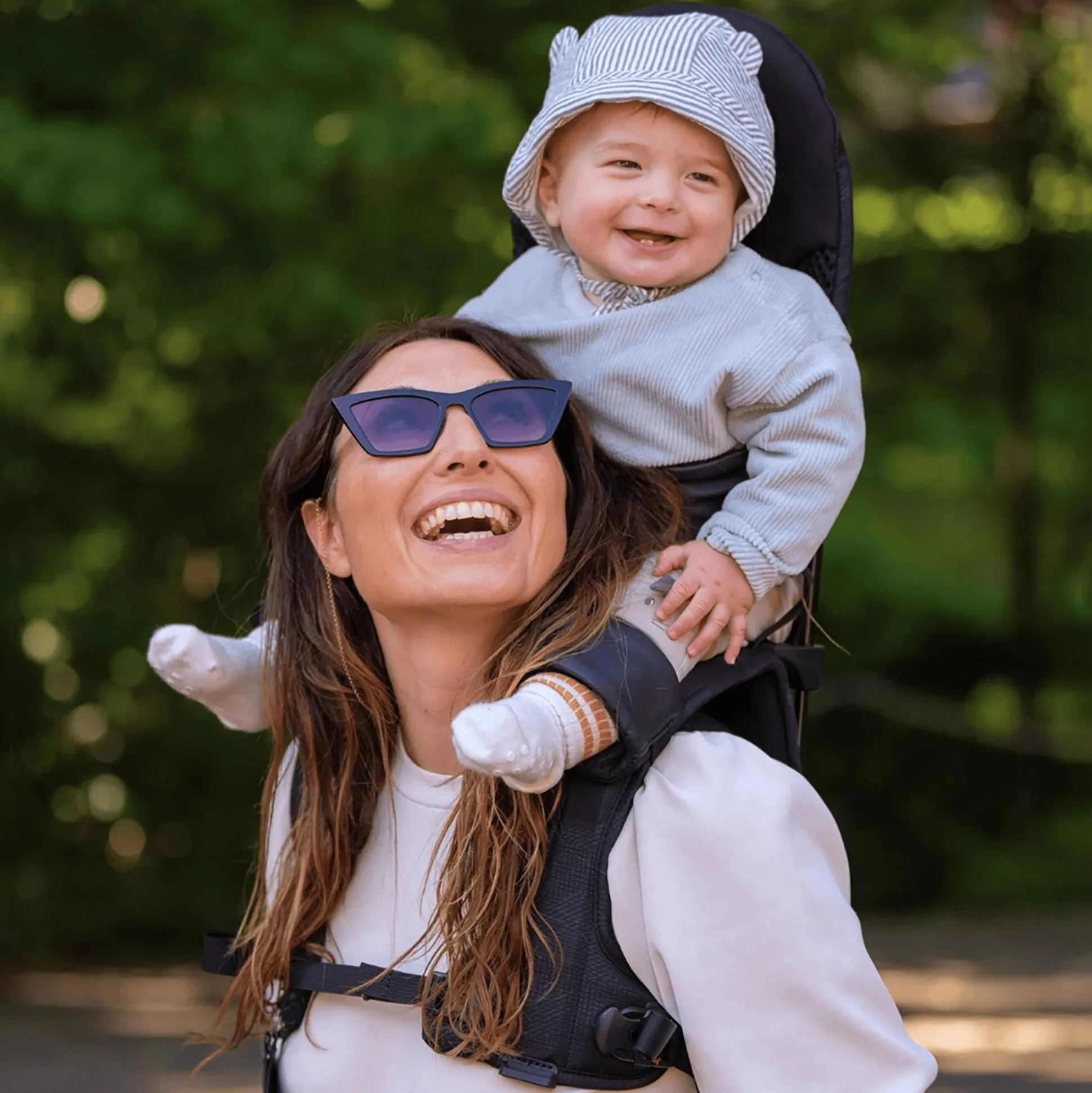 Der ergonomisch gestaltete Bogen entlastet deinen Nacken und Schultern, denn das Gewicht deines Kindes wird gleichmäßig verteilt, was längere Spaziergänge komfortabel und angenehm macht. Dein Schatz sitzt bequem auf deinen Schultern, gesichert durch einen Hüftgurt und Beinschlaufen in stilvollen Kunstlederdetails. Für die kleinsten Kinder (ca. sechs bis zehn Monate) bietet ein zusätzlicher Schultergurt extra Halt.