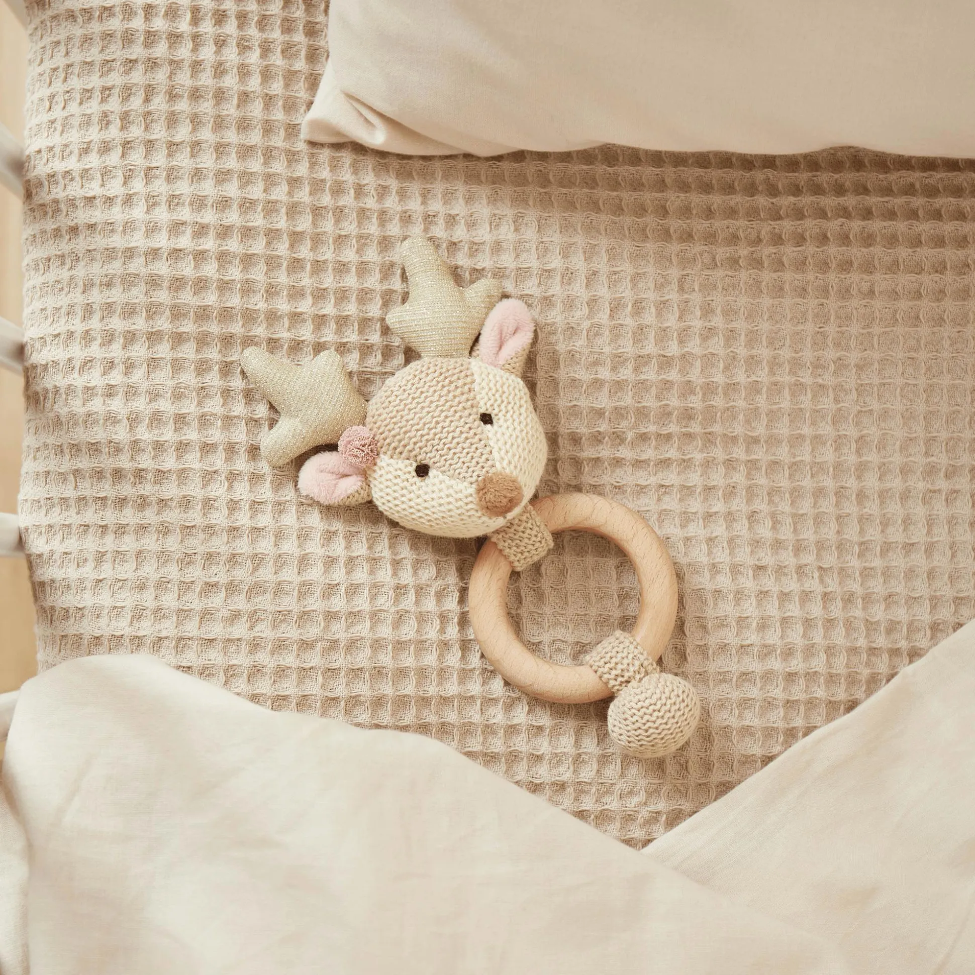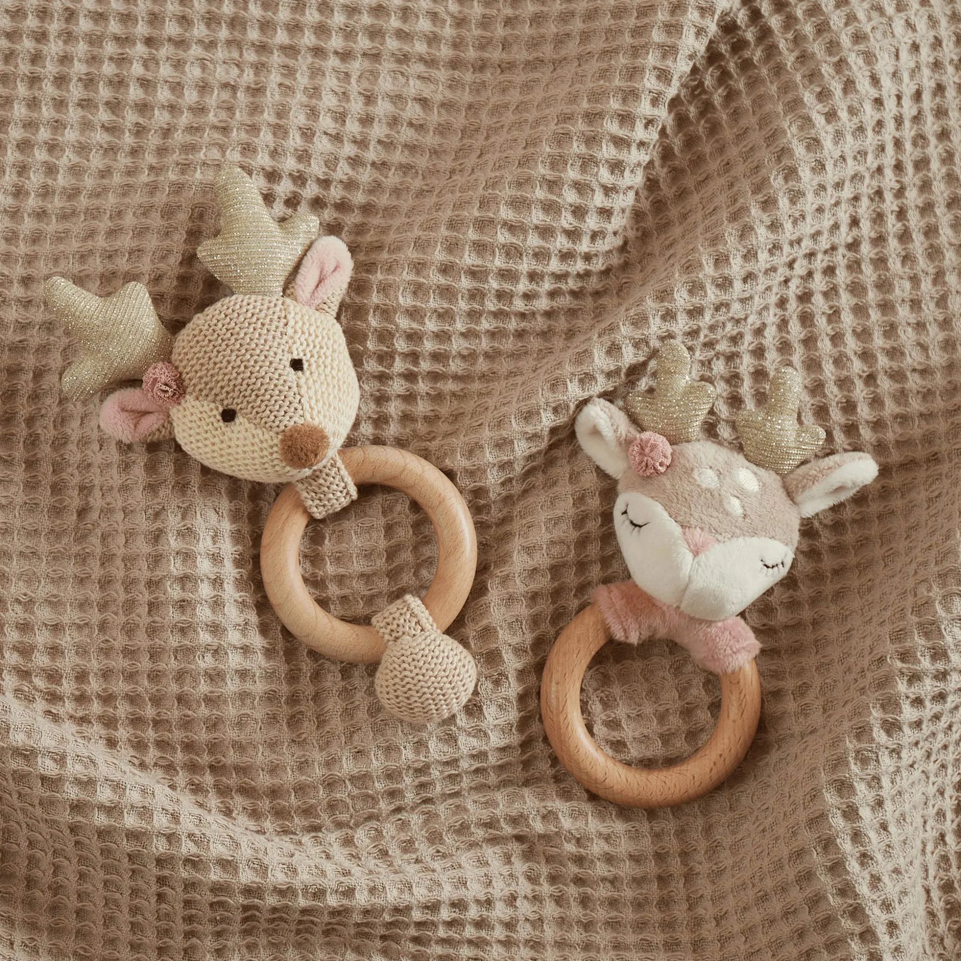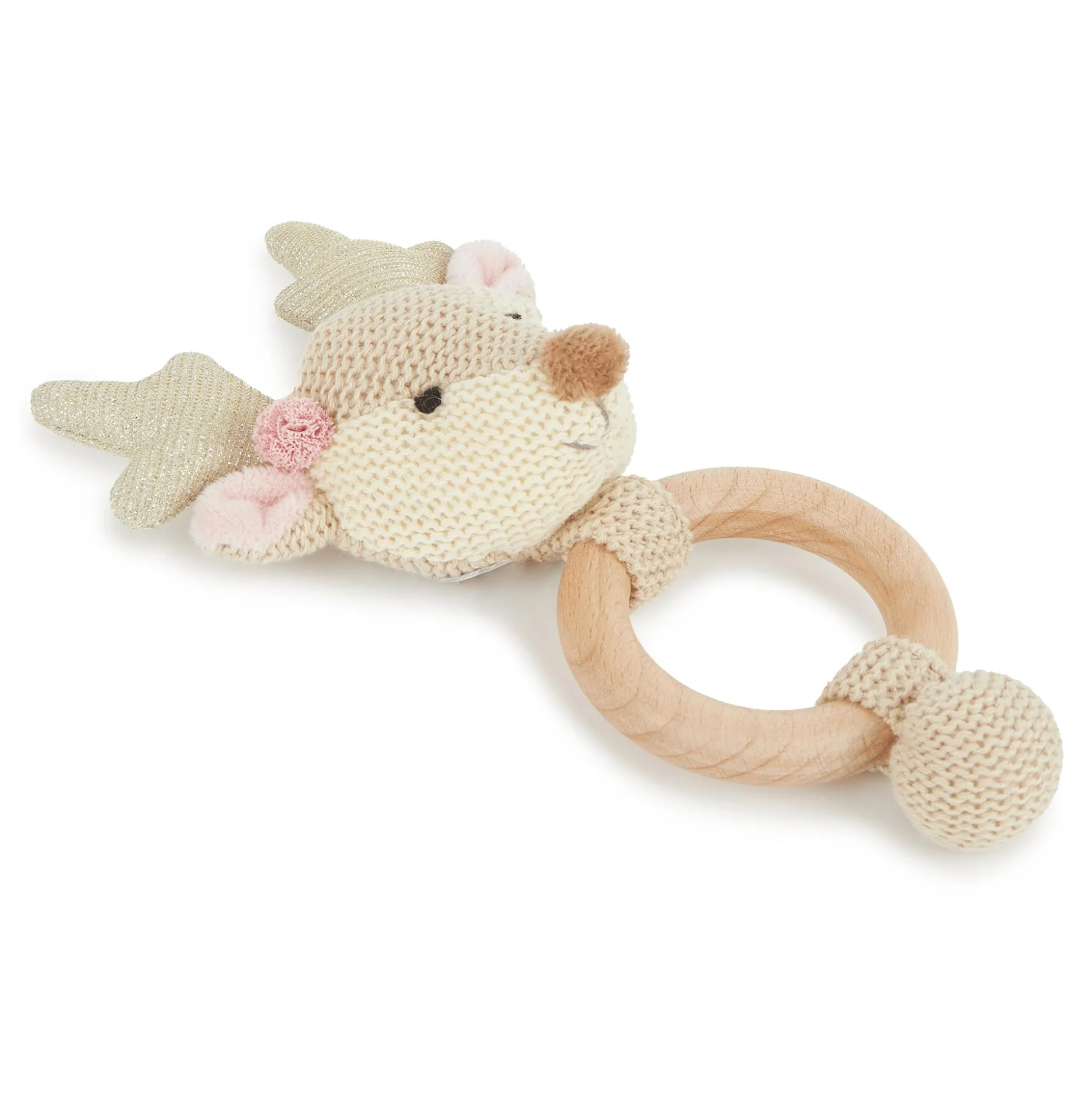Als Zahnungshilfe stärkt der Holzring den Gaumen deines Babys und hilft den Zahnungsschmerz zu lindern. Wenn das süße Reh geschüttelt wird, rasselt es fröhlich und fördert so spielerisch die Feinmotorik und den Gehörsinn deines Babys. Das dezente Design macht das Lernspielzeug zu einem stylischen Begleiter.