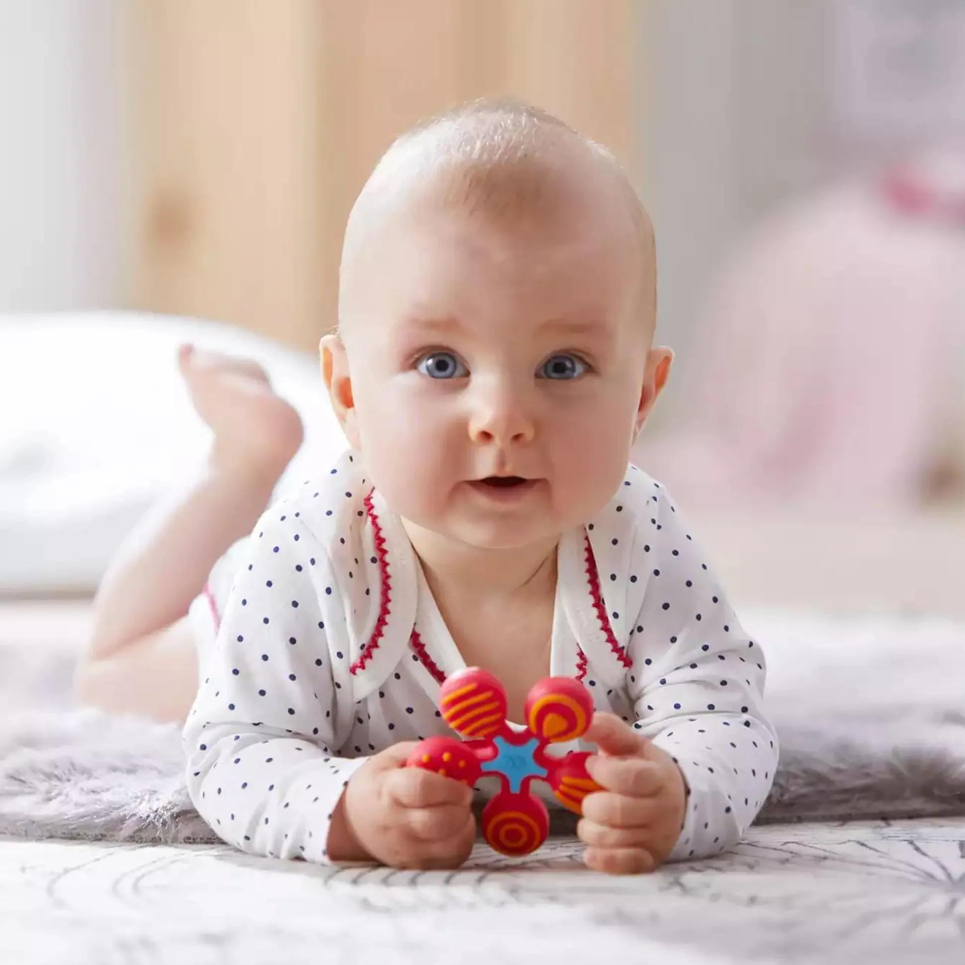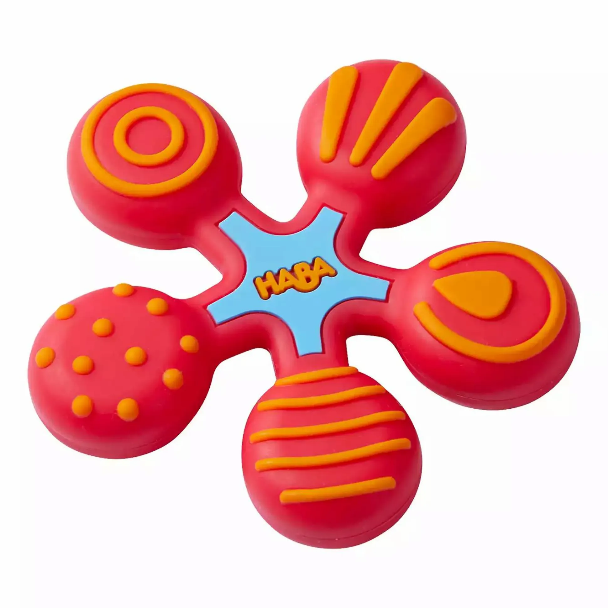 Babys lieben es, Dinge mit allen Sinnen zu erkunden. Dabei spielen gerade in den ersten Lebensmonaten der Geschmackssinn bzw. die Zunge und der Mundraum eine große Rolle. Eltern wissen: Ihre Babys stecken sich alles Mögliche in den Mund und kauen genüsslich darauf herum. Der putzige Haba-Greifling Stern aus Silikon lädt mit seinen fünf Armen zu einer spaßigen Entdeckungstour ein. Jeder Arm des Sterns besitzt eine anders strukturierte Oberfläche: Mal ist er mit vielen kleinen Punkten, mal mit dünnen oder breiten Streifen oder mit Kringeln überzogen. Das Kauen auf den unterschiedlichen Strukturen bietet somit viel Abwechslung. Es entspannt und beruhigt, vor allem beim Zahnen. Der Haba-Grefiling Stern ist für Babys daher ein äußerst nützlicher Helfer!