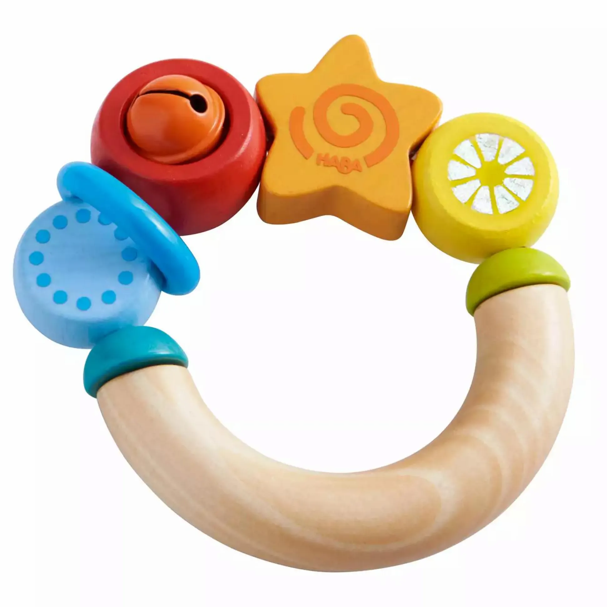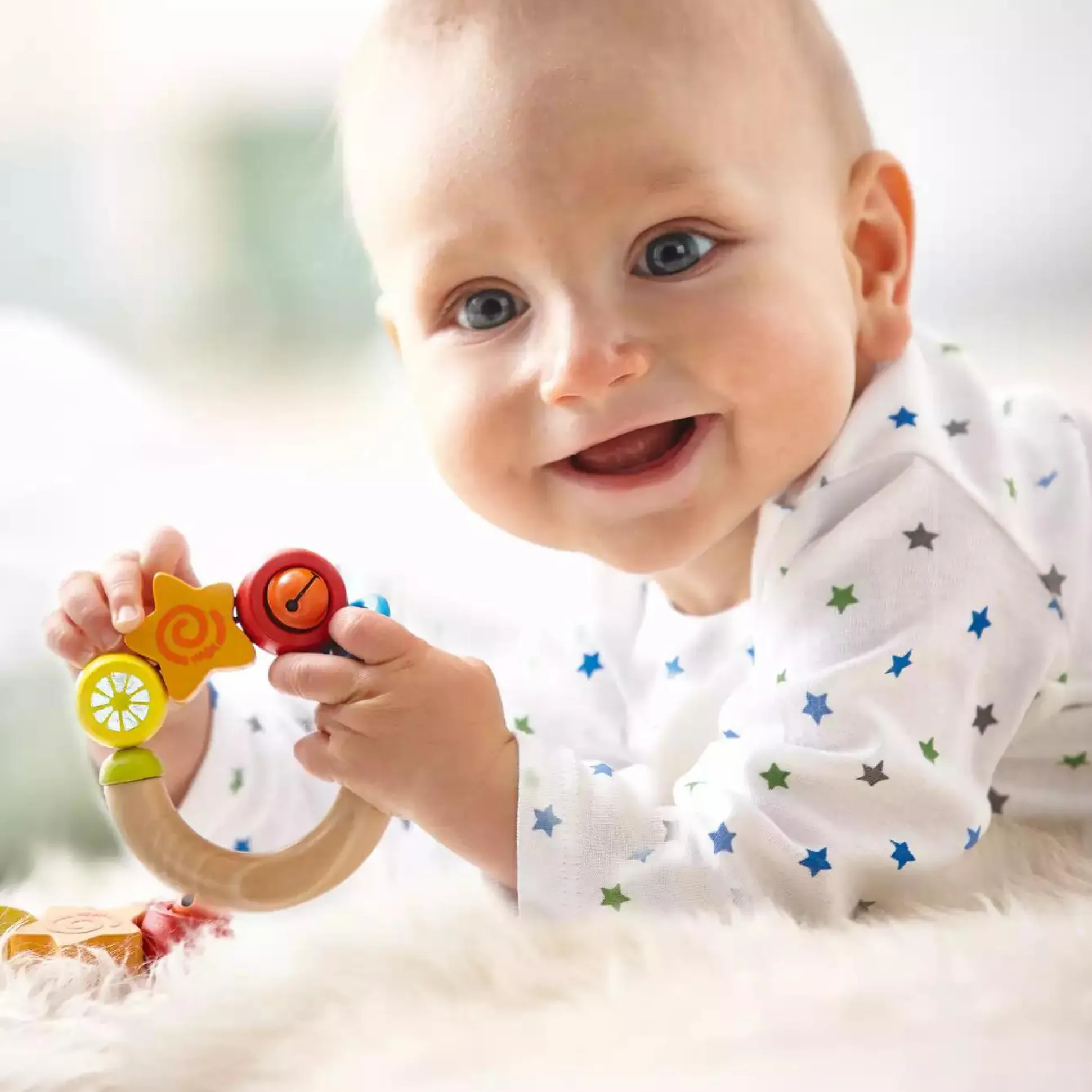 Der Greifling Sternchen von Haba besteht aus Holz, Kunststoff und Metall. Er lädt zum Ansehen, Anfassen, Umgreifen, Hin- und Herwenden ein – alles Bewegungen, welche die Motorik von Babys fördern.