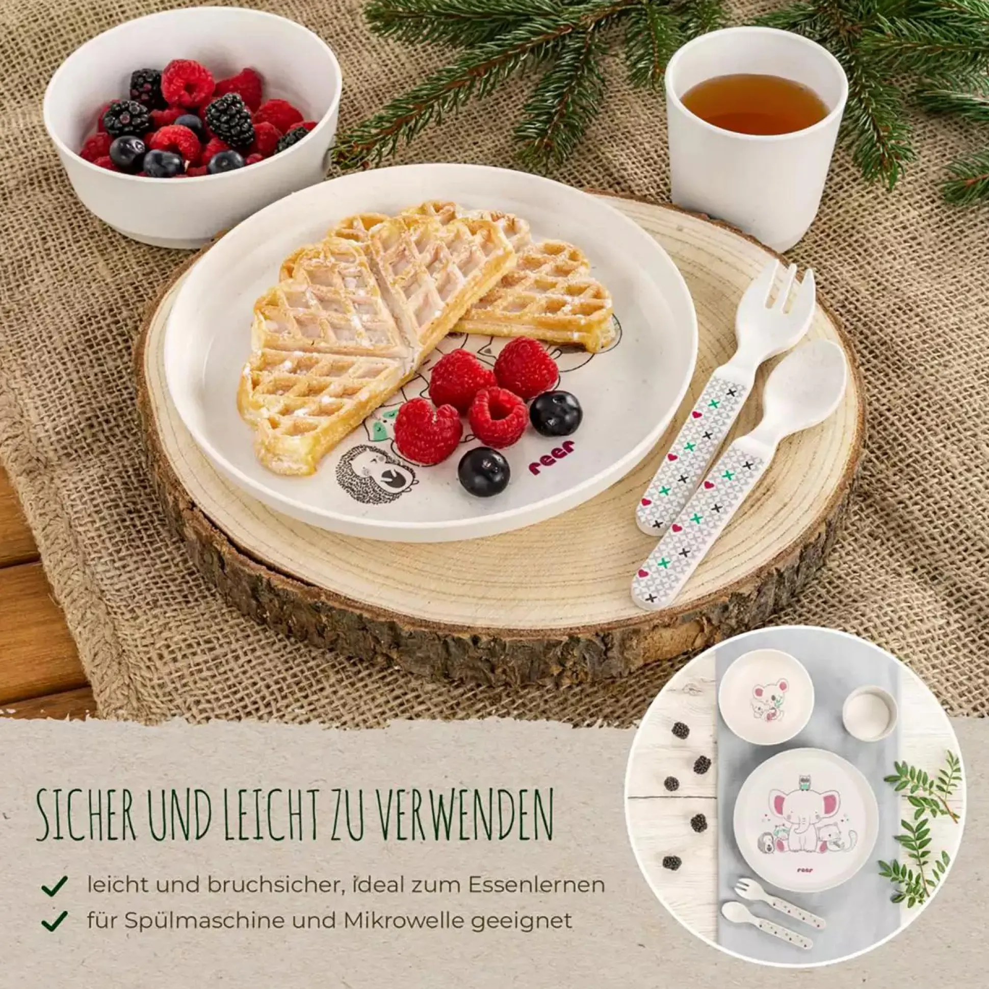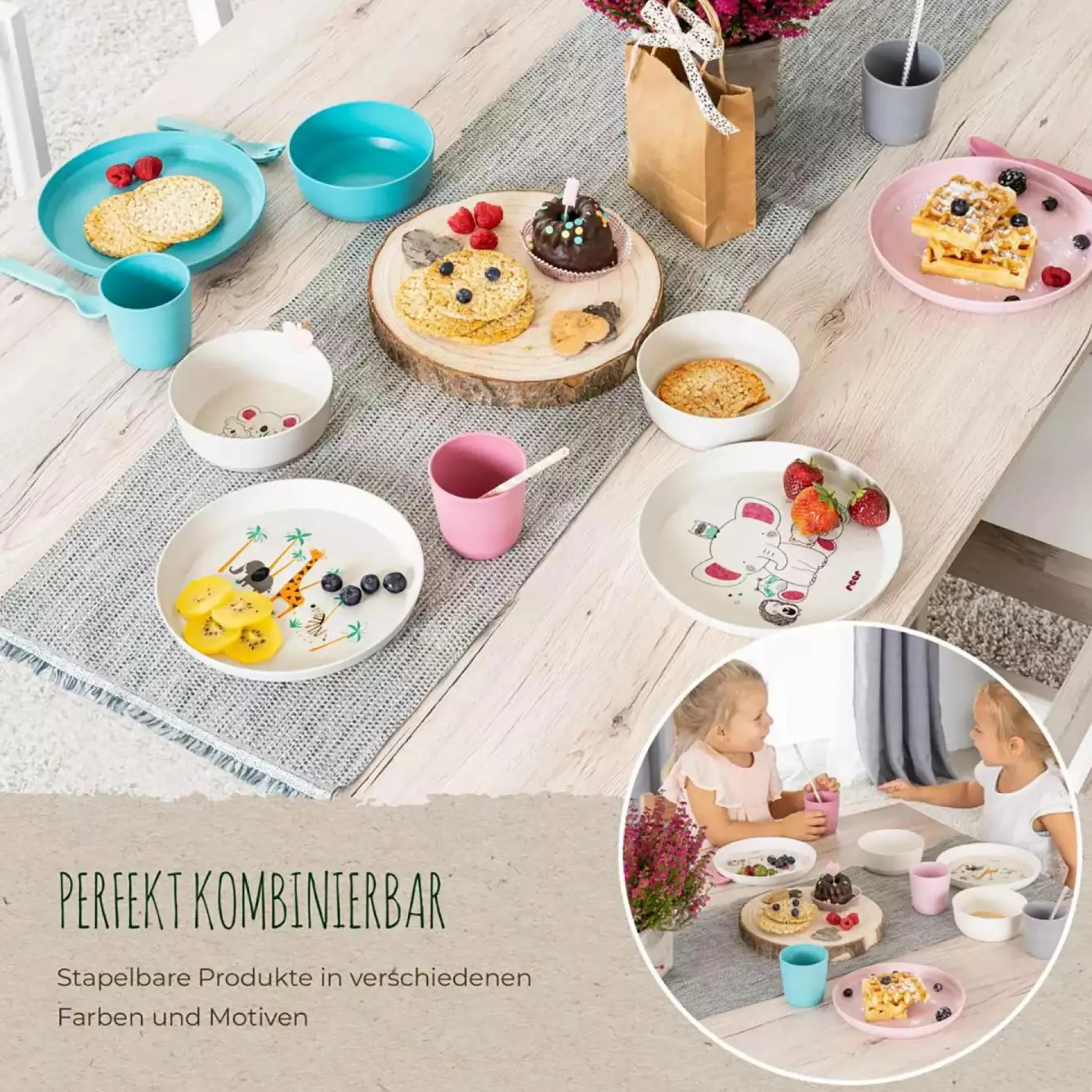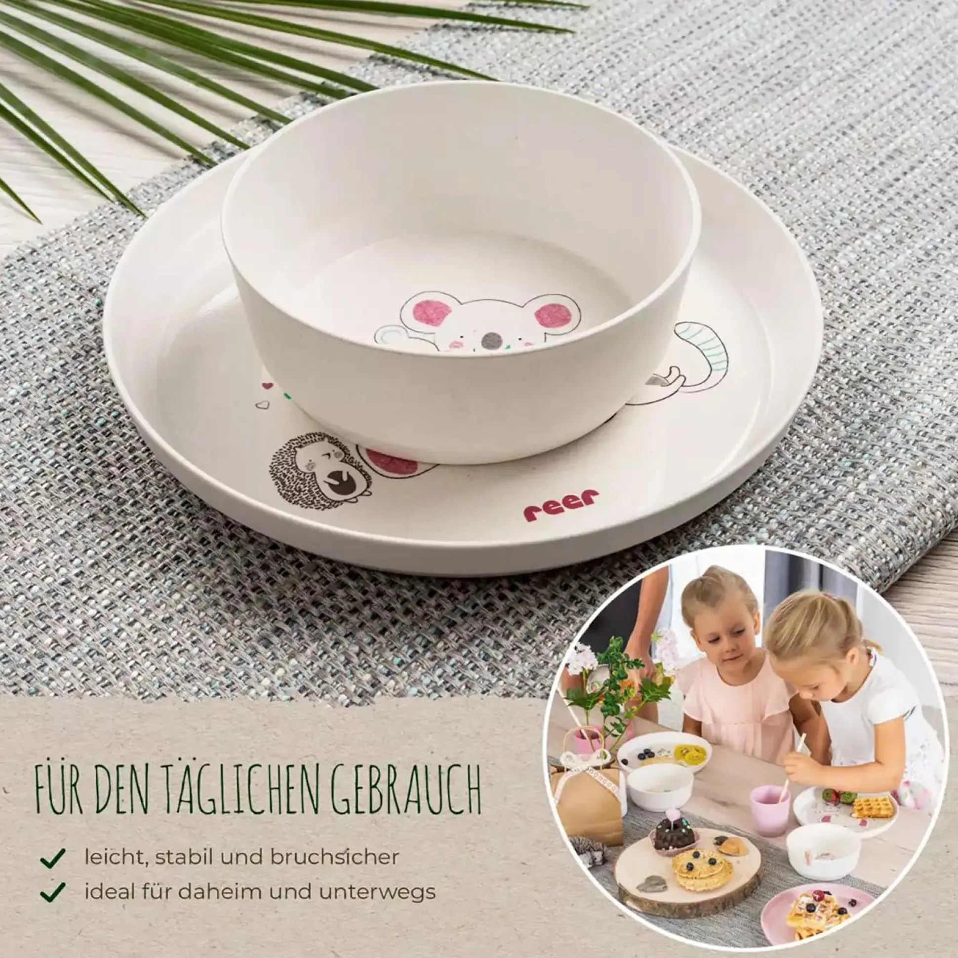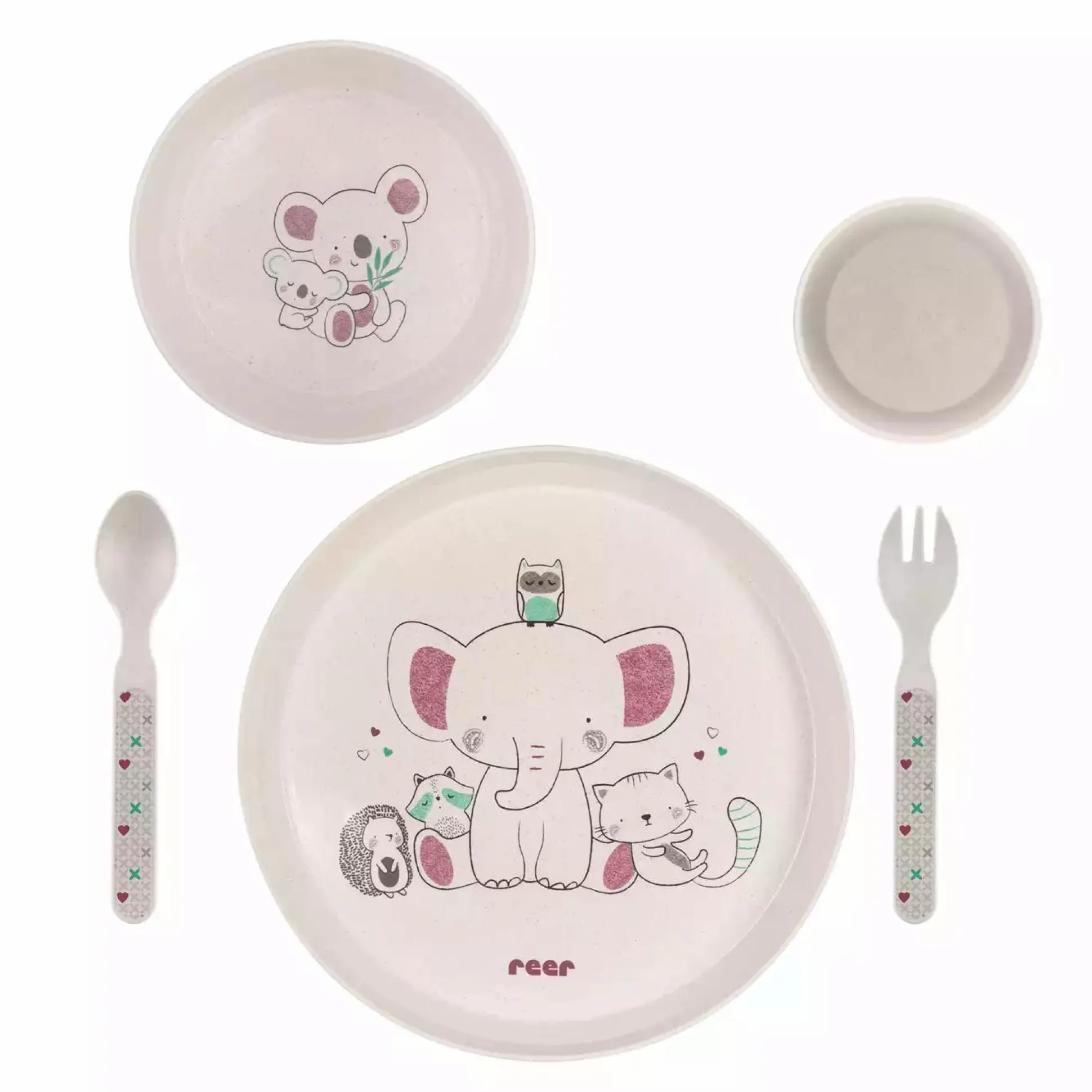 Das 5-teilige Growing Geschirr-Set Lovely Friends von reer ist fürs selbständige Essen lernen besonders gut geeignet – es ist in Größe und Gewicht optimal auf die Motorik und Kraft von Kleinkindern abgestimmt. Die natürlich matte Oberflächenstruktur des reer Geschirrs liegt gut in der Hand und erleichtert so deinem Liebling das Greifen und Halten. Die Größe und das Gewicht jedes einzelnen Geschirrteils ist ideal für Kinderhände geeignet und lässt sich über die gesamte Kindheit hinweg einsetzen.