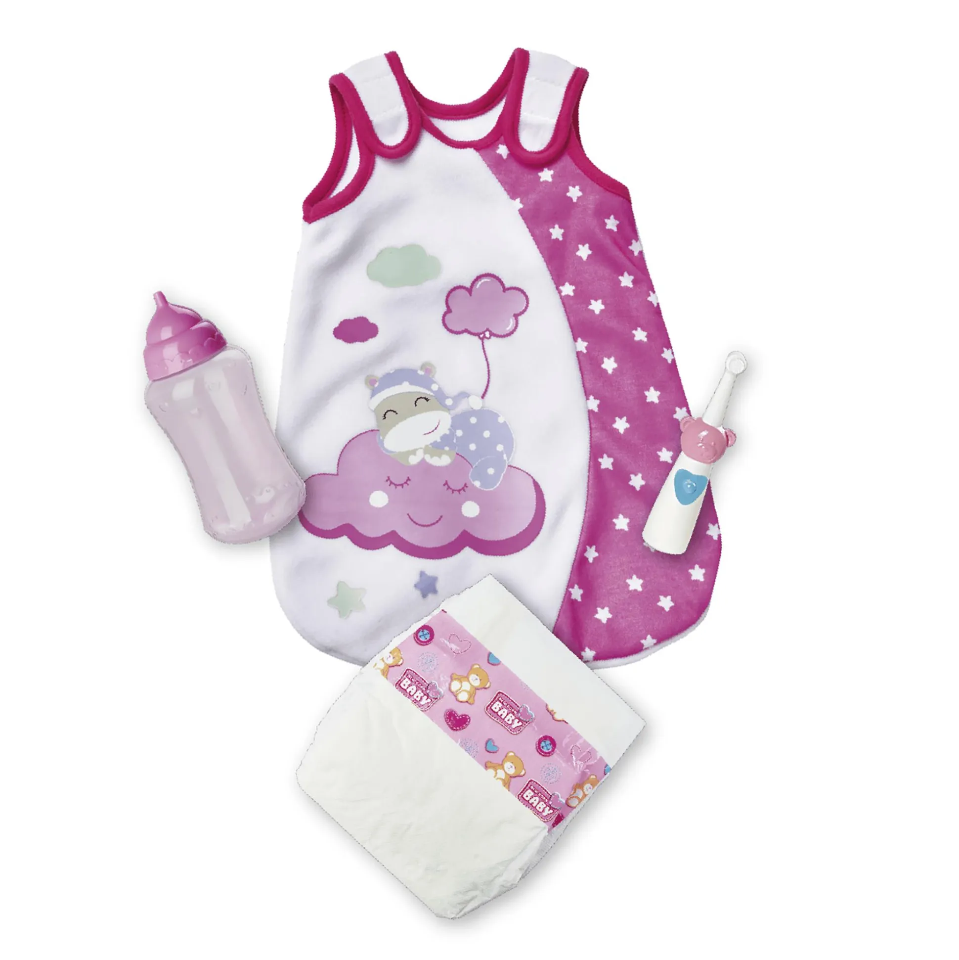 - enthält 1x Fläschchen, 1x Zahnbürste, 1x Windel, 1x Schlafsack