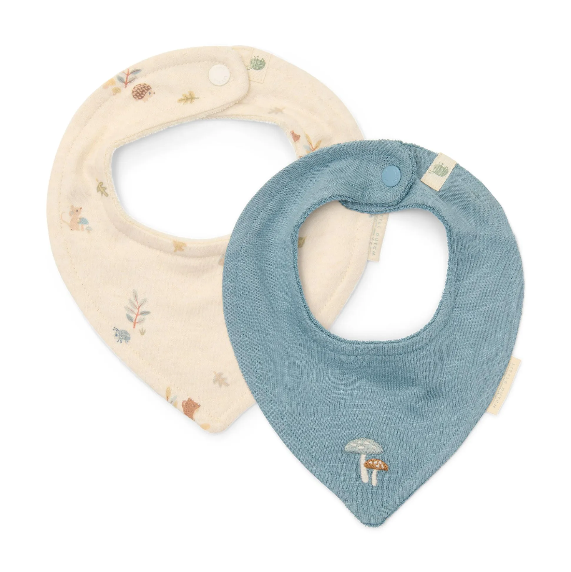 Mit dem Halstücher-Set Forest von Little Dutch ist dein kleiner Schatz nicht nur bestens geschützt, sondern auch besonders niedlich gestylt. Die beiden Dreieckstücher sind angenehm zu tragen. Eines der Tücher zeigt einen liebevollen Alloverprint mit Waldbewohnern, das andere ist schlicht in Blau gehalten und mit einer kleinen Pilz-Stickerei versehen. Praktische Druckknöpfe sorgen für einen sicheren Sitz und einfaches An- und Ausziehen.