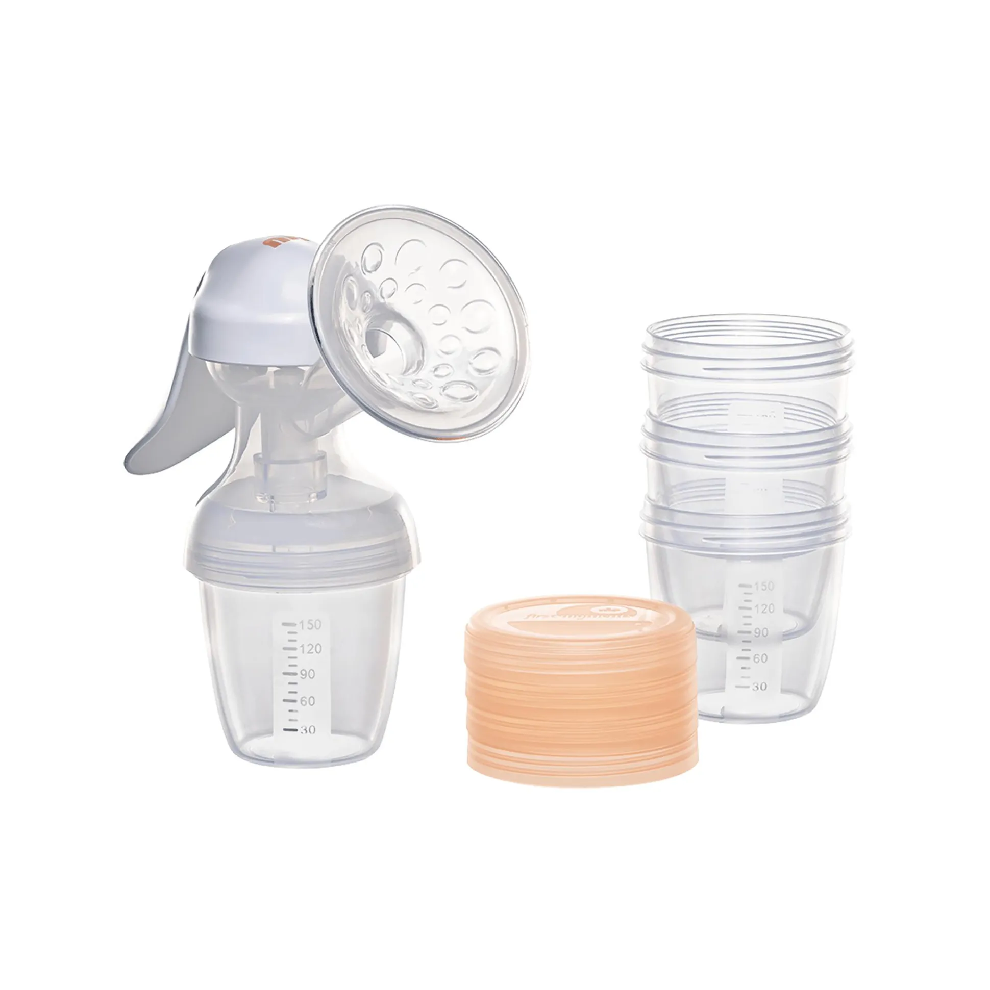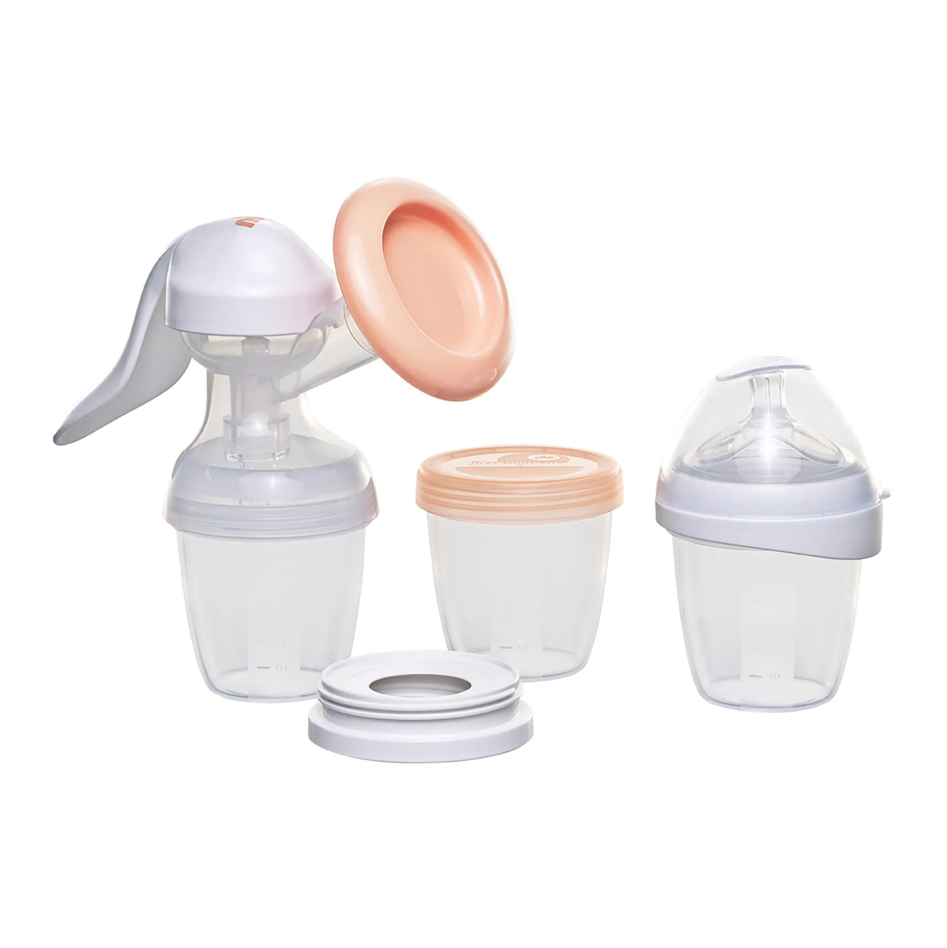 Die Handmilchpumpe besteht aus sehr wenigen Teilen,wodurch sie sich besonders leicht montieren und reinigen lässt. Bis auf die Silikonteilekann sie einfach und schnell in der Spülmaschine gereinigt werden