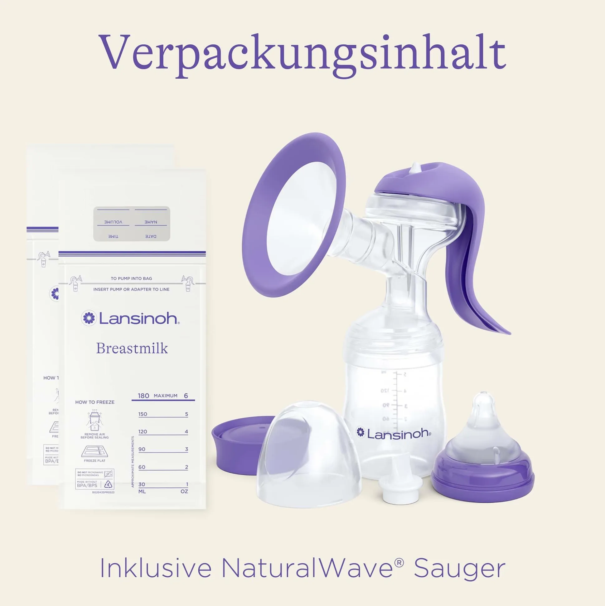 Natürlich ist die Handmilchpumpe kompatibel mit den Lansinoh® Weithalsflaschen und den NaturalWave® Saugern. Und mit den cleveren Muttermilchbeuteln kann direkt in den Beutel abgepumpt werden – ganz ohne Umfüllen und ohne dass ein Tropfen der wertvollen Milch verloren geht.