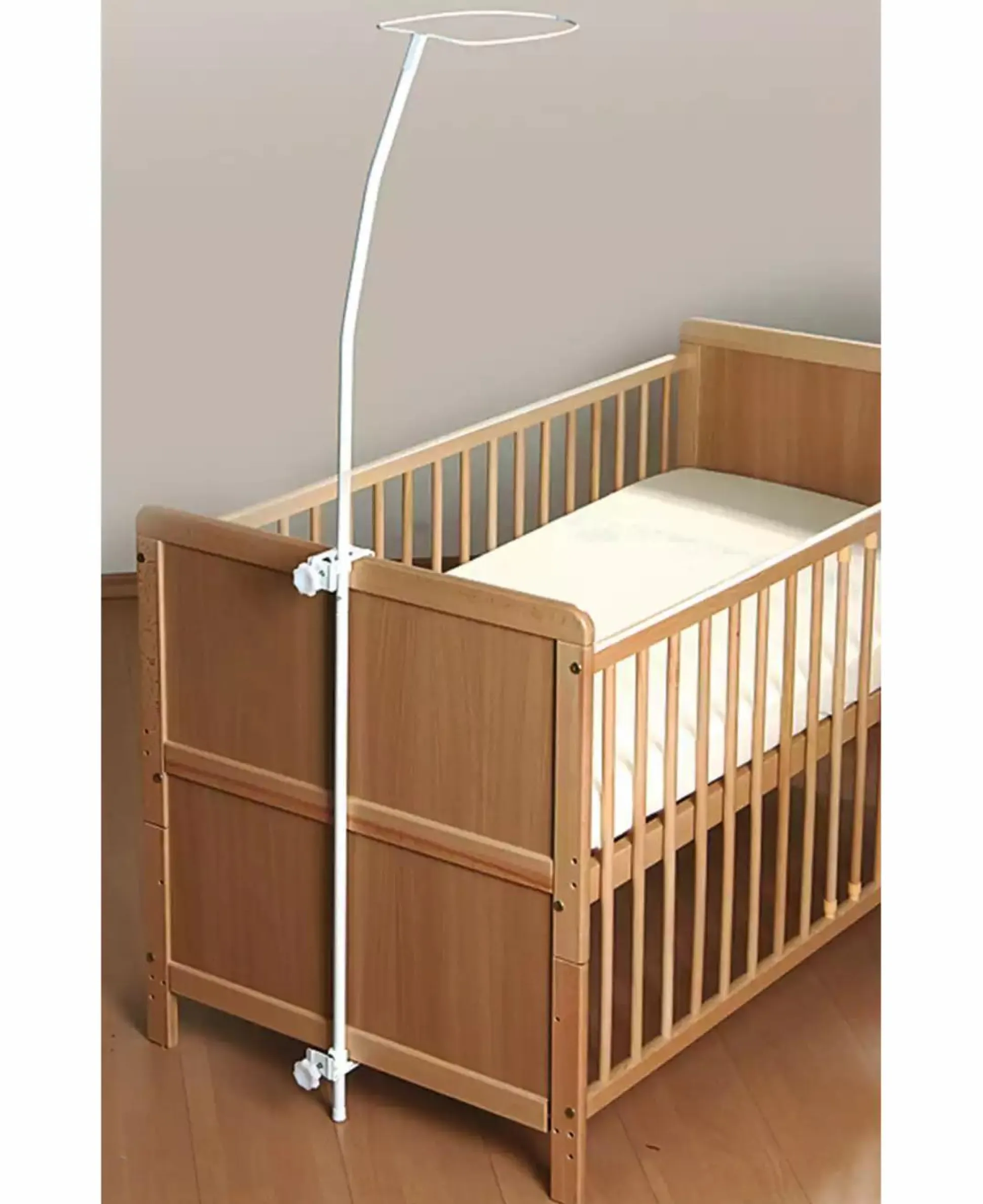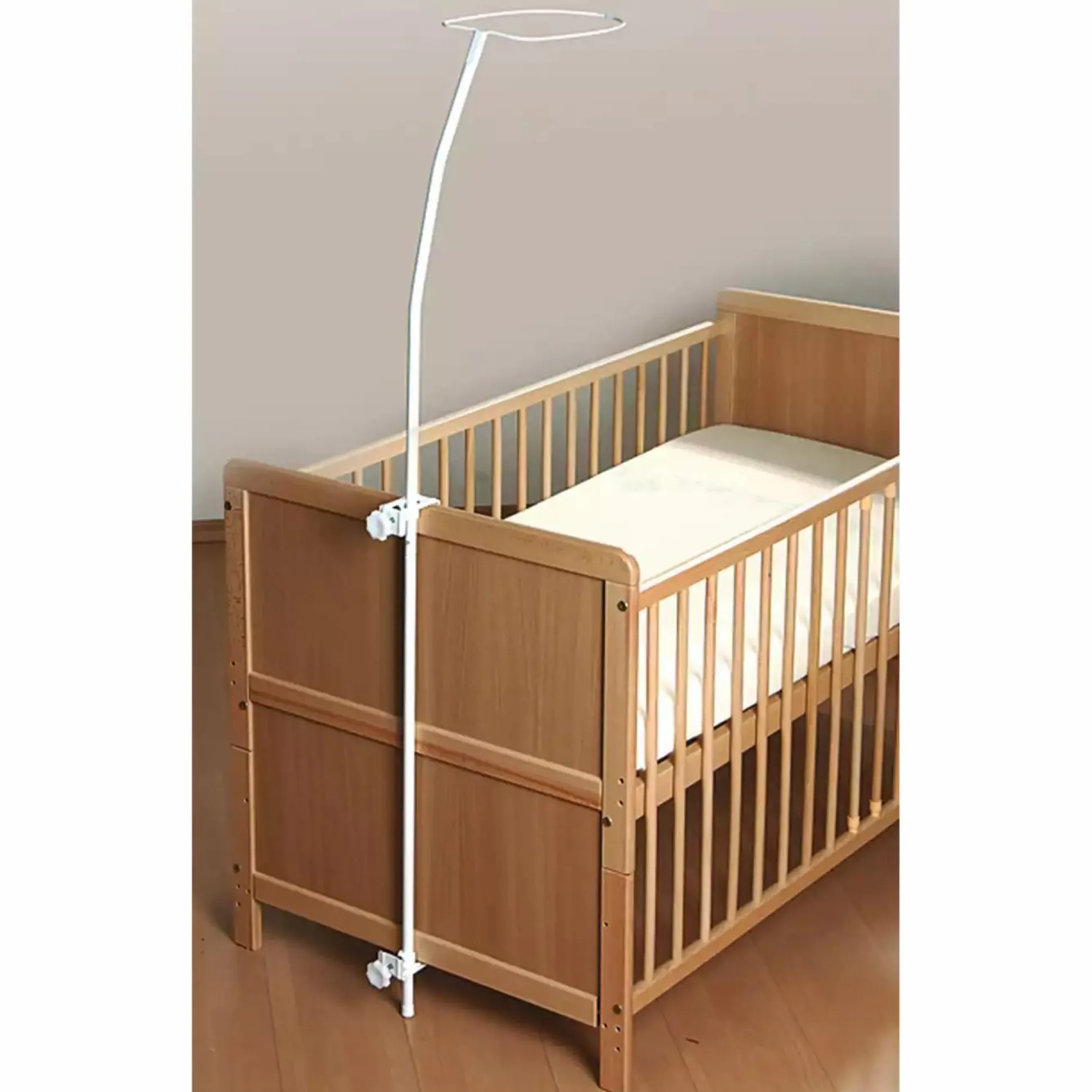 Dieser schlichte Himmelhalter überzeugt durch seine einfache Handhabung. Mit Hilfe von Schraubklemmen kann der Himmel einfach an der Kopfseite des Bettes befestigt werden.