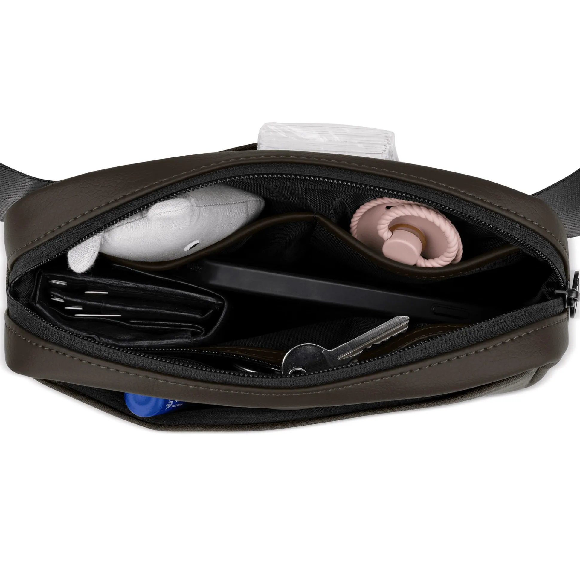 Die Hip Bag Avocado von ABC Design ist eine stilvolle und vielseitige Allzwecktasche, die sich dank des stufenlos verstellbaren Gurts bequem als Brust- oder Bauchtasche tragen lässt. Hochwertige vegane Lederelemente und wasserabweisende Stoffe verleihen der Tasche einen edlen Look und machen sie gleichzeitig robust und funktional. Mit einem Außenfach mit Reißverschluss, einem großen Innenfach mit zwei praktischen Fächern und einem weiteren Reißverschlussfach bietet die Hip Bag optimale Organisation für unterwegs.