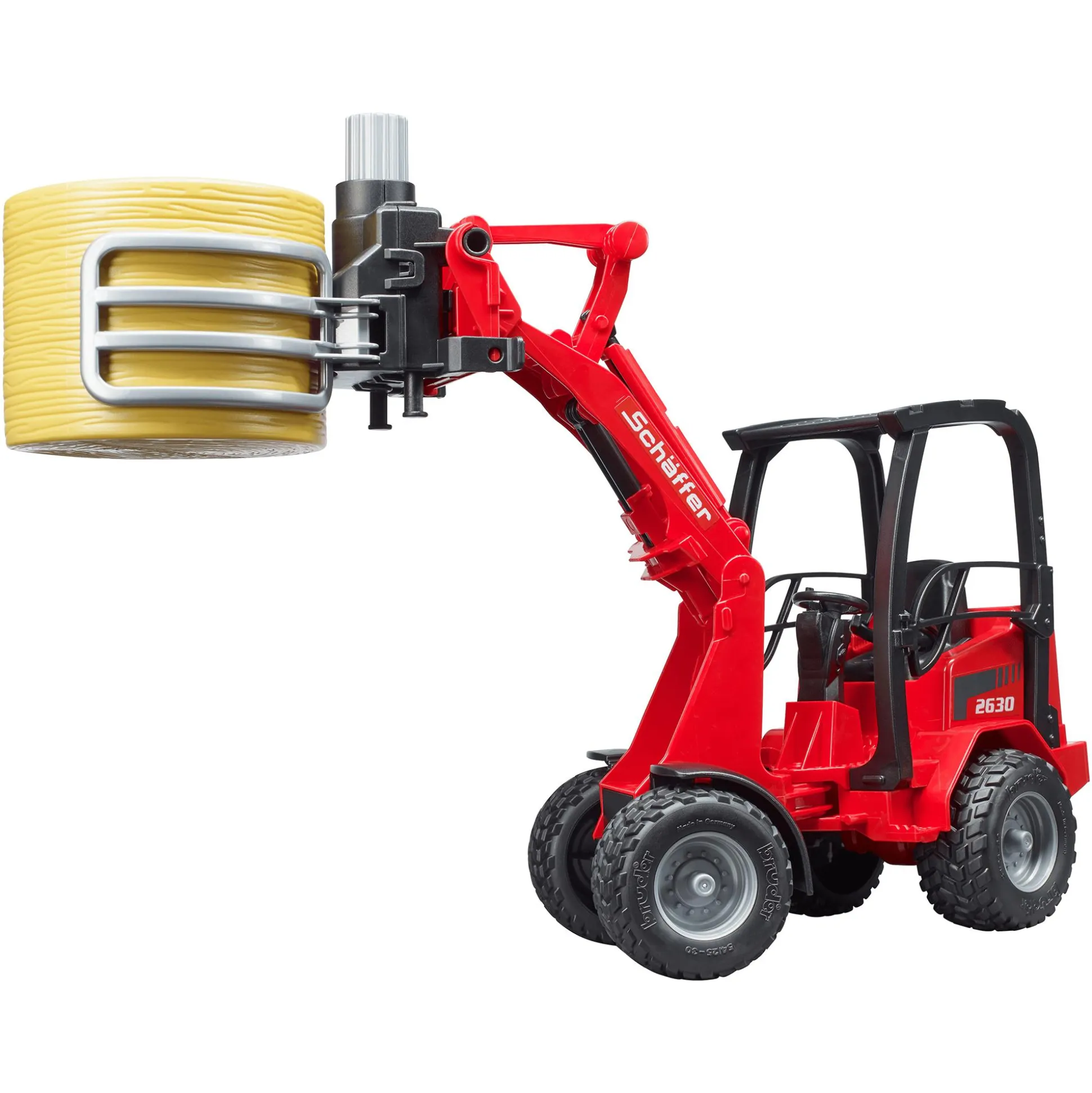 Der Hoflader ist mit einer funktionierenden Knicklenkung ausgestattet, die maximale Wendigkeit auf engem Raum ermöglicht – genau wie beim Original. Der bewegliche Ladearm und die Ballengreifzange lassen sich präzise steuern: Die Greifzange öffnet und schließt sich durch einfaches Drehen am oberen Stellrad und ermöglicht das Greifen und Transportieren des mitgelieferten Rundballens. Der massive Überrollbügel sorgt dafür, dass eine B-World Figur (nicht im Lieferumfang enthalten) sicher im Fahrersitz Platz nehmen kann.