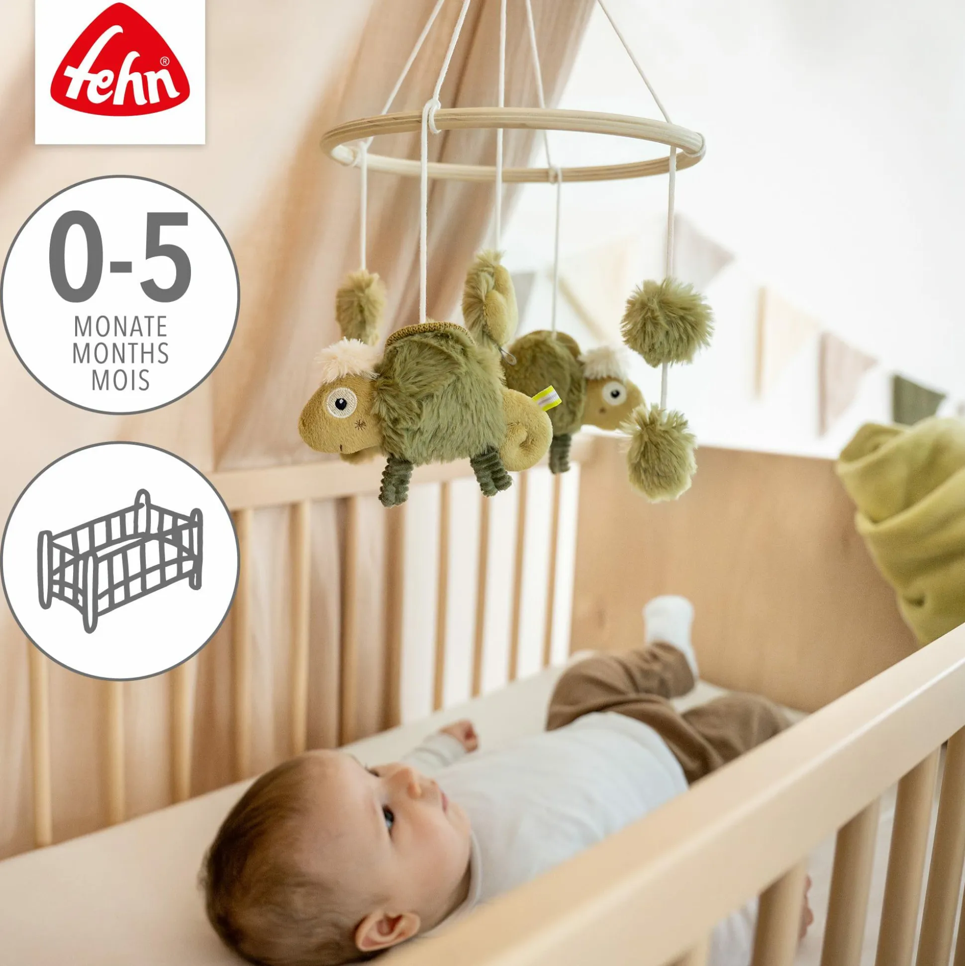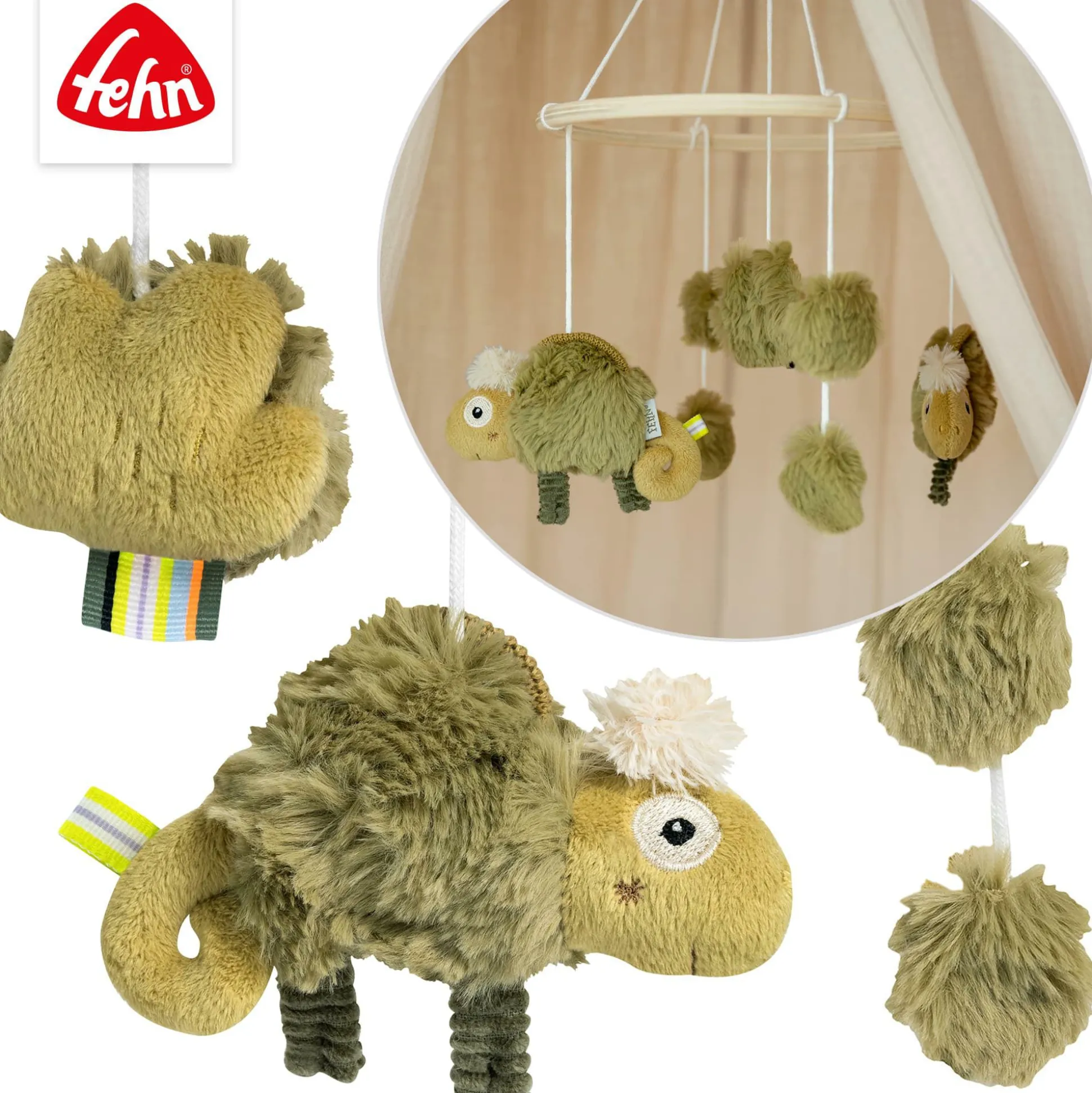 Das Holz-Mobile Chamäleon von fehn ist die optimale Einschlafhilfe für deinen Schatz und eignet sich wunderbar zur Beruhigung oder Beschäftigung. Zusätzlich regt es die visuelle Wahrnehmung sowie die Koordination an und fördert die Sinne. Es lässt sich einfach am Kinderbett befestigen und sorgt mit den niedlichen Stoff-Figuren garantiert für leuchtende Babyaugen.