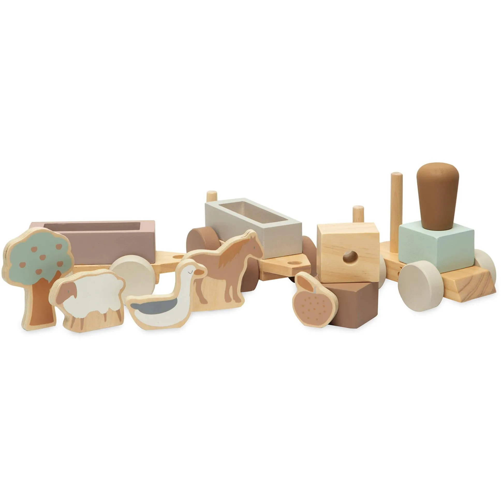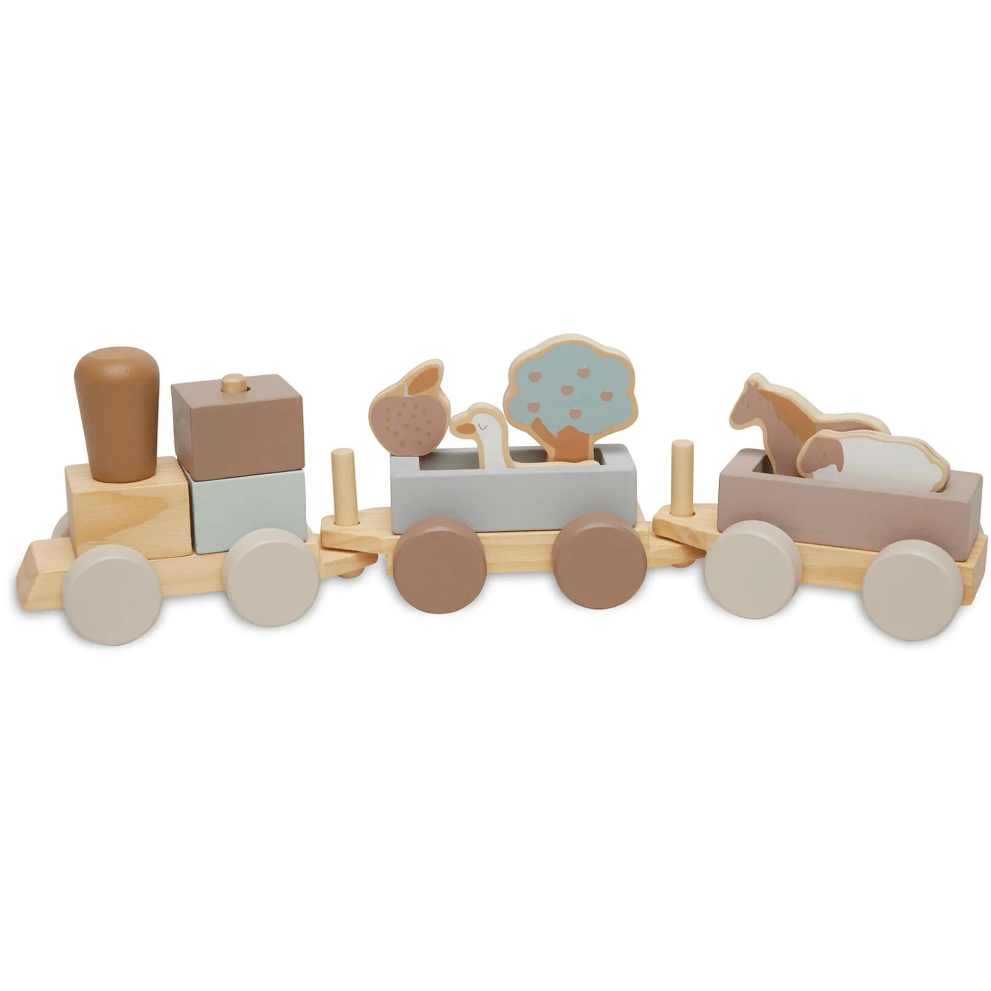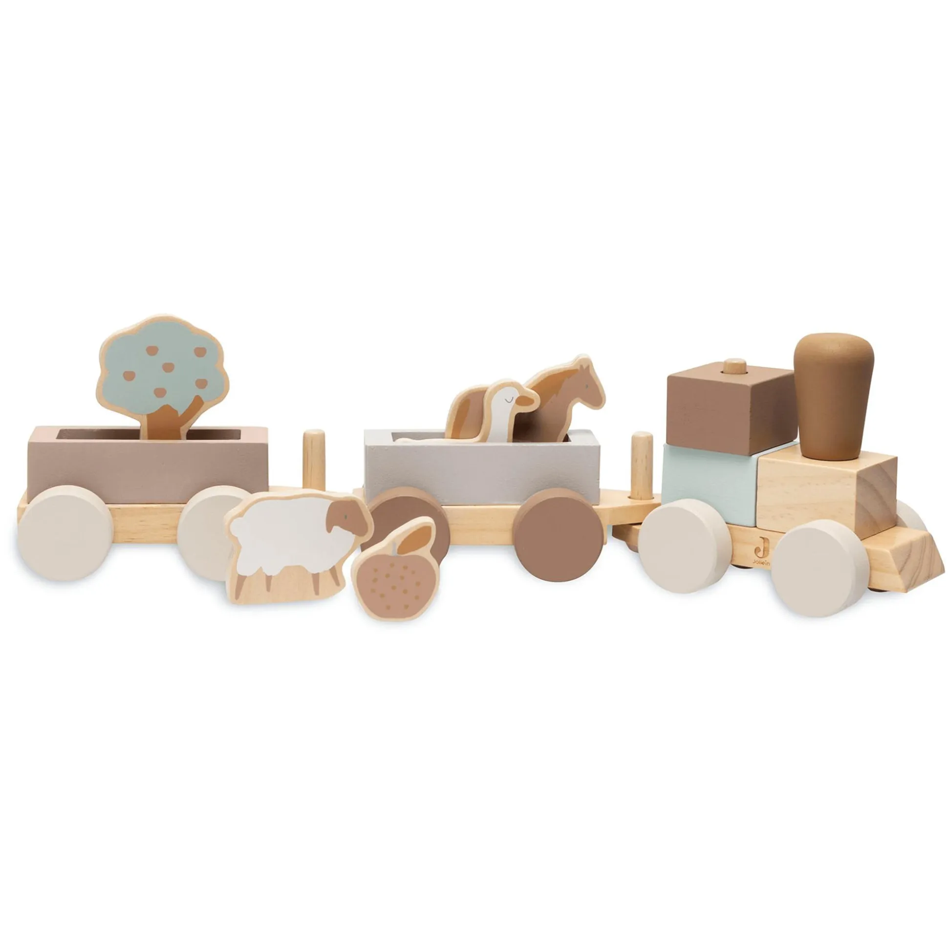 Die tolle Holzeisenbahn Farm von Jollein nimmt deinen kleinen Schatz mit auf eine spannende Reise. Niedliche Tiere sowie ein Baum und ein Apfel sind auch dabei. Die Lokomotive und zwei Waggons können voneinander gelöst und wieder miteinander verbunden werden. Dadurch wird spielerisch die Feinmotorik deines Lieblings gefördert. Die Eisenbahn regt automatisch die Sinne deines Kindes an und lädt zum Entdecken und Spielen ein.