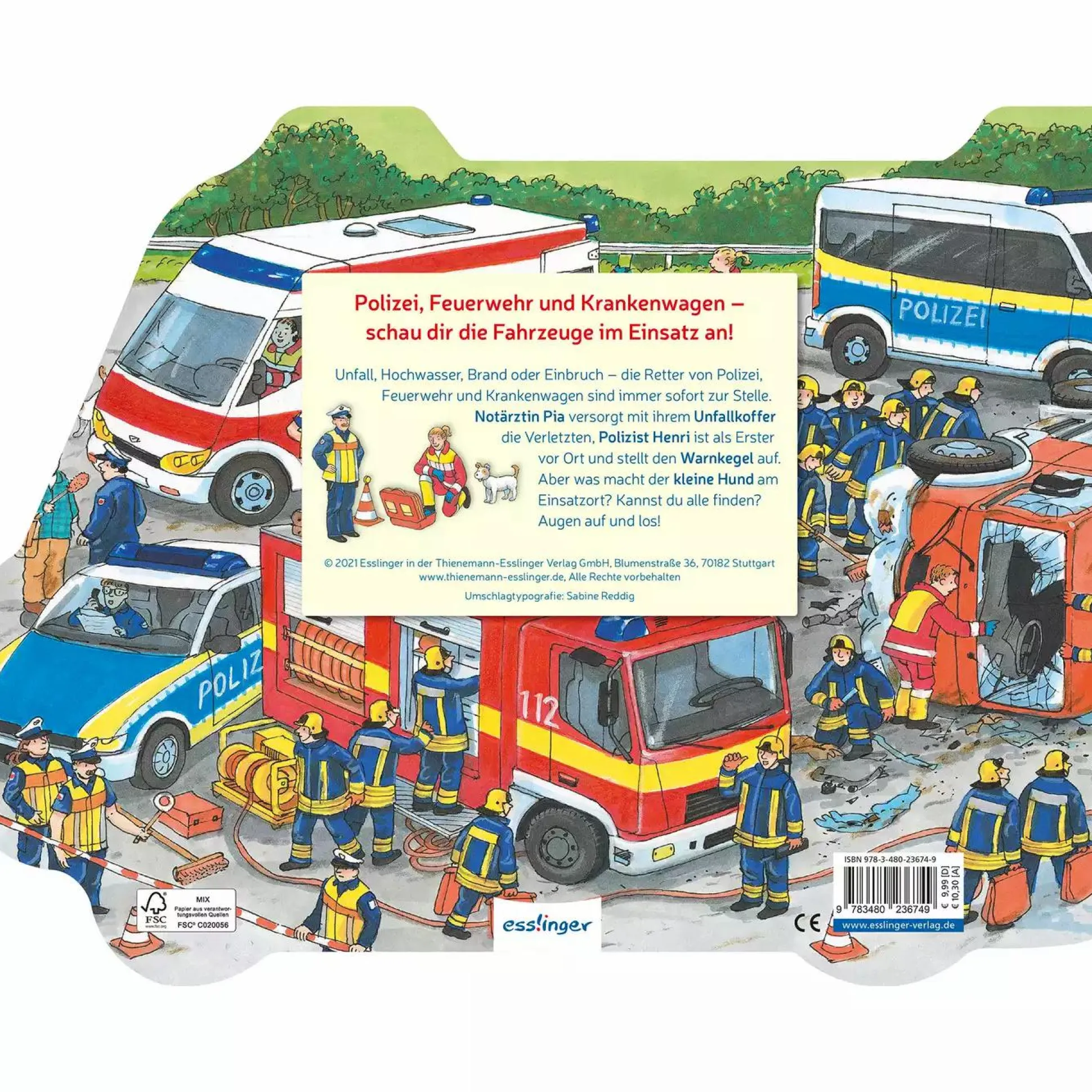 In dem detailreichen Wimmelbuch „Im Einsatz!“ gibt es viele spannende Dinge zu Entdecken. Auf 14 Seiten kann dein kleiner Schatz der Feuerwehr, der Polizei und vielen anderen Einsatzkräften bei ihrem Einsatz zuschauen und Suchaufgaben lösen.
