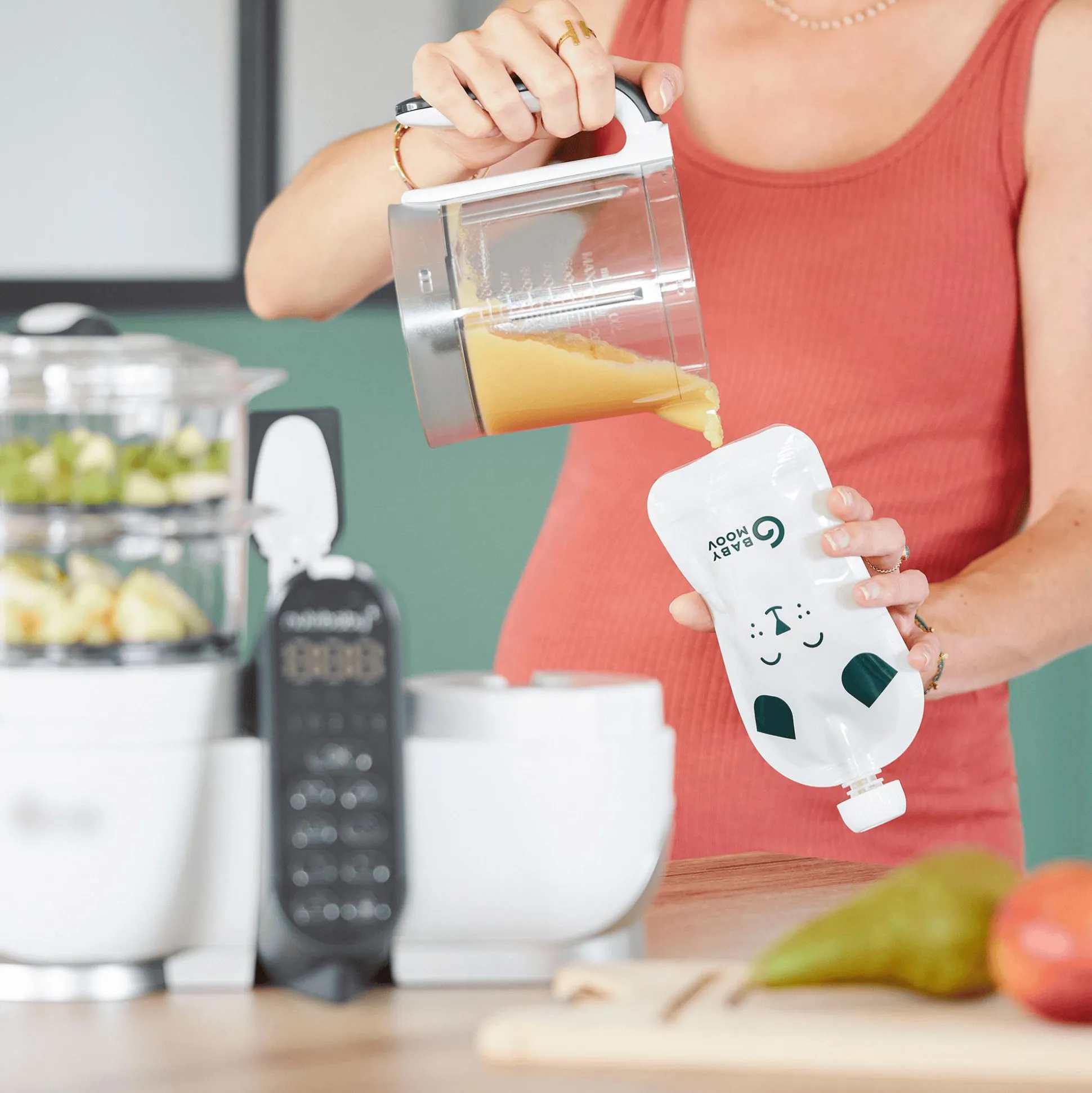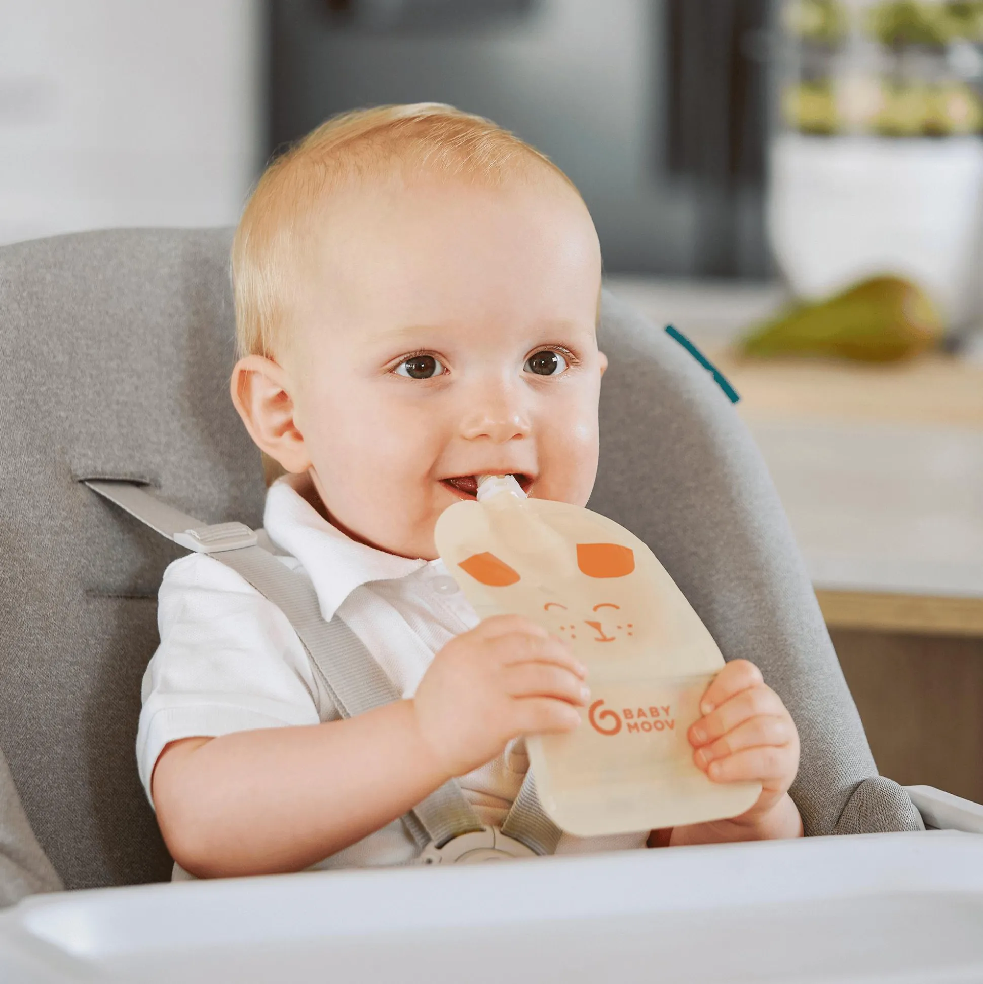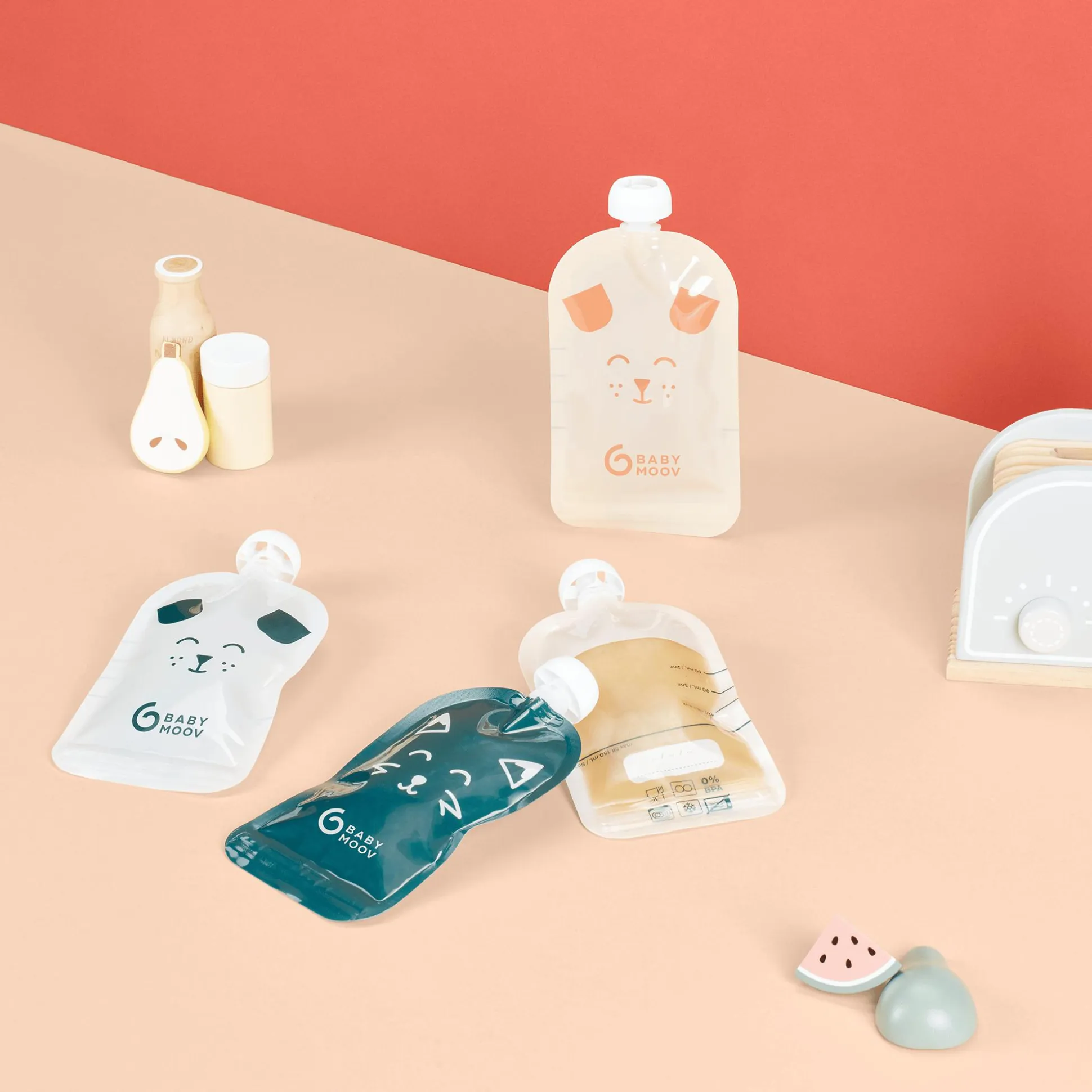 Je nach Geschmack deines Kindes kannst du die Beutel mit 150ml Püree, Kompott, Joghurts oder vieles mehr befüllen. Sie haben eine große Öffnung auf der Unterseite und lassen sich dank des Zippverschlusses verlässlich verschließen.