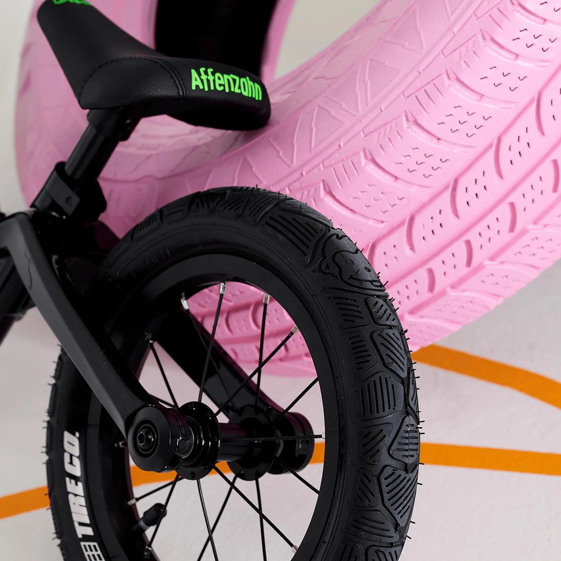 Mit den Füßen bremsen sorgt für bessere Kontrolle und durch den breiten Lenker gelingt die Steuerung auch Laufradanfängern. Dank des breiten Radstands und der Geometrievermessung des Laufrads wird das Fahren zum Kinderspiel. Das Laufrad besitzt ein 12′′ Hinterrad und 14′′ Vorderrad, was mehr Fahrstabilität bietet und gleichzeitig das Überqueren von Hindernissen erleichtert. Der Rahmen ist kindgerecht designt und kein klassischer Diamantrahmen. Das ermöglicht dem Kind einen tiefen Ein- und Ausstieg.;Der wannenförmige Sattel (hinten höher als vorne) lässt sich individuell anpassen. Natürlich kommt das Laufrad mit eigenen Affenzahn-Rädern. Das Reifenprofil hinterlässt eine Affenzahn Spur – so weiß man genau, wo man lang gefahren ist.