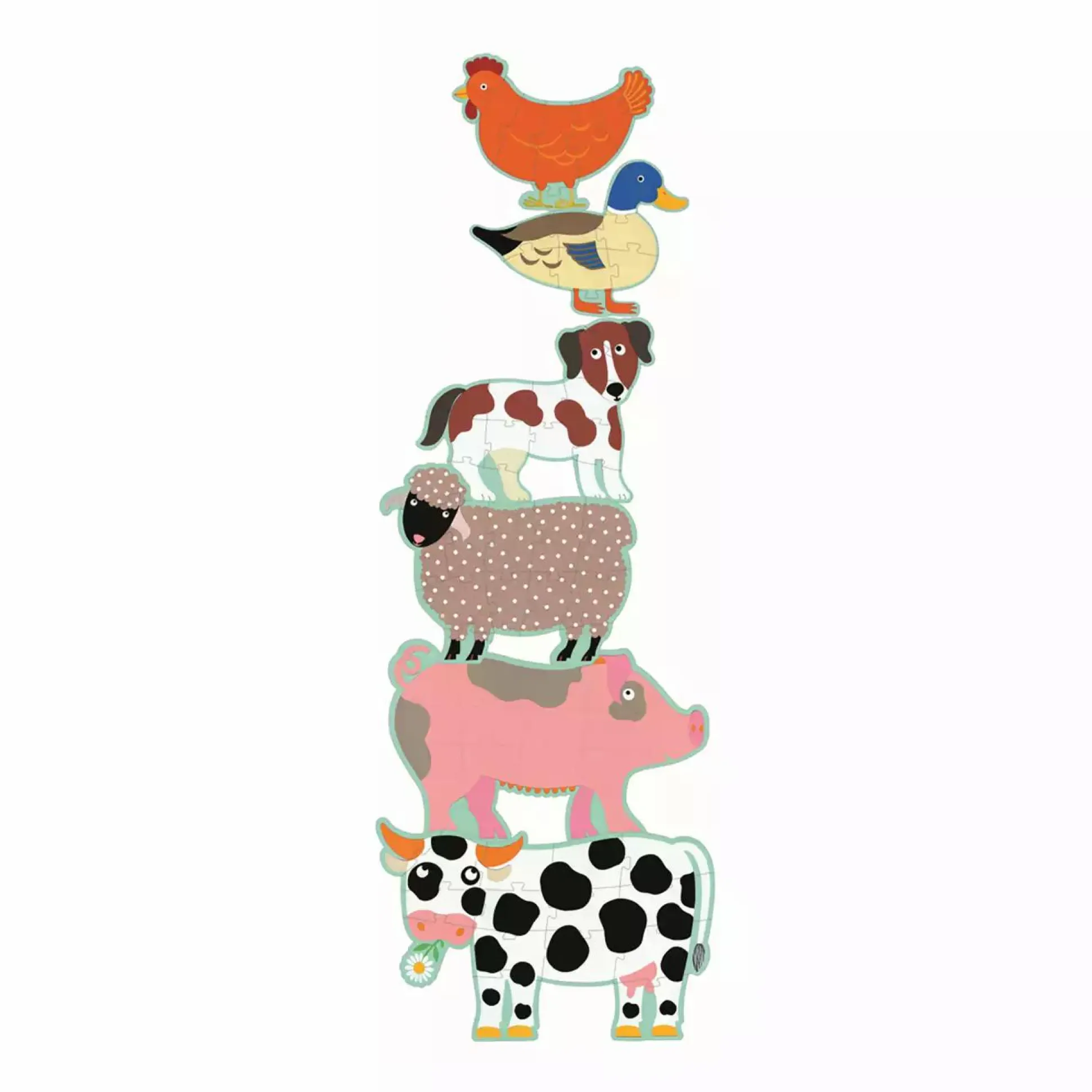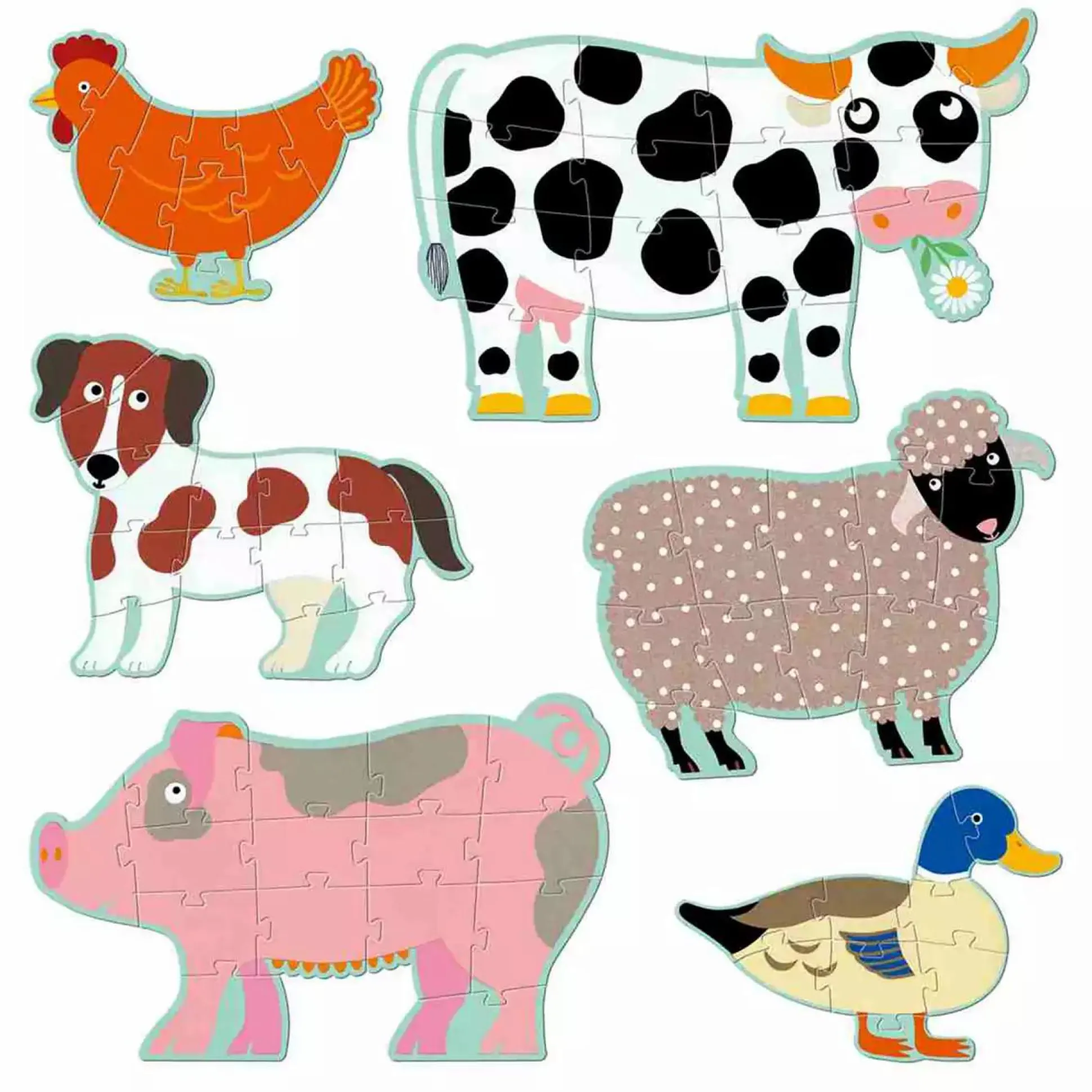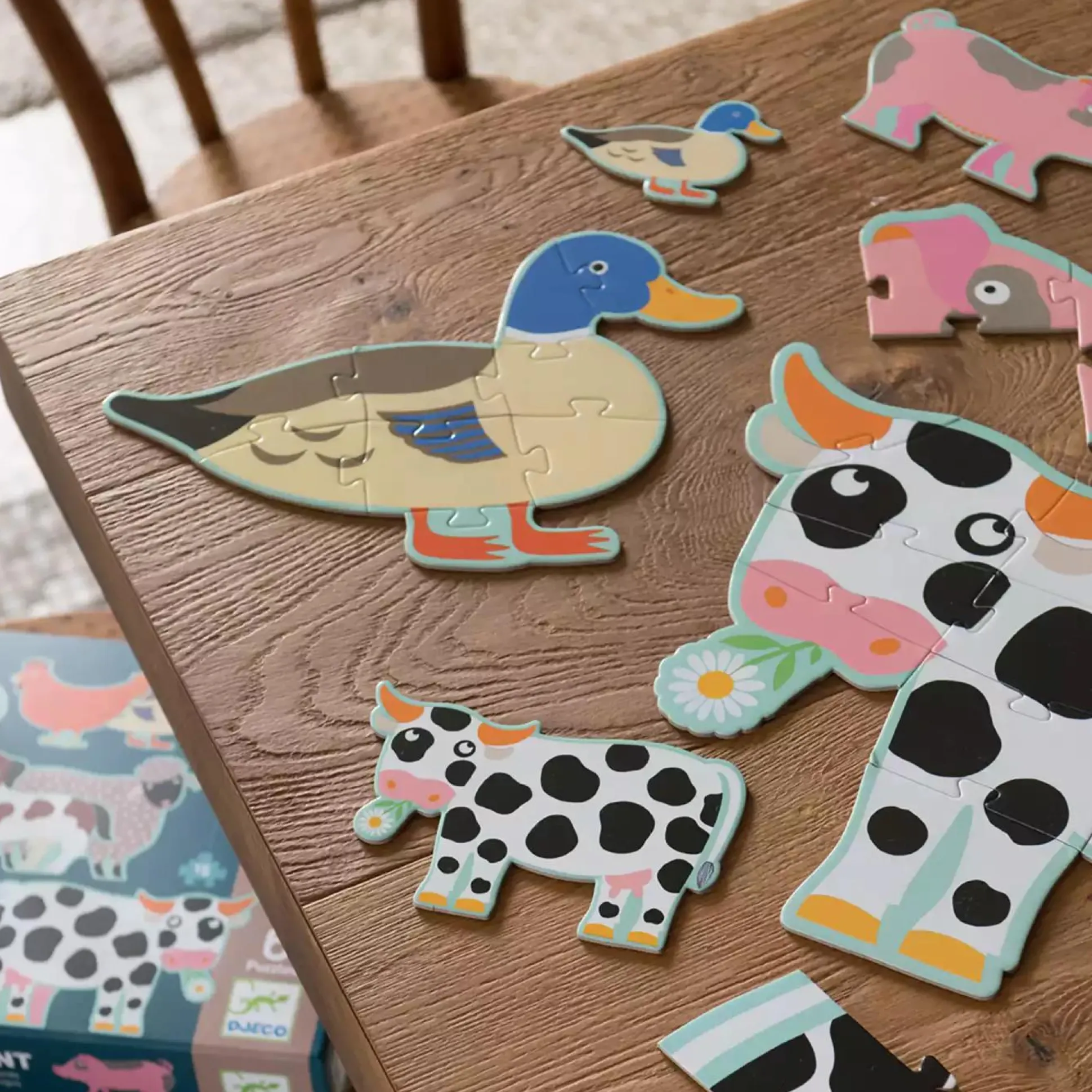 Das Kinderpuzzle Honoré & Friends von Djeco bietet sechs farbenfrohe Puzzles mit unterschiedlich vielen Teilen. Die Puzzles zeigen verschiedene Bauernhoftiere und ergeben zusammen ein großes Puzzle mit einer Länge von ca. 1,40 m. Mit dem Puzzle wird die Auge-Hand-Koordination sowie das räumliche Denken gefördert. Es ist ab einem Alter von ca. 3 Jahren geeignet.
