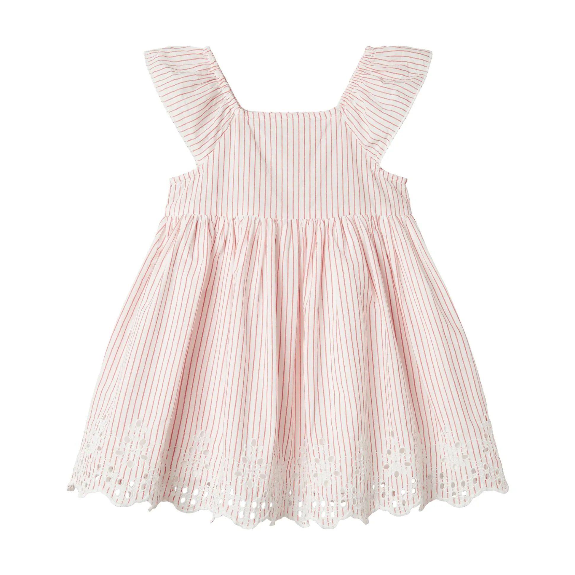 Das Kleid von name it ist ein zauberhaftes Sommerkleid für kleine Prinzessinnen. Mit zarten roten Streifen, Rüschen-Trägern und einer aufwendig bestickten Saumkante wird es schnell zum Lieblingsstück. Aus reiner Baumwolle gefertigt, ist es angenehm luftig und eignet sich perfekt für warme Tage – ob im Alltag oder zu festlichen Anlässen.
