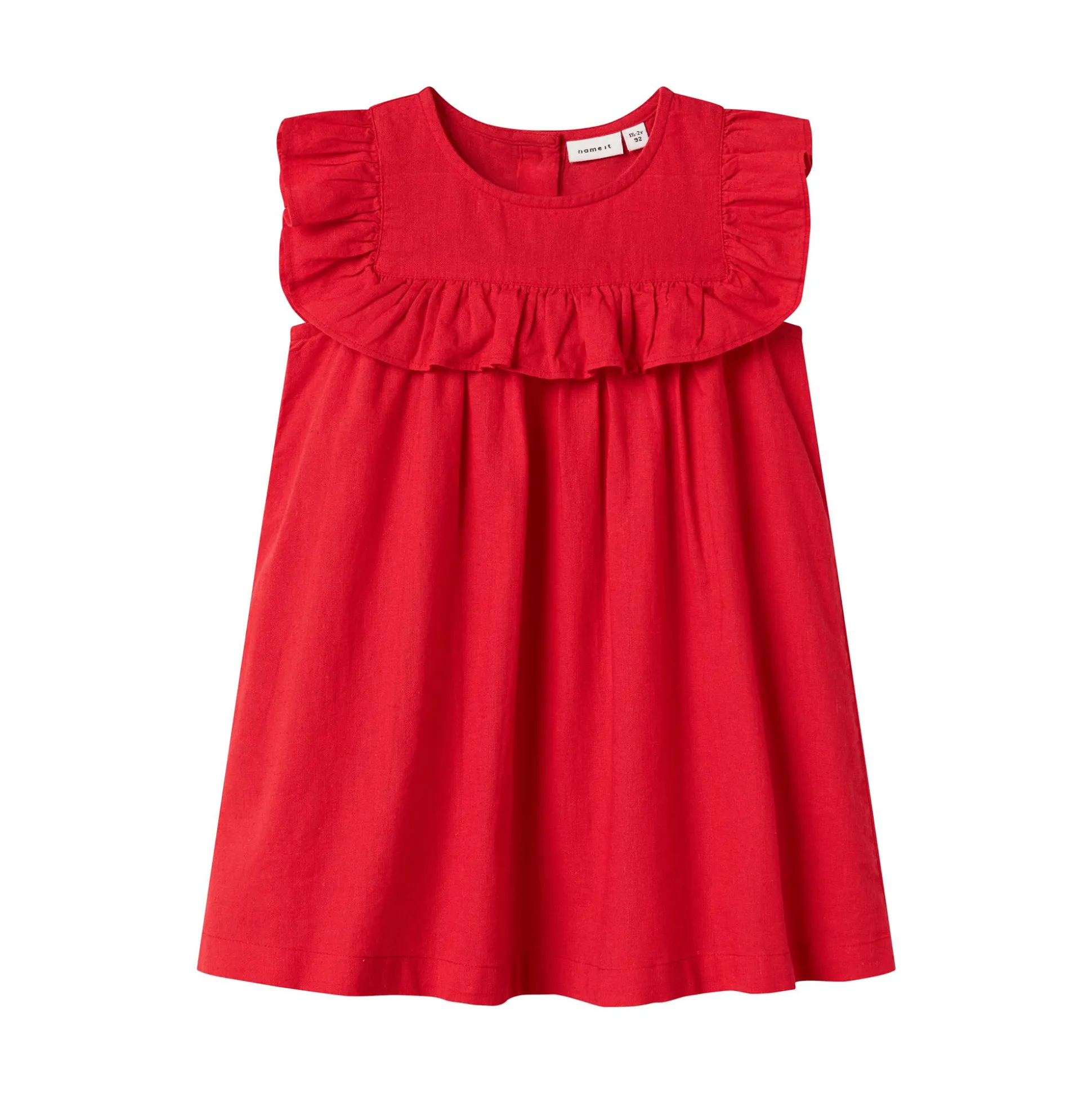 Das Kleid von name it ist ein sommerlich-leichtes Lieblingsstück mit klassischem Schnitt und verspieltem Volant. In kräftigem Rot und aus einem angenehmen Baumwoll-Leinen-Mix gefertigt, sorgt es für ein luftiges Tragegefühl – ideal für warme Tage. Dank der Knopfleiste im Nacken lässt sich das Kleid ganz einfach an- und ausziehen.