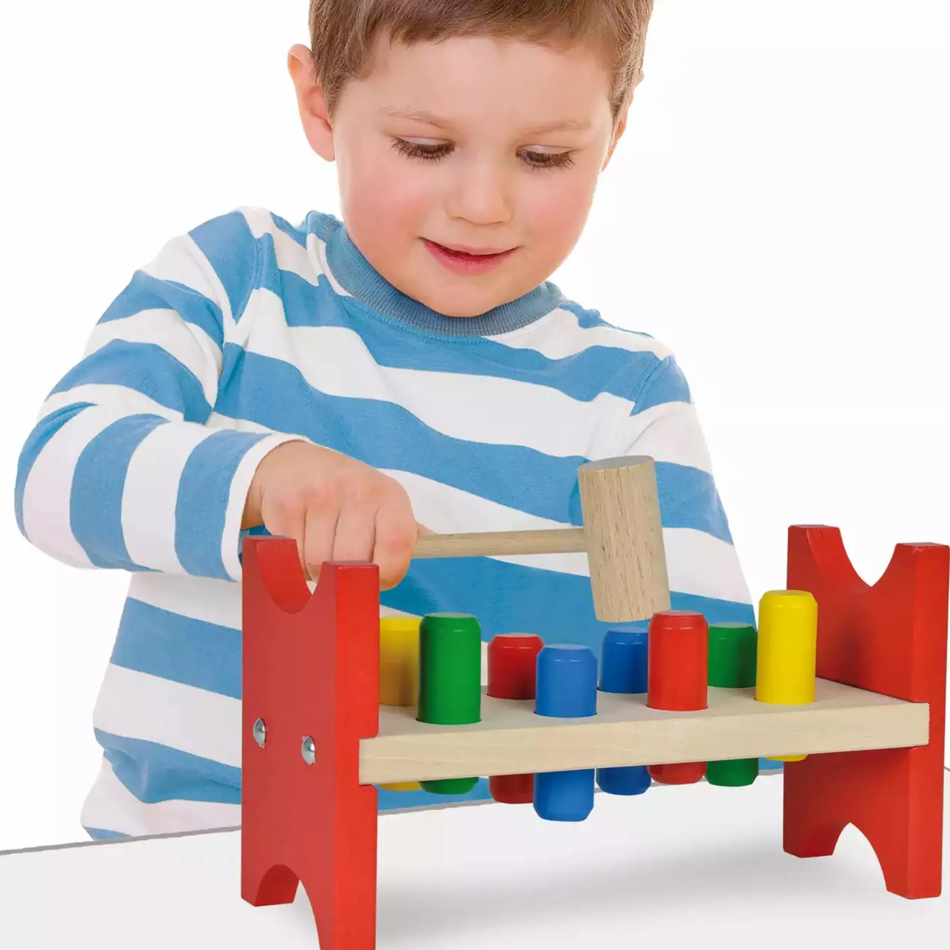 - bestehend aus Klopfbank, Hammer und 8 bunten Klopfstiften