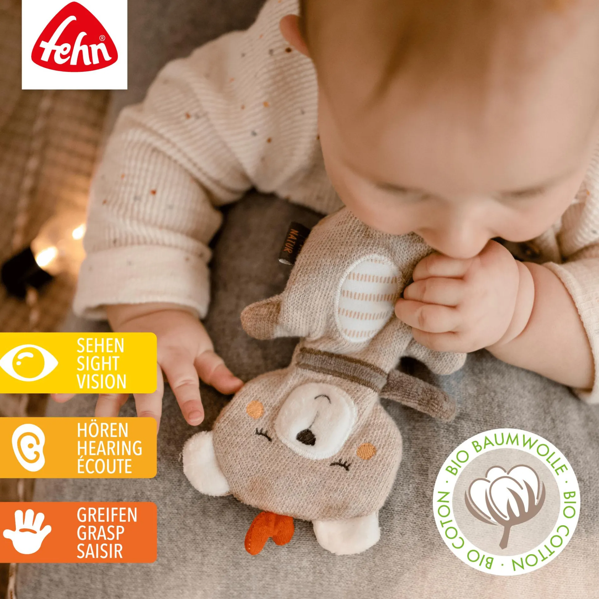 Der Knister-Teddy von fehn ist das perfekte Kuscheltier für deinen kleinen Liebling von Geburt an! Mit seinem niedlichen Design und dem Raschelpapier sorgt er für spielerische Unterhaltung und fördert die Sinneswahrnehmung deines Kindes. Diese akustischen Reize regen die Neugier an und fördern das Hören.Das Kuscheltier besteht außerdem aus einem Materialmix aus Strick, Jersey, Nicki und Musselin – allesamt aus Bio-Baumwolle gefertigt. Diese Stoffe sind besonders weich, anschmiegsam und schenken deinem Kind ein angenehmes Gefühl von Geborgenheit.