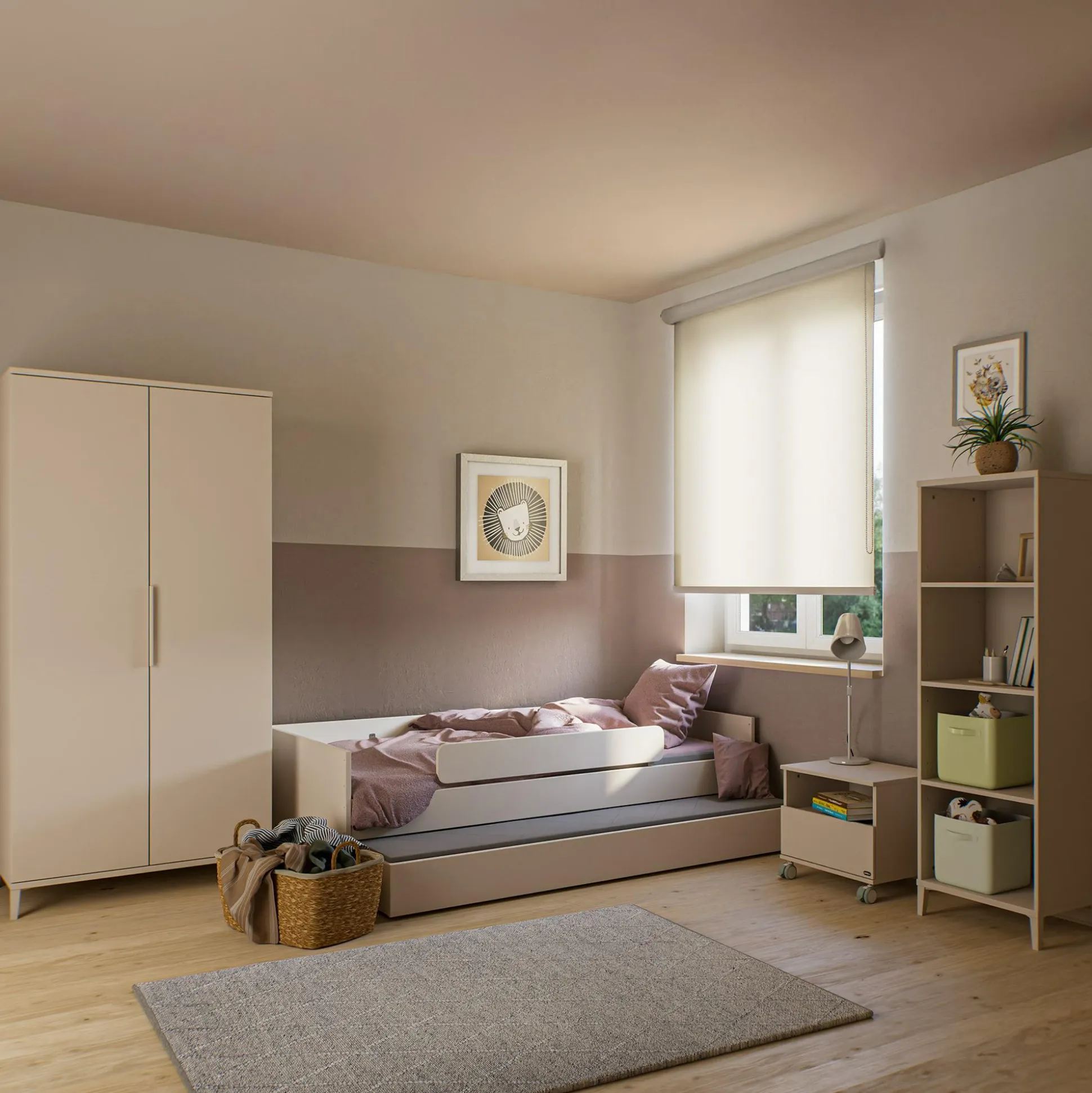 Und unter dem Kinderbett findest du viel Stauraum. Hier verstecken sich Lieblingsbücher, Puppenkleider, Bauklötze oder die Schätze des letzten Abenteuers, sicher und ordentlich verstaut. Wie eine geheime Schatzkammer wartet der Platz unter dem Bett nur darauf, entdeckt zu werden – perfekt für kleine Ordnungshüter und große Träumer, die gern in ihrem eigenen Reich auf Schatzsuche gehen.