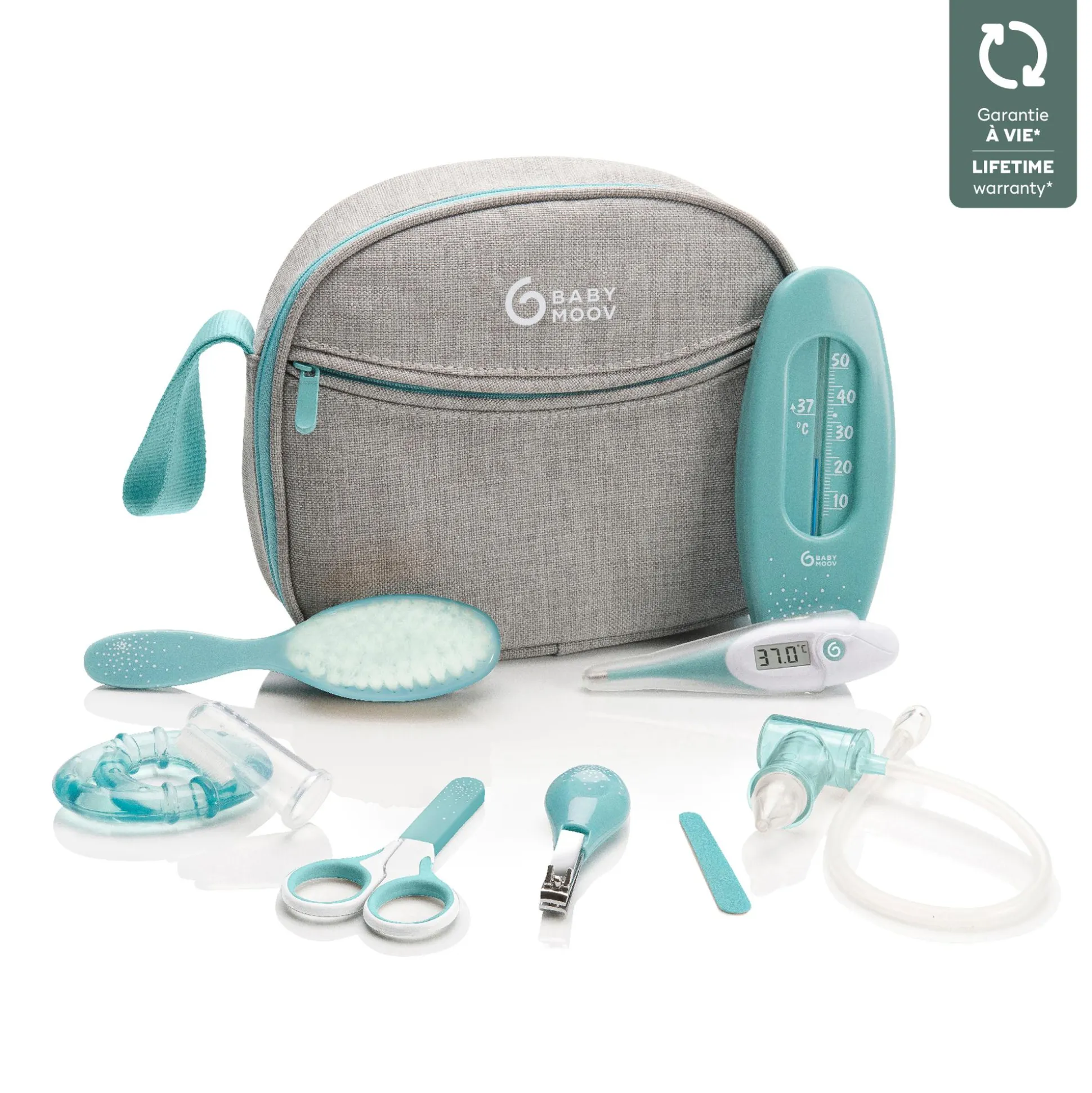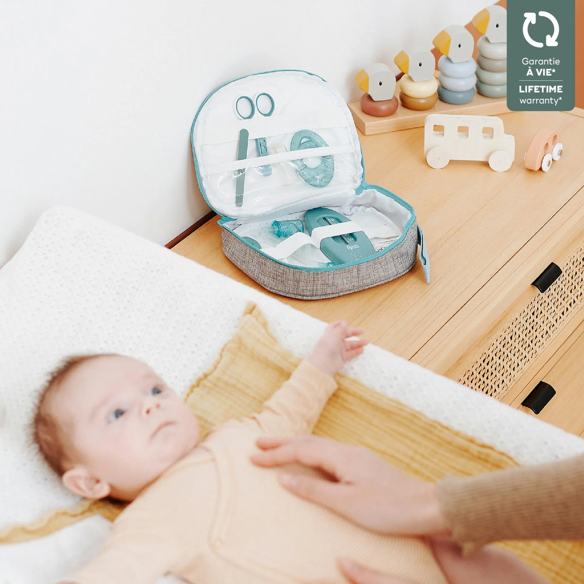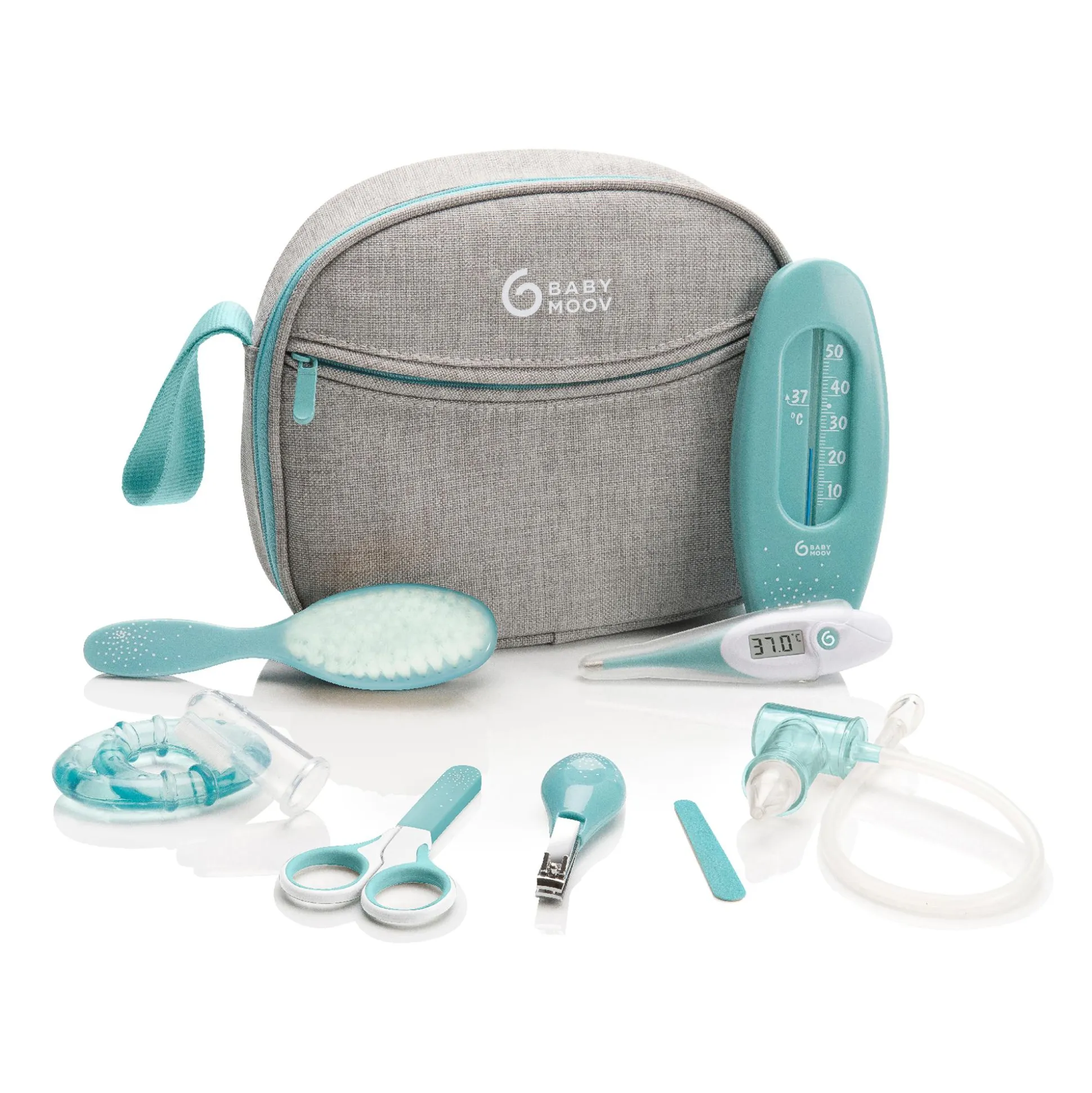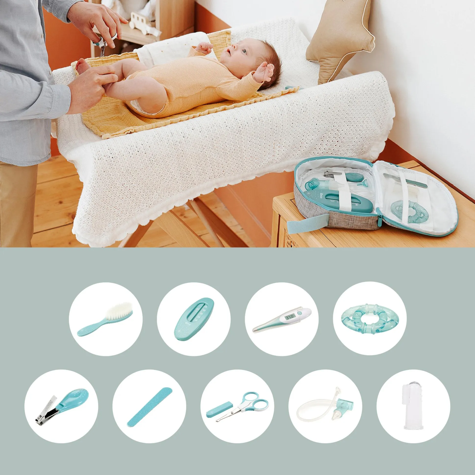 Das Pflegeset in der praktischen Kulturtasche ist der optimale Begleiter für Zuhause und auf Reisen. Die Tasche enthält die wichtigsten Babypflegeprodukte, wie zum Beispiel eine Schere mit abgerundeten Kanten, Badethermometer, kühlbarer Beißring und ein Digitalthermometer mit flexibler Spitze. Sie ist praktisch in zwei Fächer aufgeteilt, ein Fach für Zubehör und ein Fach für Pflegeprodukte.