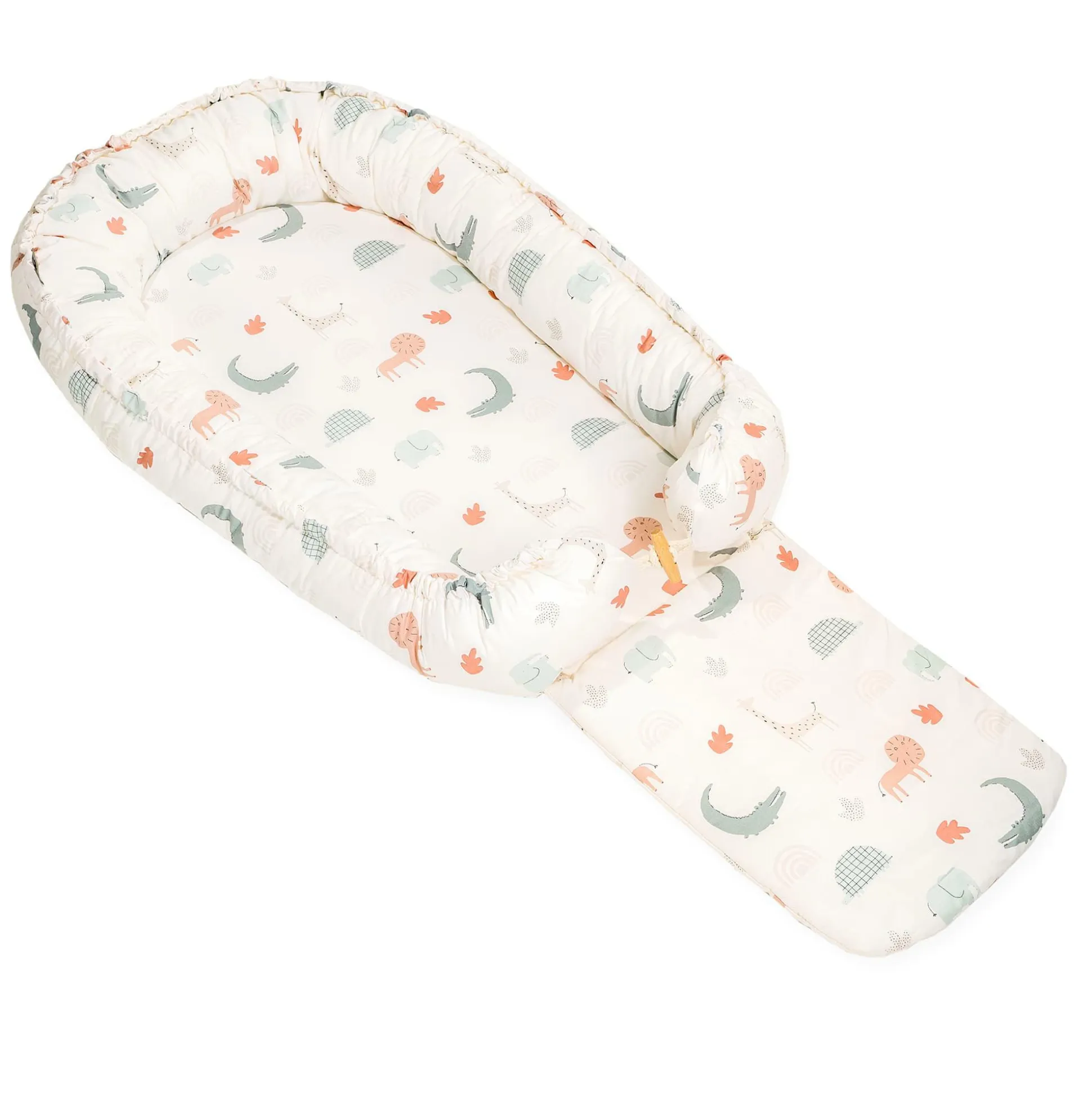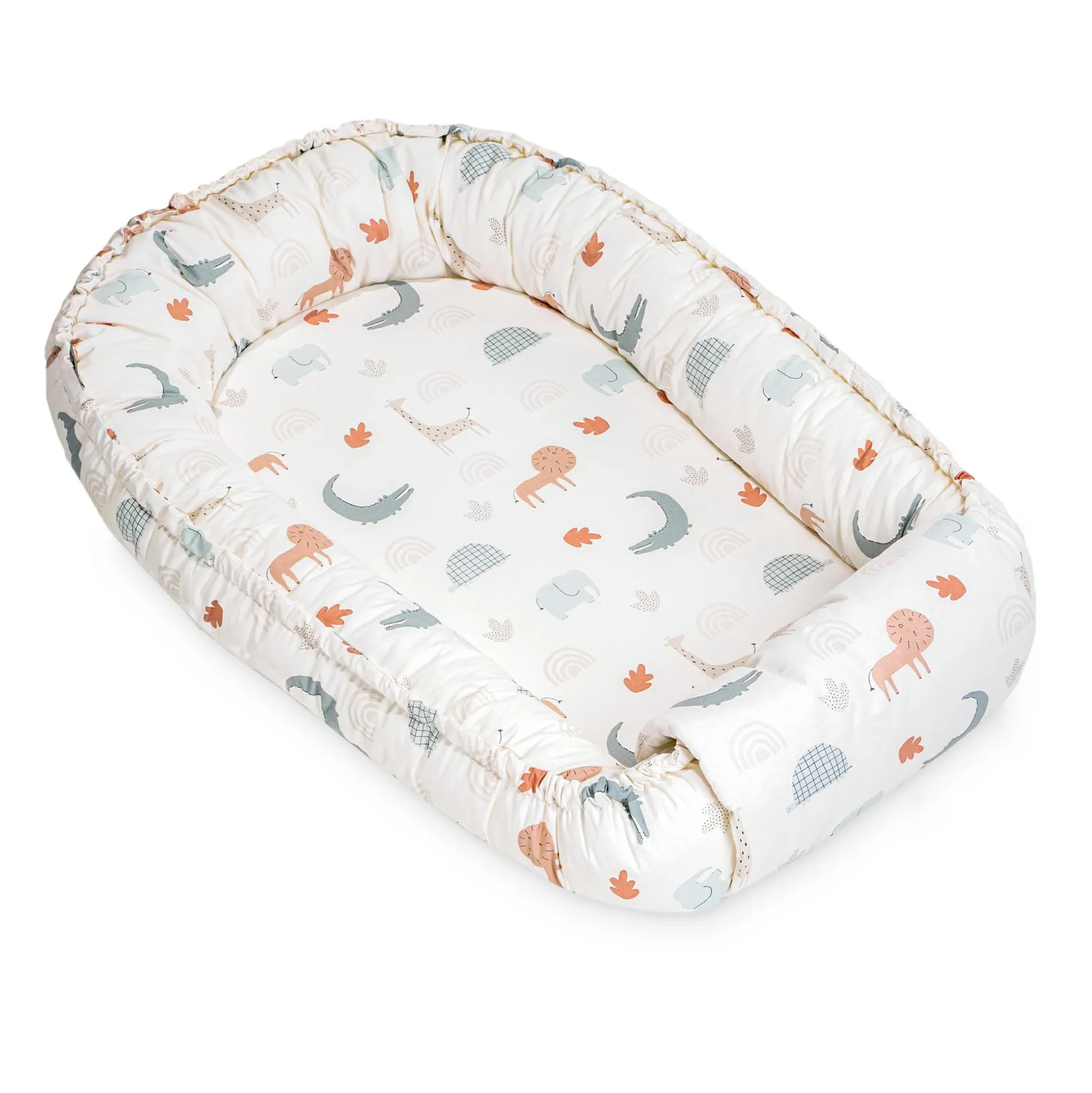 Das Kuschelnest NIDO MAX Wild Friends verleiht deinem kleinen Nachwuchs Sicherheit und Geborgenheit. Durch die unten angebrachte Verlängerung, die durch das Öffnen eines Knopfes ausgefaltet werden kann, lässt sich das Nestchen besonders lange nutzen.Das weiche Außenmaterial aus 100% Bio-Baumwolle sowie die Polyestervlies-Füllung sorgen für kuschelige Momente. Dabei sind alle Materialien nach Oeko-Tex Standard 100 schadstoffgeprüft und besonders unbedenklich.