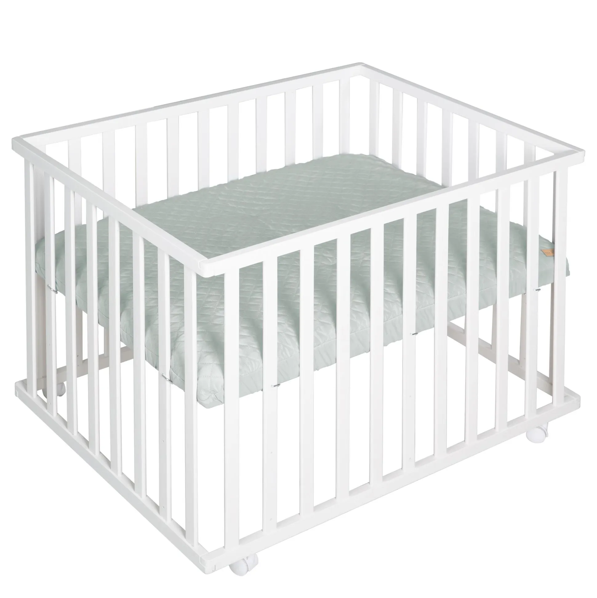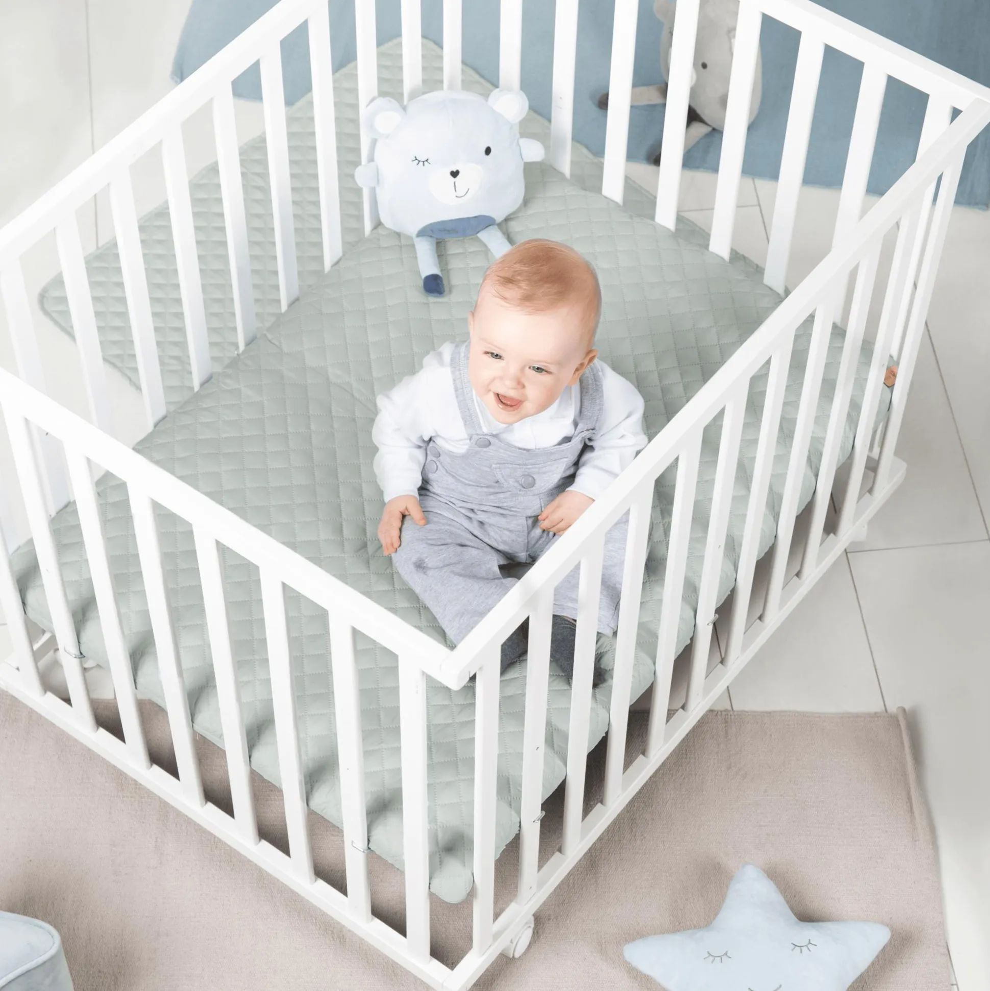 Das roba Laufgitter ‚roba Style‘ in der Farbe Weiß bietet eine kindgerechte und stabile Spiel- und Kuschelfläche von 75 x 100 cm und ist mit einer weich gepolsterten, gesteppten grünen Stoffeinlage ausgestattet.