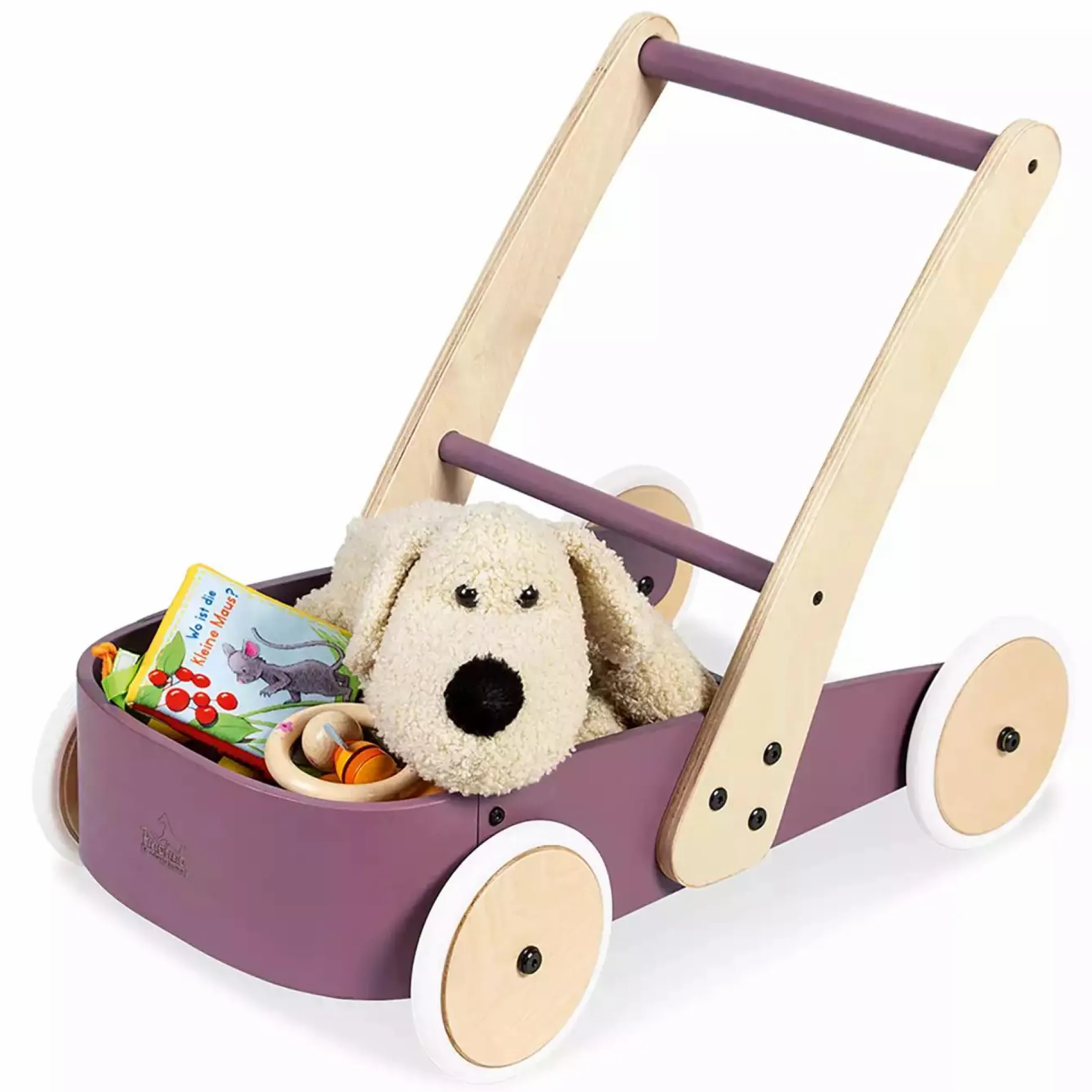 Der Pinolino Fiete, inkl. Bremssystem, gummierten Holzrädern und Stahlachsen, besteht aus massiver Buche und ist brombeer sowie klar lackiert.