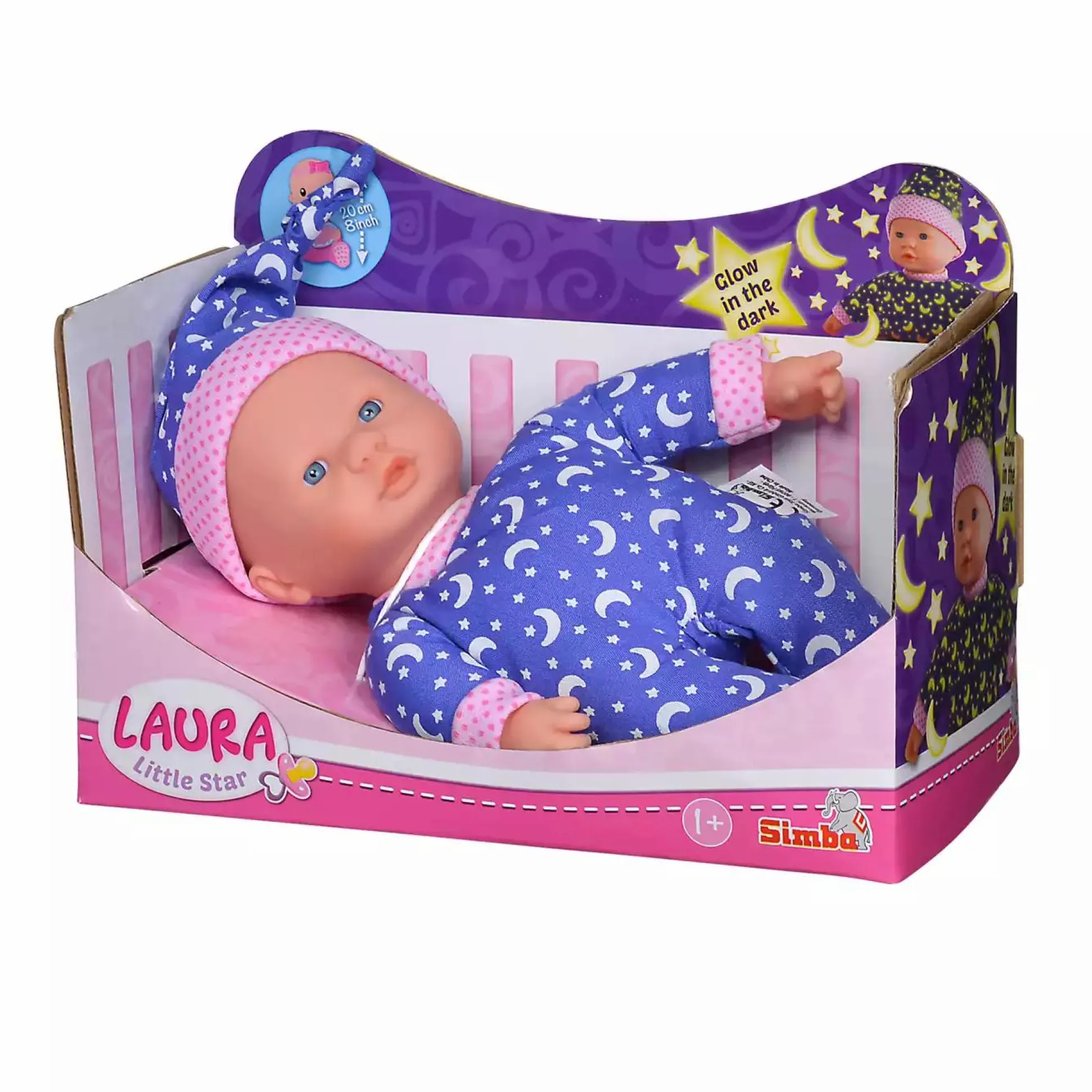 Die niedliche kleine Weichkörperpuppe Laura Kleiner Stern von Simba ist eine tolle Begleiterin für deinen kleinen Schatz ab ca. einem Jahr – bei Nacht im Kinderbettchen sowie bei Tag wenn du mit deinem Kind unterwegs bist. Die ca. 20 cm große Puppe trägt einen süßen Strampler und ein Mützchen im tollen Sternen-Design. Die zahlreichen „Glow in the Dark“-Elemente auf der Kleidung können Licht speichern und leuchten deshalb im Dunkeln noch für einige Zeit nach.