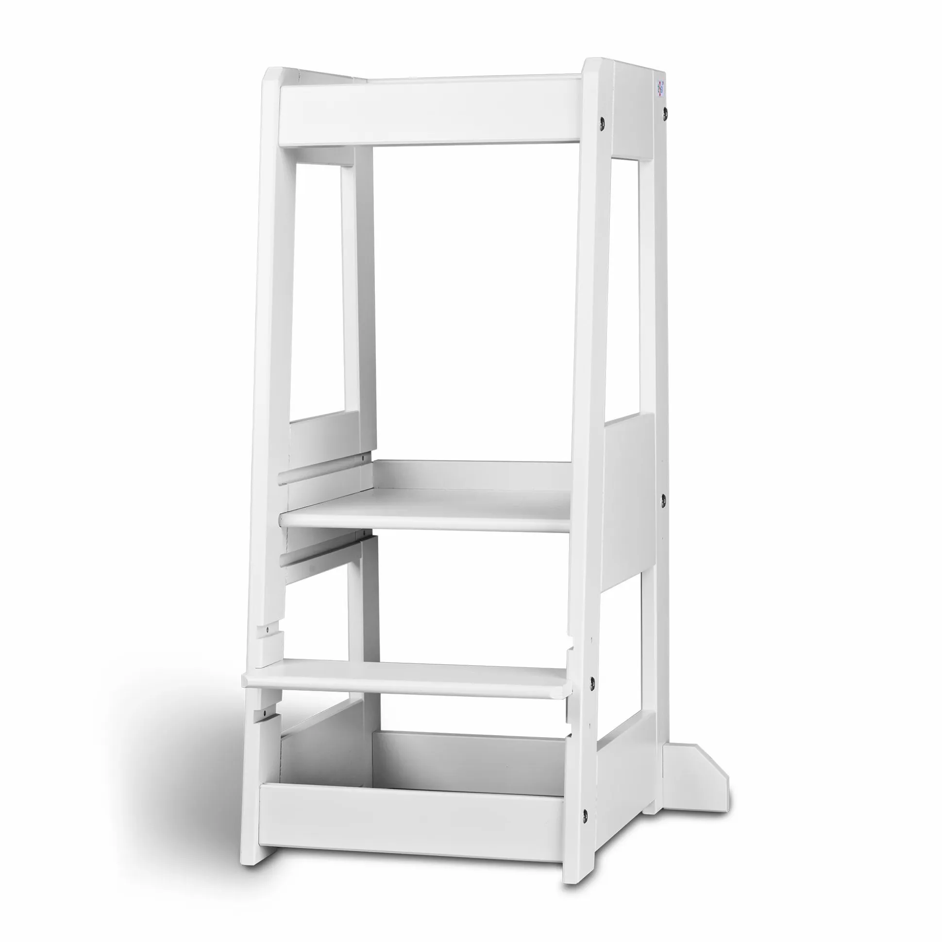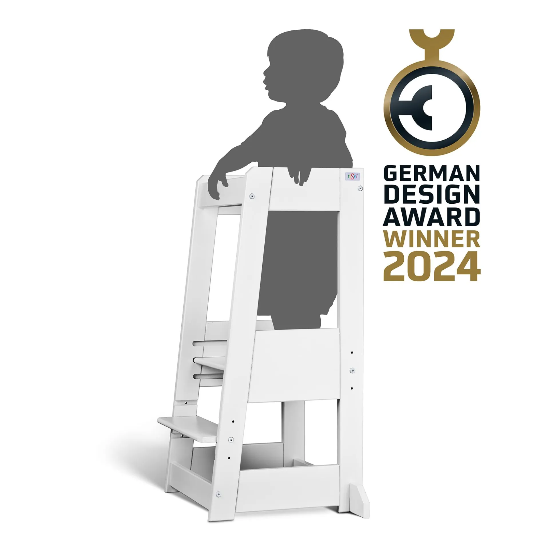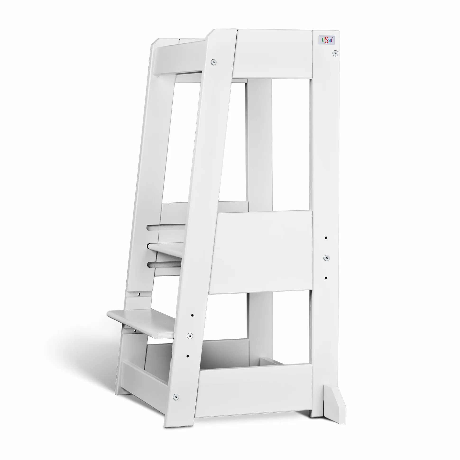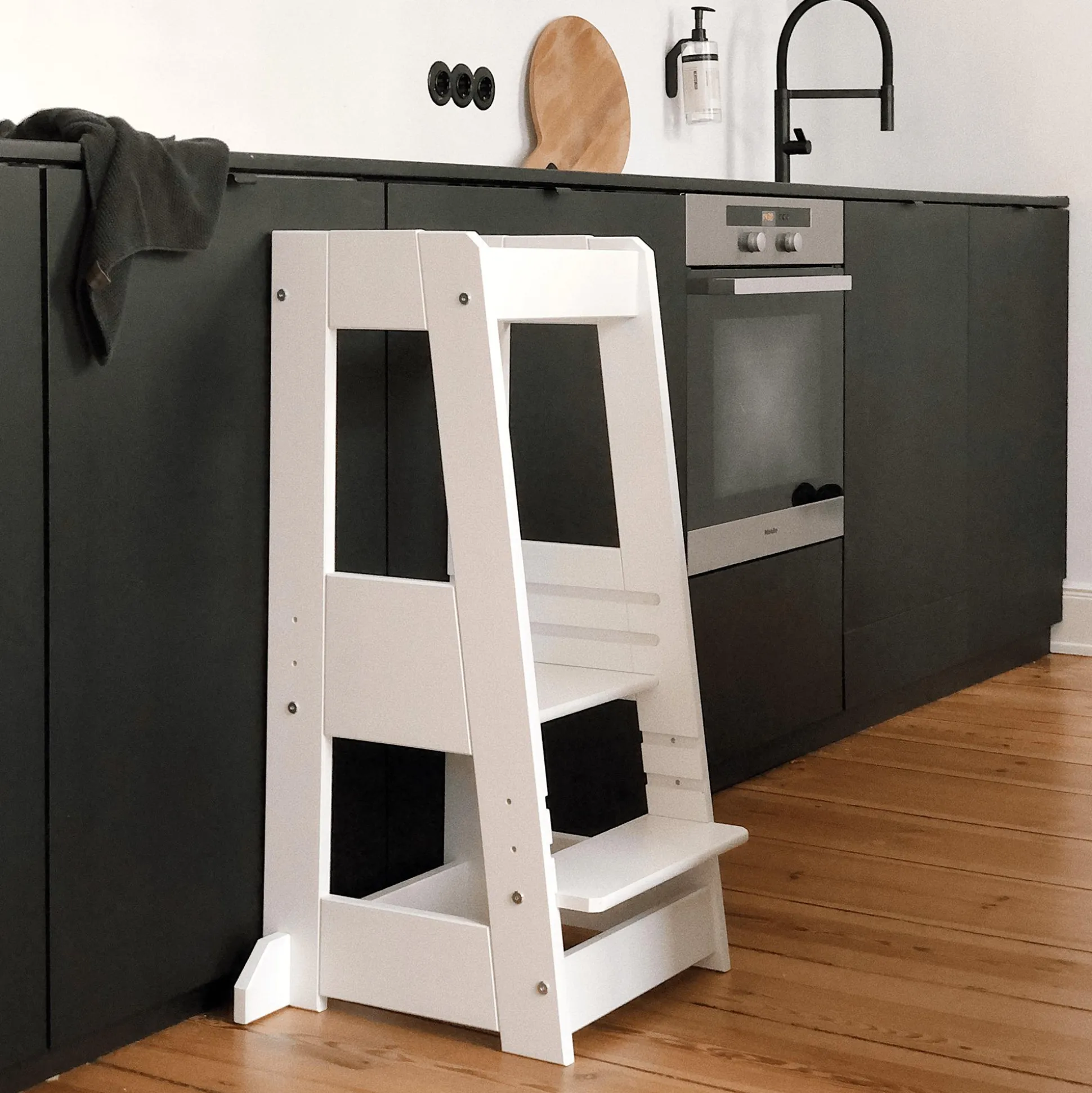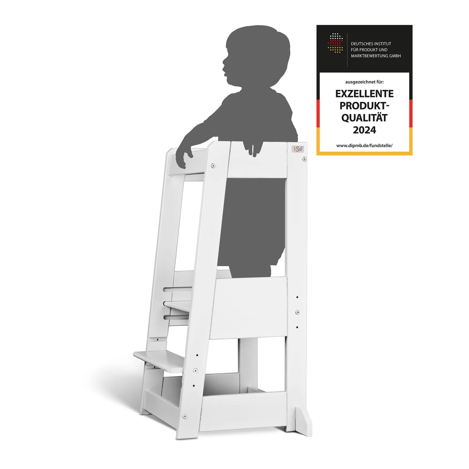 Der Lernturm Felix von tiSsi® ist ein spannender Entdecker-Turm, der mit deinem Kind mitwächst. So können schon die Kleinsten auf Augenhöhe mit an der Küchenarbeitsplatte stehen und beim Kochen helfen. Dank dem höhenverstellbaren Stand- und Fußbrett kannst du den Turm mit wenigen Handgriffen ganz einfach an die Größe deines Kindes anpassen. Der ist einfach montierbar, extrem kippsicher zu allen Seiten und besonders ergonomisch entwickelt. Er bietet Kindern von ca. 1 – 4 Jahren angemessene Bewegungsfreiheit und ist mit einer Tragfähigkeit von bis zu 250 kg der perfekte Begleiter bis ins Jugendalter.