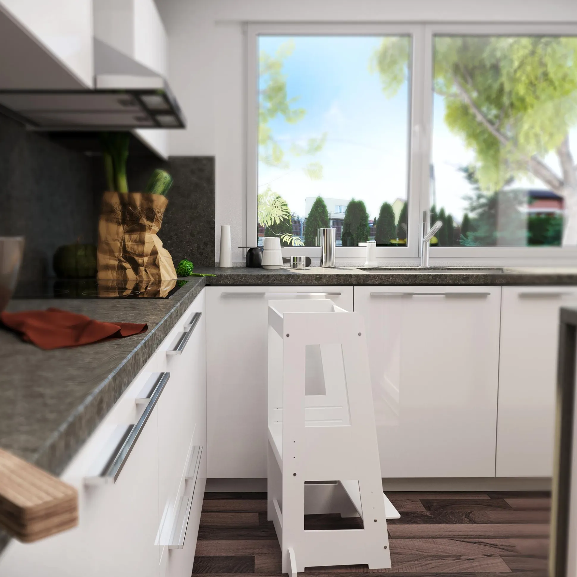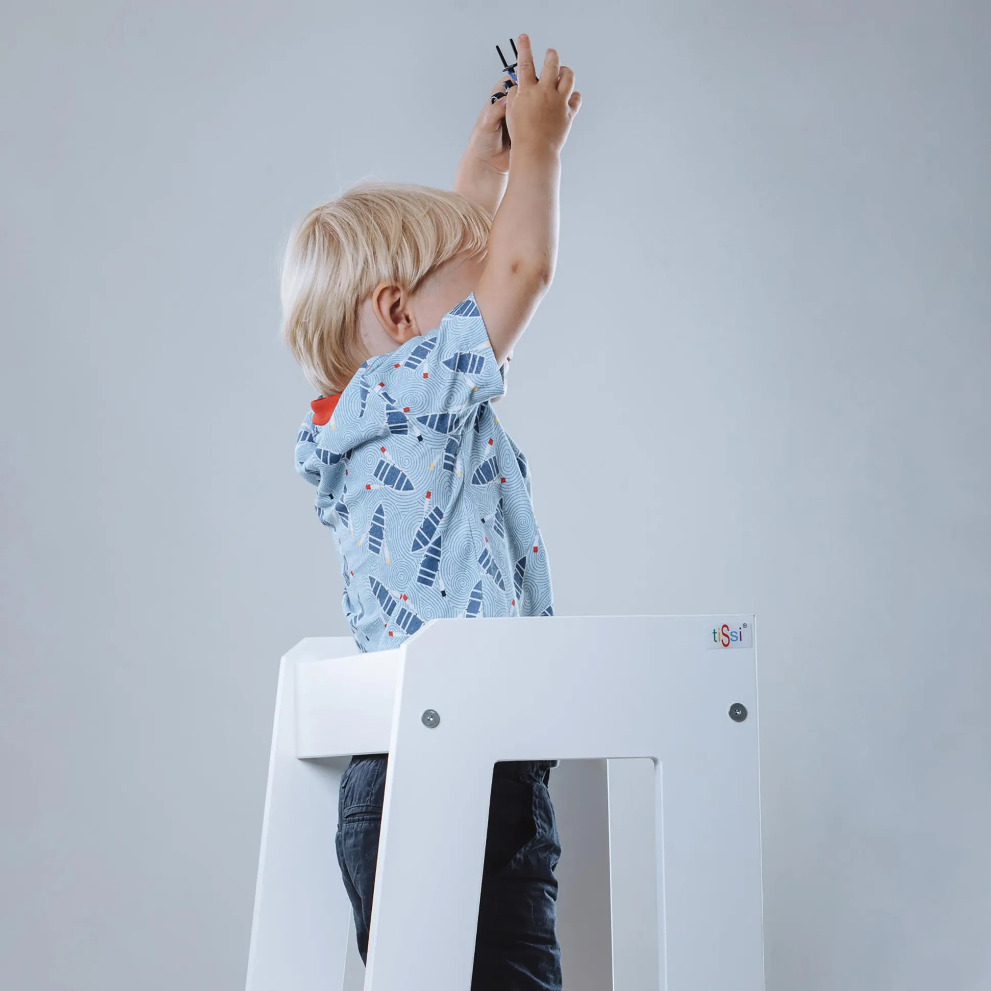 Der Entdeckerturm von tiSsi® hebt dein Kind auf die optimale Position an. Dieser wurde so konzipiert, dass dein Kind näher beim Arbeiten in der Küche oder am Tisch dabei sein kann und so schon früh soziale Interaktionen mitbekommt und von dir lernen kann. Wenn dein Kind dir beim Kochen hilft, kann es eine noch engere Bindung aufbauen sowie bessere sprachliche und soziale Fähigkeiten entwickeln.