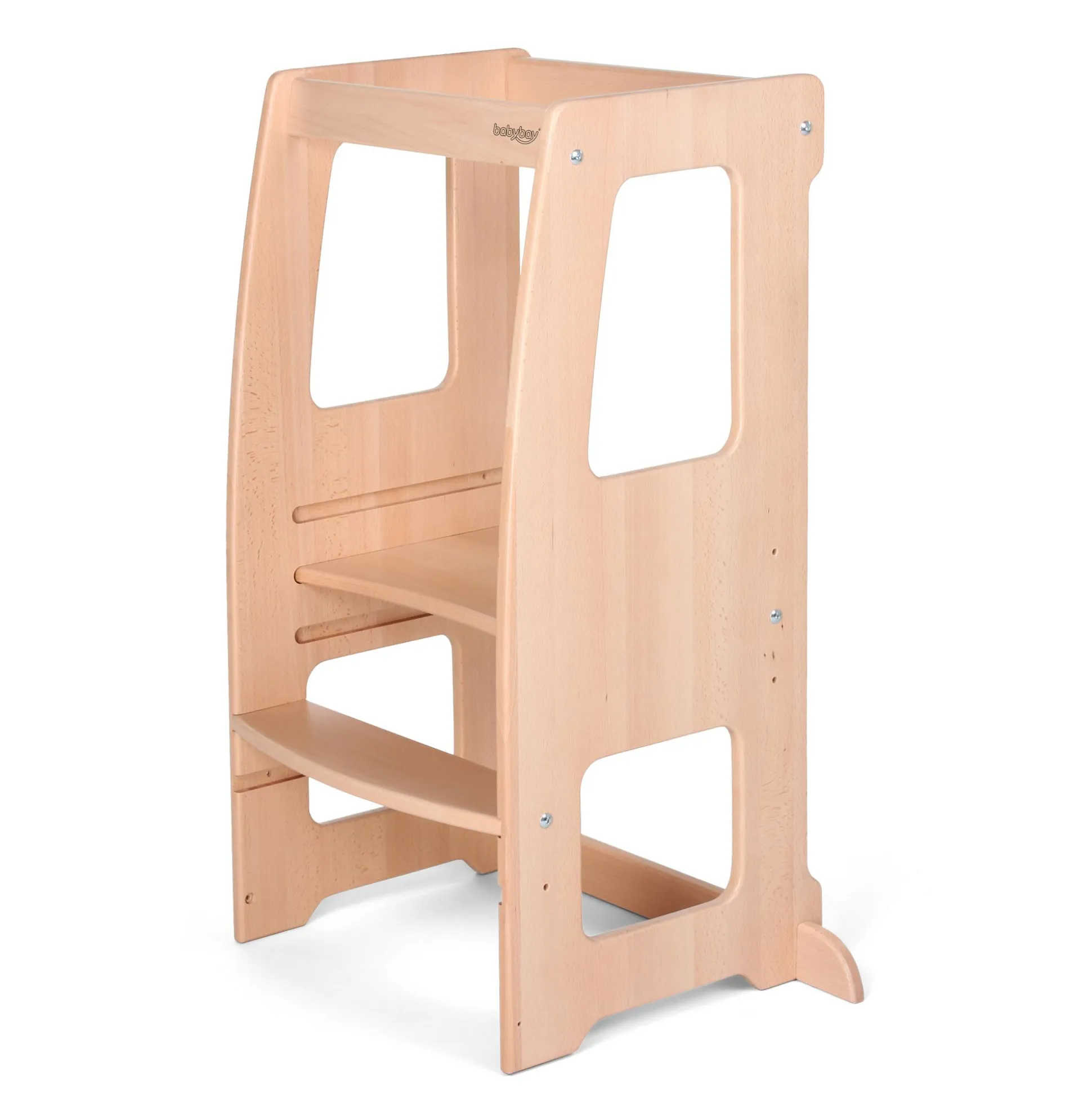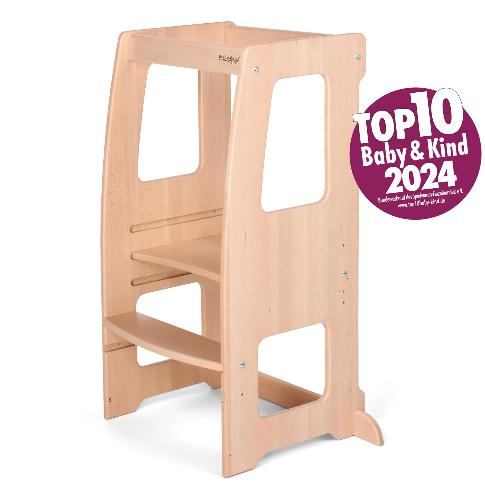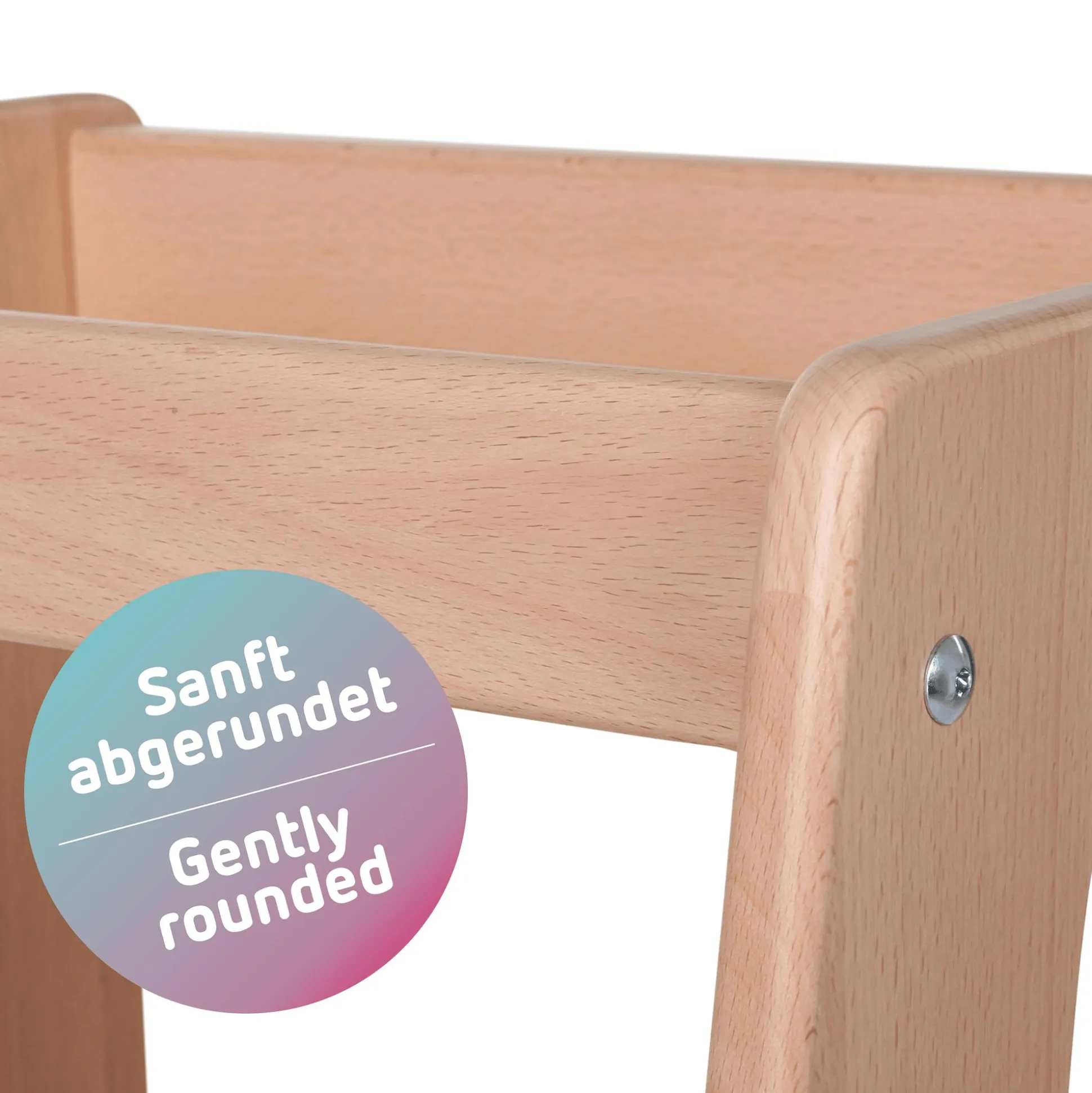 Und wenn wir schon beim Thema „Sicherheit“ sind: Die abgerundete Platte ermöglicht einen bequemen und sicheren Einstieg, fördert die Selbstständigkeit und lädt dein Kind ein, die Welt auf Augenhöhe zu erleben. Dabei sorgen die sanft abgerundeten Kanten für zusätzlichen Schutz, während eine spezielle Aussparung für Küchengriffe ein sicheres Lernen und Spielen ermöglicht.
