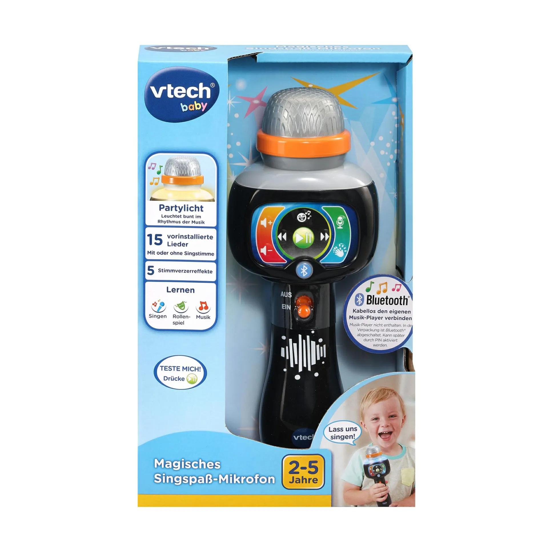 Bühne frei – das magische Singspaß-Mikrofon von vtech verwandelt jedes Kinderzimmer in eine funkelnde Mini-Bühne: Sobald das leuchtende, interaktive Mikrofon eingeschaltet wird, beginnt der bunte LED-Ring im Rhythmus der Musik zu tanzen und lädt kleine Stars zum Mitsingen ein. Kinder können 15 fröhliche, vorinstallierte Lieder auswählen und – dank Karaoke-Taste – sogar nur zur Melodie singen, während ihr eigener Gesang klar wiedergegeben wird.