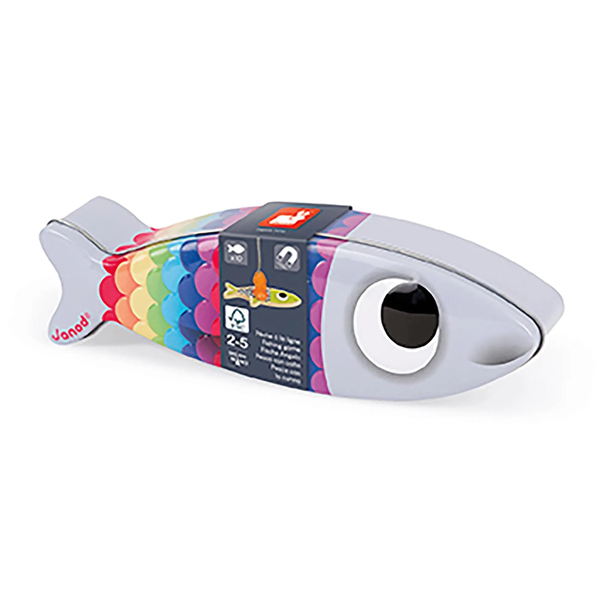 Mit dem Magnet-Angelspiel von Janod kommt sicher keine Langeweile auf! Mithilfe der magnetischen Rute kann dein kleiner Schatz versuchen, die zehn bunten Fische zu angeln. Sie sind mit Thermotransfer-Verfahren auf einer Seite bedruckt und auf beiden Seiten mit Nietnägeln versehen, die sich nicht lösen können. Dank einer zweiten mitgelieferten Angelrute kann das Spiel auch zu Zweit gespielt werden. Auch als Geschenk eignet es sich perfekt, denn das Spiel wird in einer hübschen Geschenk-Box in Form einer Sardine mit hervorgehobenen Stellen geliefert.