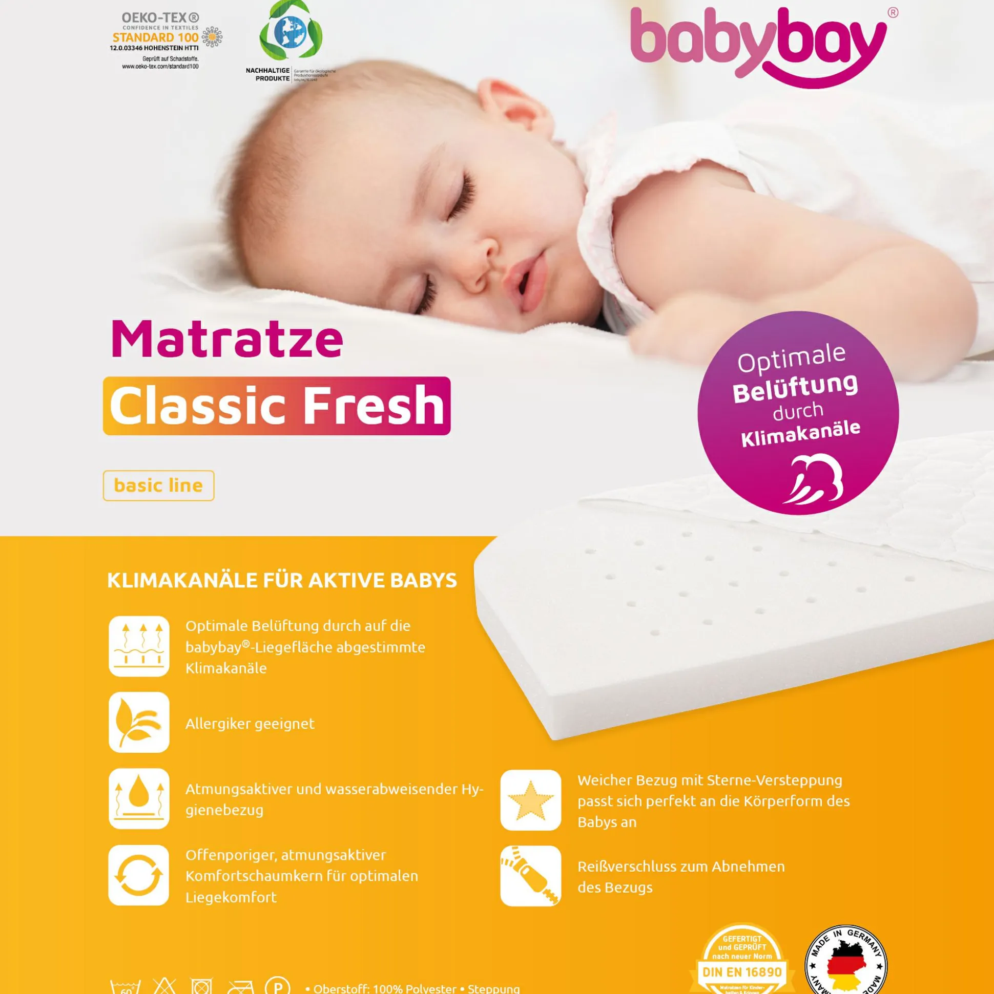 Die Matratze babybay® Classic Fresh ist passend für die babybay Modelle Maxi, Boxspring sowie Comfort Plus und sorgt mit den exakt auf die Lüftungsschlitze der babybay®-Liegefläche abgestimmten vertikalen Klimakanälen im Komfortschaumstoffkern für eine hohe Luftzirkulation. Die optimale Sauerstoffzufuhr beugt einem Wärmestau vor und bietet so einen zuverlässigen und hygienischen Schutz vor Nässe und Feuchtigkeit. Der Komfortschaumstoffkern passt sich durch die aufwendige, weiche Versteppung des atmungsaktiven Bezuges im Sterne-Design ideal der Körperform deines kleinen Lieblings an, wirkt stützend und sorgt so für einen tiefen, langen, erholsamen und traumhaften Babyschlaf. So fühlt sich dein Kind rundum wohl.