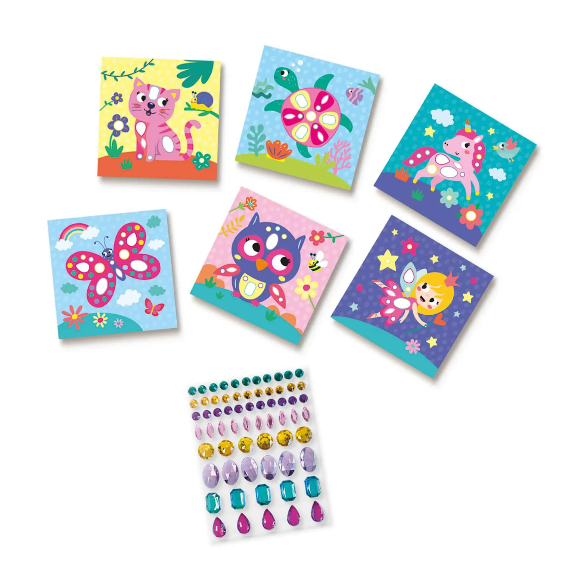 - mit 6 Motivkarten (mit z.B. einem Einhorn, Kätzchen oder Eule)