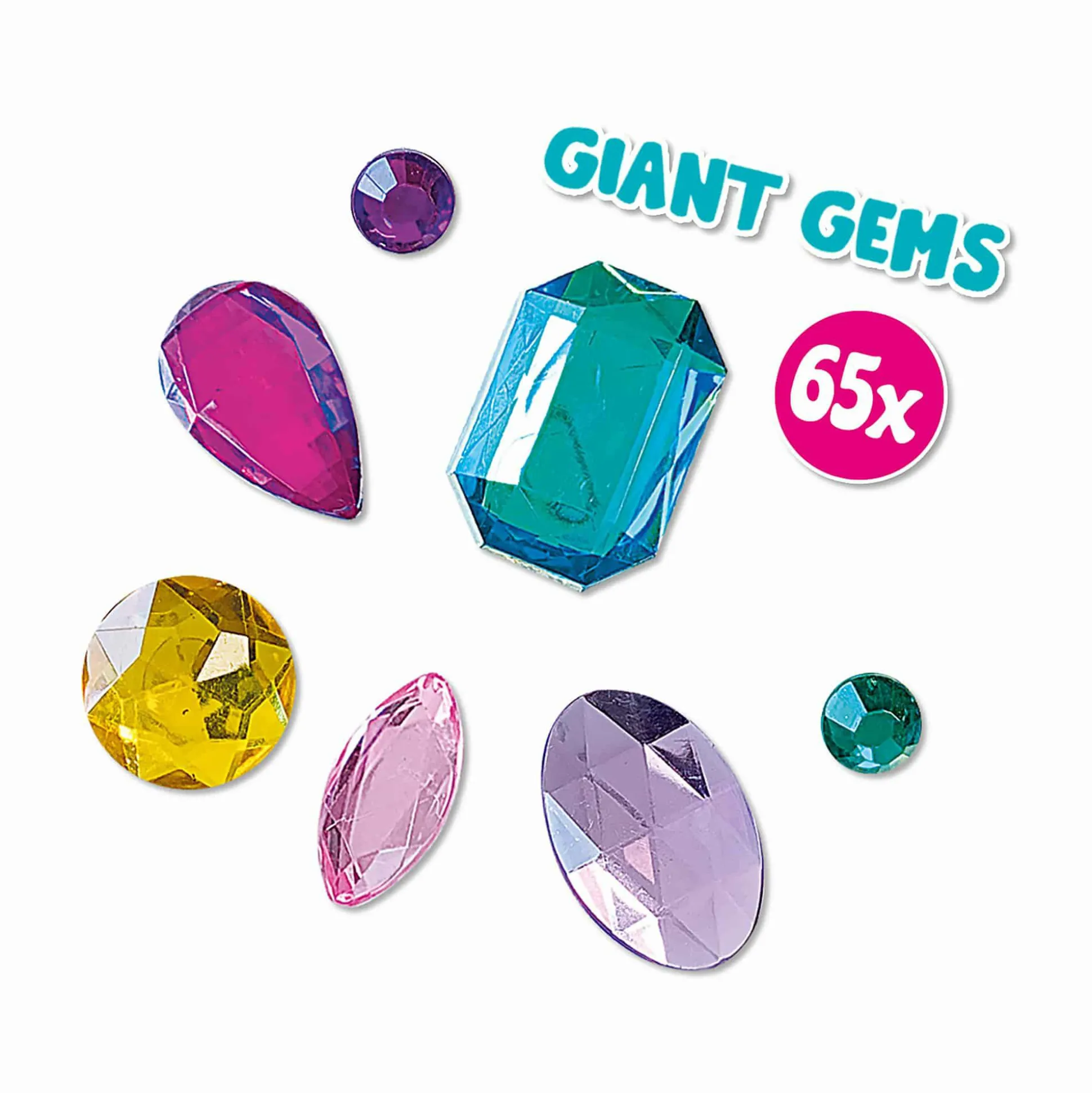 - 65 selbstklebende Edelsteinaufkleber in den Farben Türkis, Gelb, Lila, Rosa und Pink