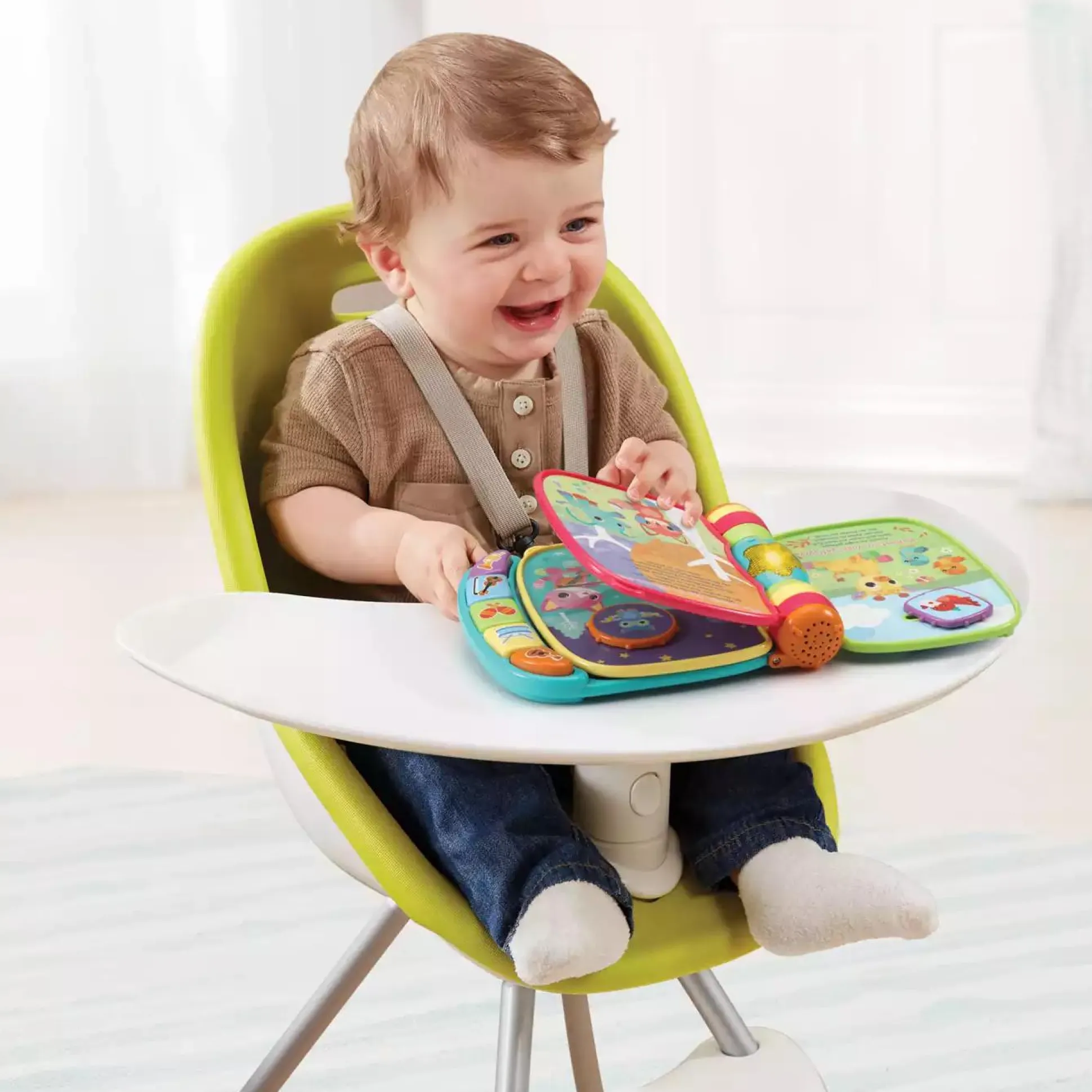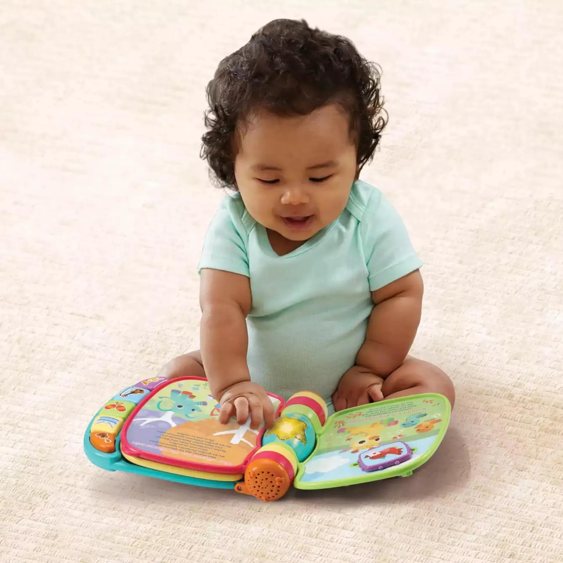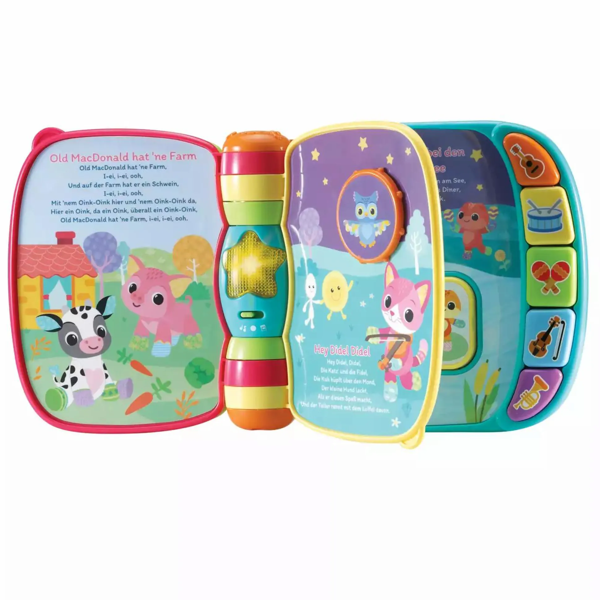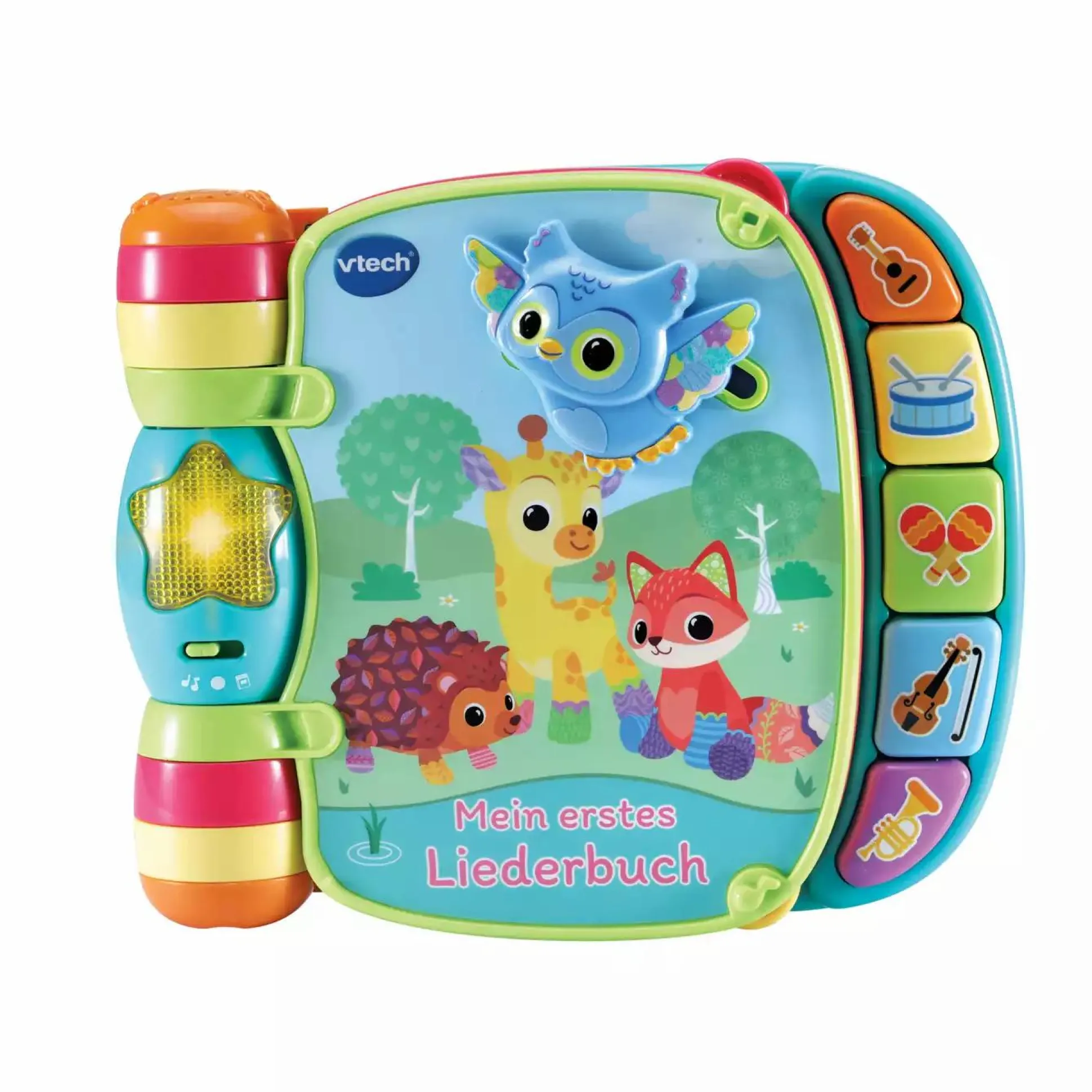 Mein erstes Liederbuch von Vtech lädt deinen kleinen Schatz zum Mitsingen und Entdecken ein. Auf sieben liebevoll gestalteten Buchseiten können bekannte Kinderlieder und Melodien entdeckt werden. Bewegliche Spielelemente wie die niedliche Eule lassen sich drehen und schieben. Die fünf bunten Instrument-Tasten spielen Klaviernoten und benennen Farben sowie Instrumente.