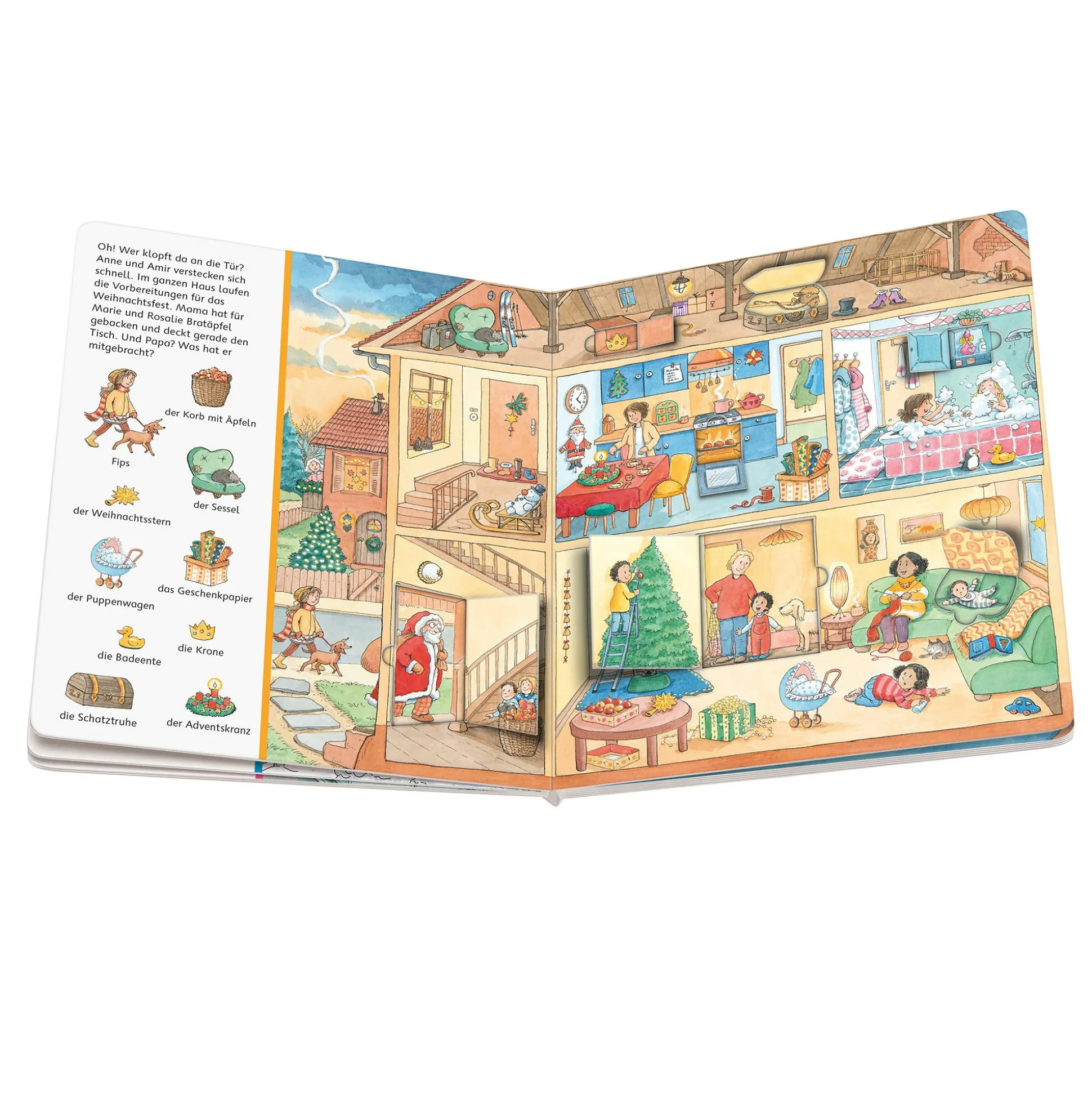 Das Mein Sachen suchen Wimmelbuch: Weihnachtszeit vom Ravensburger Verlag ist ein bezauberndes Pappbilderbuch aus der beliebten Reihe „Mein Sachen suchen Wimmelbuch“, das Kinder ab ca. 2 bis 4 Jahren auf eine festliche Entdeckungsreise mitnimmt. Auf 16 liebevoll gestalteten Seiten können die kleinen Leser in der bunten Weihnachtswelt spannende Dinge beobachten und suchen, was die Vorfreude auf die Adventszeit spielerisch weckt.