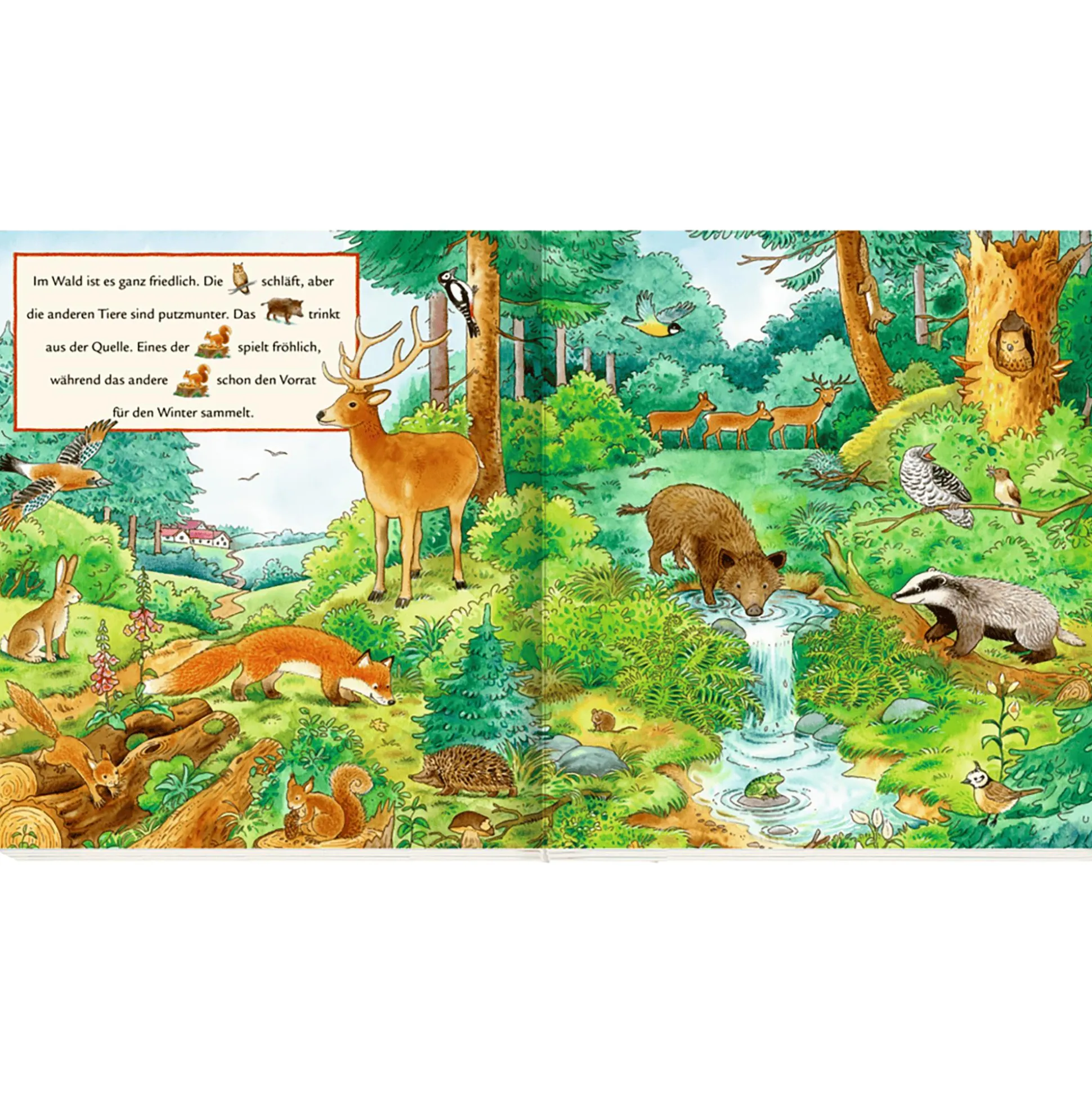 Der kleine Welpe tobt über die Wiese. Der Flamingo steht auf einem Bein. Das Eichhörnchen sammelt schon den Vorrat für den Winter. Aber was macht das Nashorn? Hier gibt es einiges zu entdecken! Ganzseitige Wimmelbilder und einfache Mitlesegeschichten laden schon die Kleinsten zum Suchen und Mitsprechen ein. Erkennen – benennen – immer wieder Anschauen!